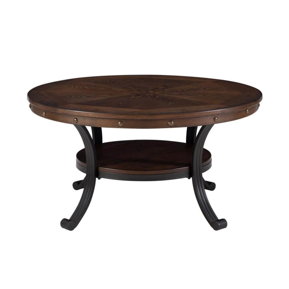 Mixing metal with wood, the transitional Franklin Cocktail Table provides a unique addition to your home. The round table features an oak woodgrain veneer with nail heads along the apron. The sturdy metal base is made of curved legs and includes a small circular shelf. Some assembly required.