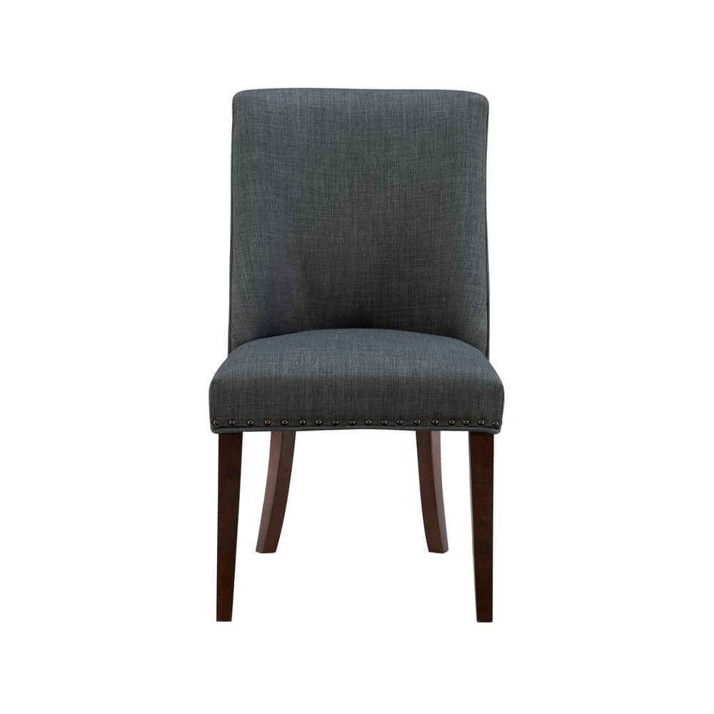 Add elegance to your meals with this Alessio Grey Linen Like Polyester Upholstered Dining Chair (Set of 2) . Upholstered in dark grey linen like polyester, it features lovely antiqued bronze nailhead trim. The padded seat offers perfect comfort while being easy to clean. An arc shaped backrest adds to the comfort and pleasing design and solid wood legs, finished in dark espresso, provide stability for hours on end. For a flawless finishing touch, you’ll find a decorative chair back ring pull.