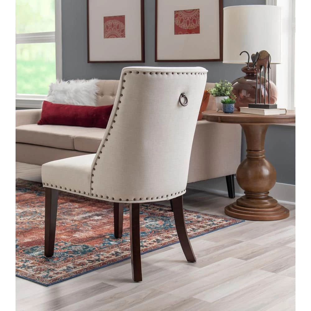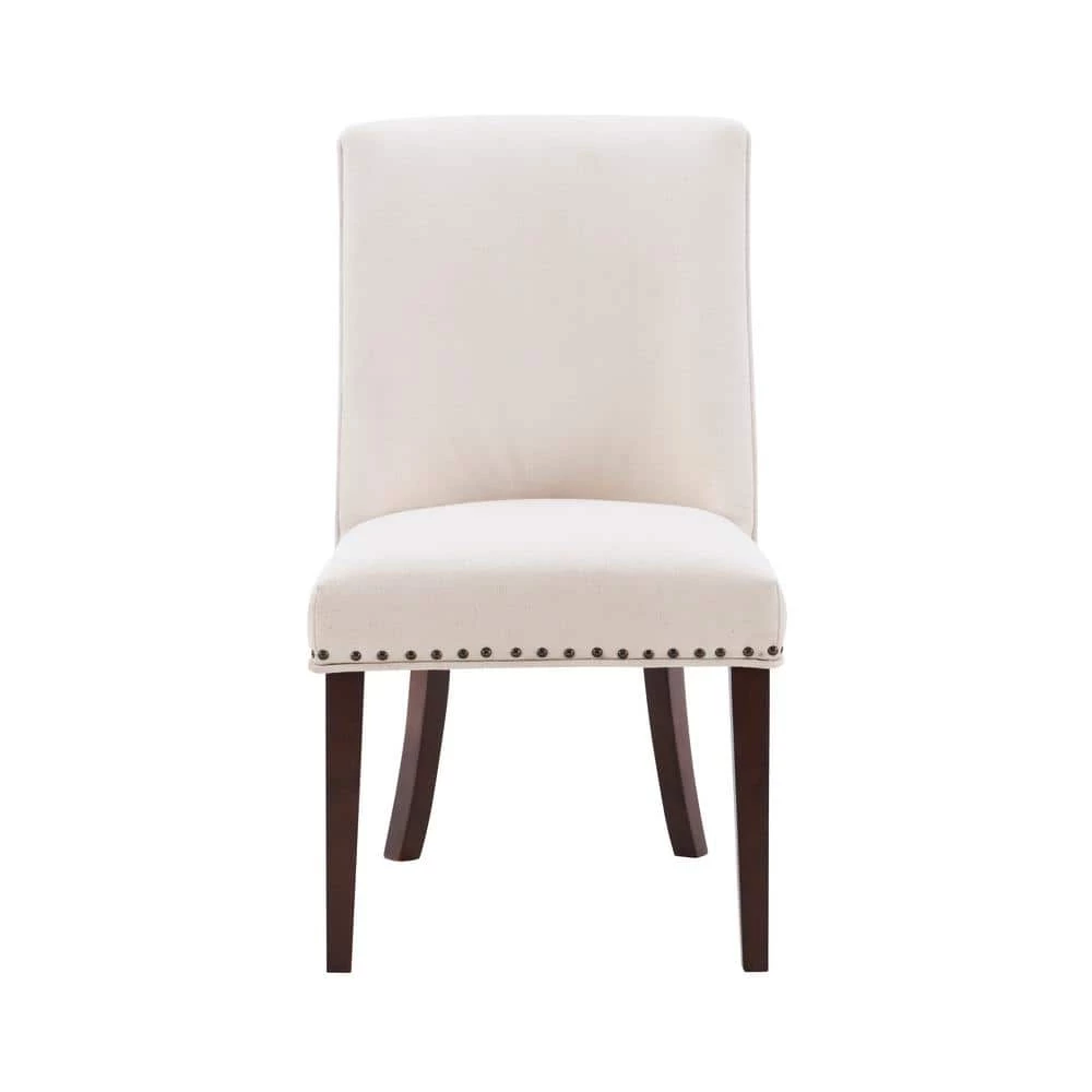 Add elegance to your meals with this Alessio Natural Linen Like Polyester Upholstered Dining Chair and Espresso Legs (Set of 2) . Upholstered in a natural colored linen like polyester, it features lovely antiqued bronze nailhead trim. The padded seat offers perfect comfort while being easy to clean. An arc shaped backrest adds to the comfort and pleasing design and solid wood legs, finished in dark espresso, provide stability for hours on end. For a flawless finishing touch, you’ll find a decorative chair back ring pull.