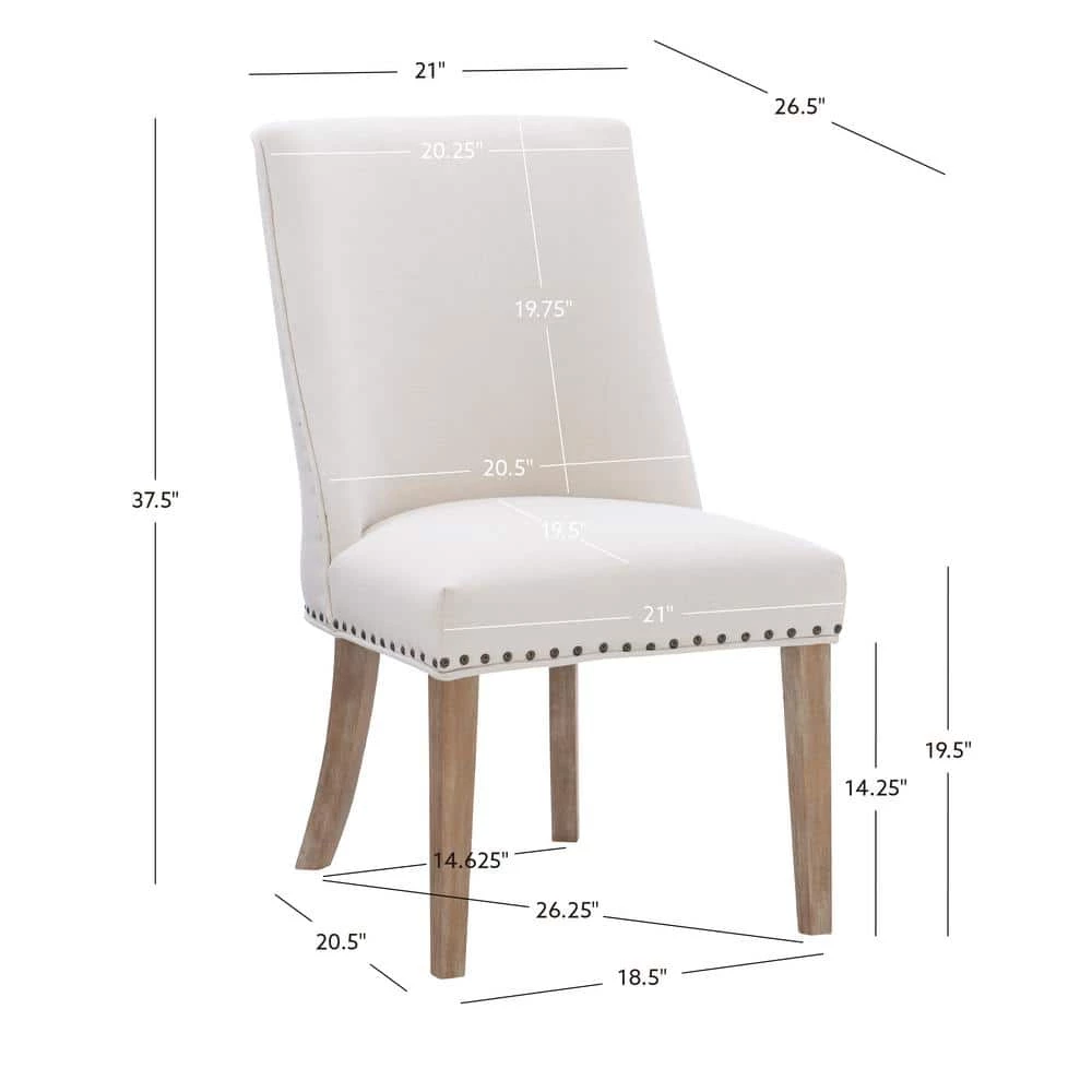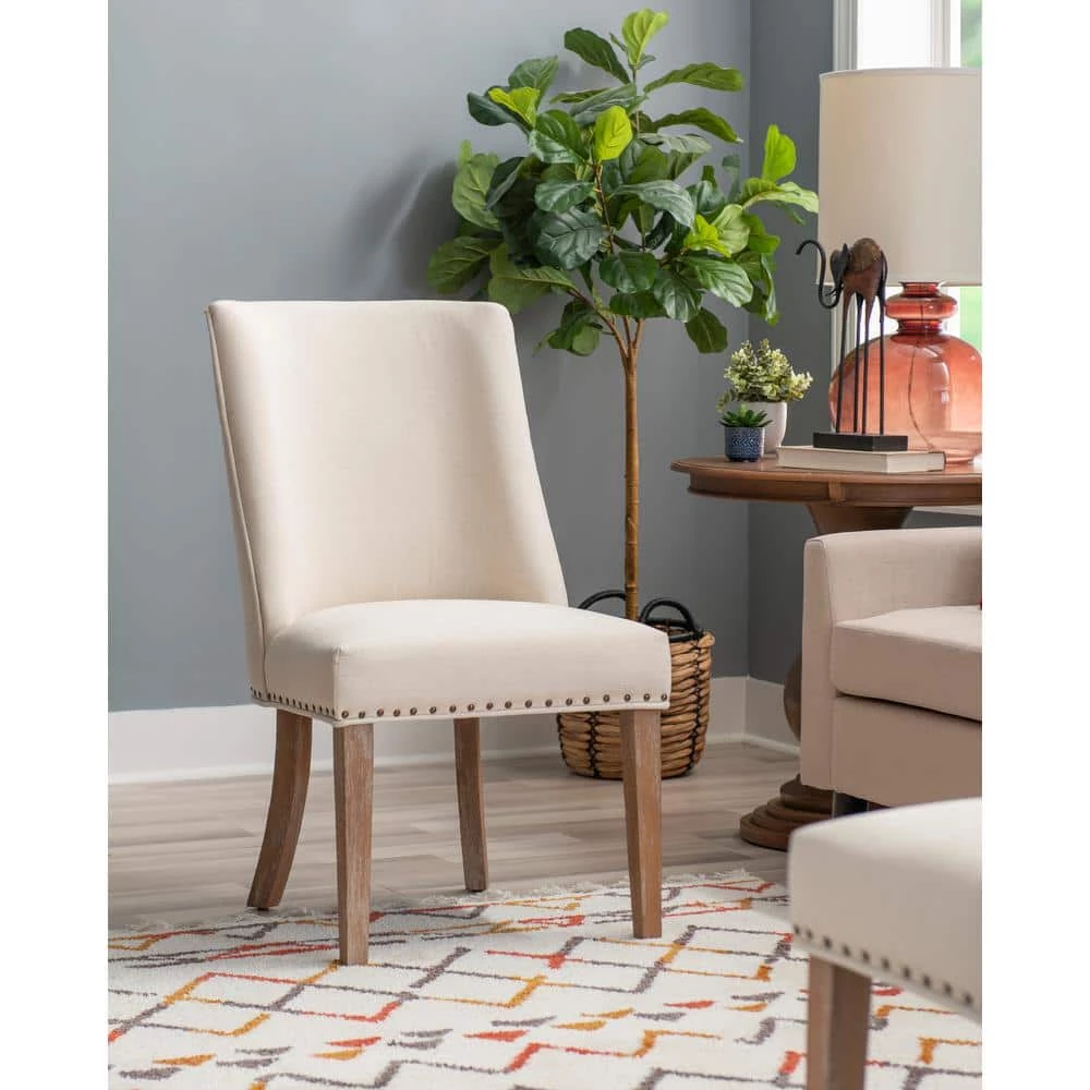 Add elegance to your meals with this Alessio Natural Linen Like Polyester Upholstered Dining Chair and Natural Legs(Set of 2) . Upholstered in a natural colored linen like polyester, it features lovely antiqued bronze nailhead trim. The padded seat offers perfect comfort while being easy to clean. An arc shaped backrest adds to the comfort and pleasing design and solid wood legs, finished in rustic natural, provide stability for hours on end. For a flawless finishing touch, you’ll find a decorative chair back ring pull.