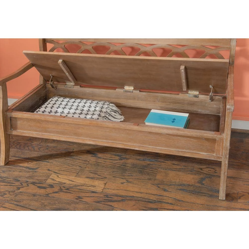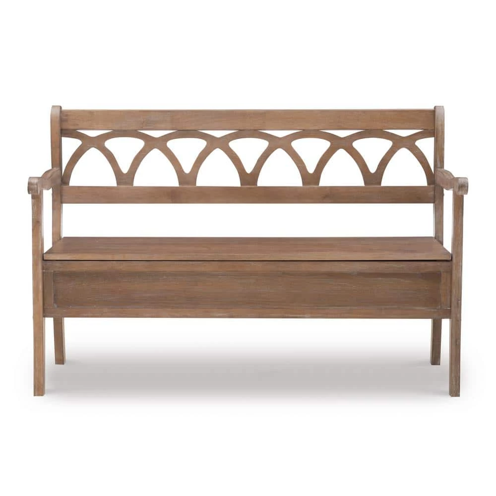 The Alonzo Natural Storage Bench adds a stylish touch to your home. The 48″ lift top storage bench opens to deep storage for organization. Safety is a priority with child safe hinges and breathe holes along the back panel. The exquisite finish of natural driftwood adds classic charm, while the slightly curved arms accentuate the back decorative arched fretwork. With a comfortable wood panel seat and sturdy construction, the bench will be the perfect addition to your entryway, living or family room, or anywhere else you desire a little extra seating with a little extra style.