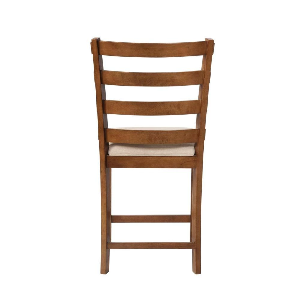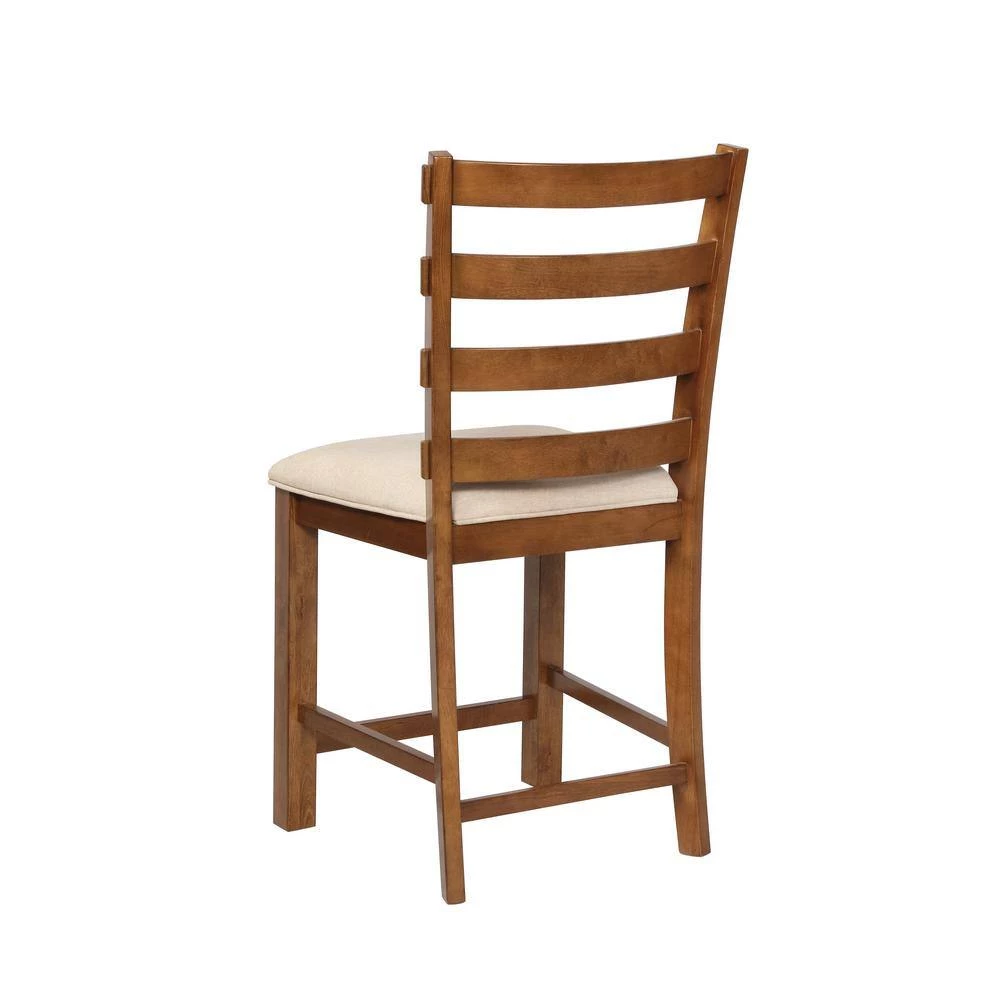 The Bennett Counter Stool is warm and inviting, and makes a perfect addition to your kitchen or dining room. The ladder back slats carry through the sides to give the barstool a modern farmhouse feel. Substantial square legs and footrest offer support, and the stool features a high, contoured back for added comfort. The generous, plush upholstered seat in a neutral fabric complements the chestnut finish. Some assembly required.