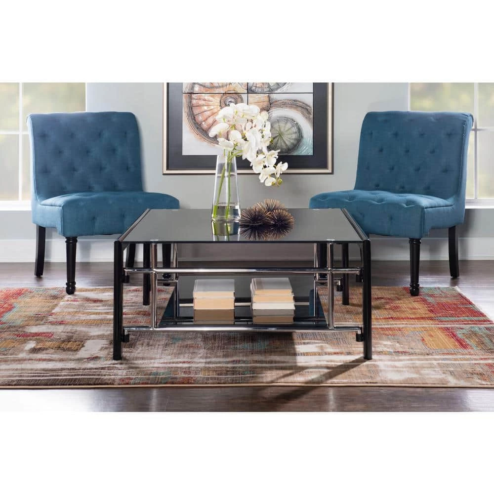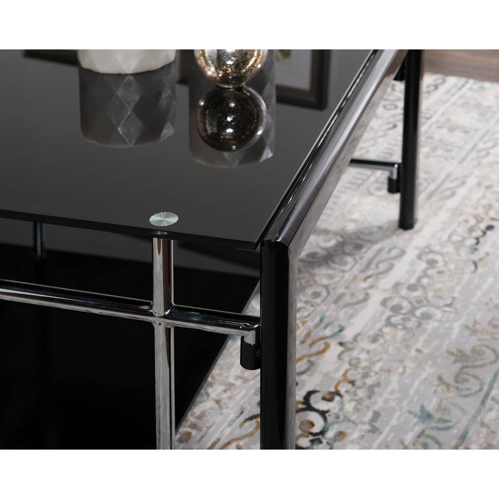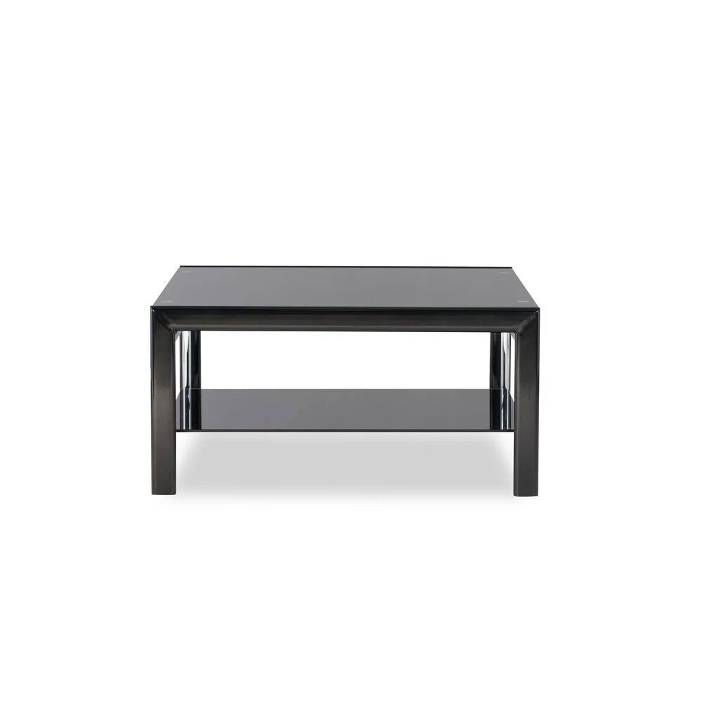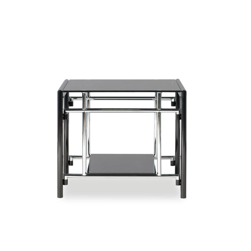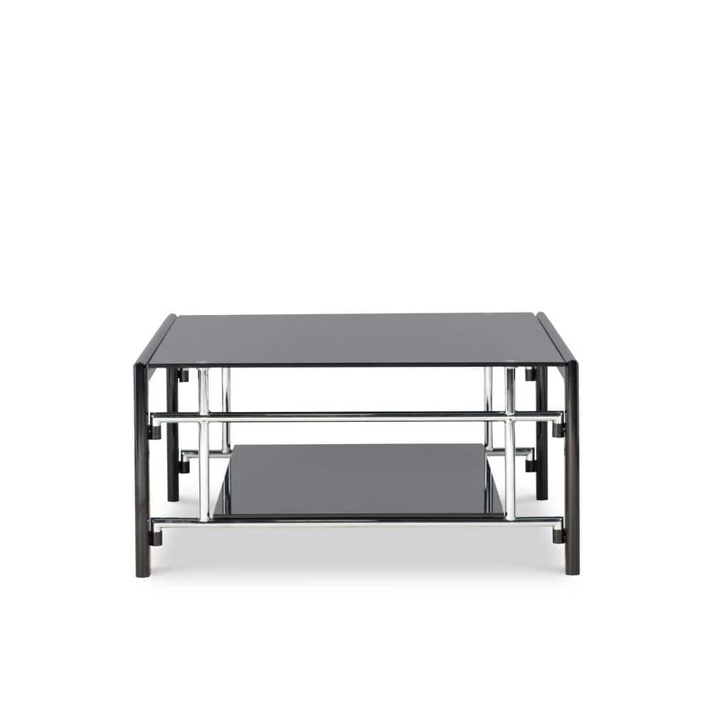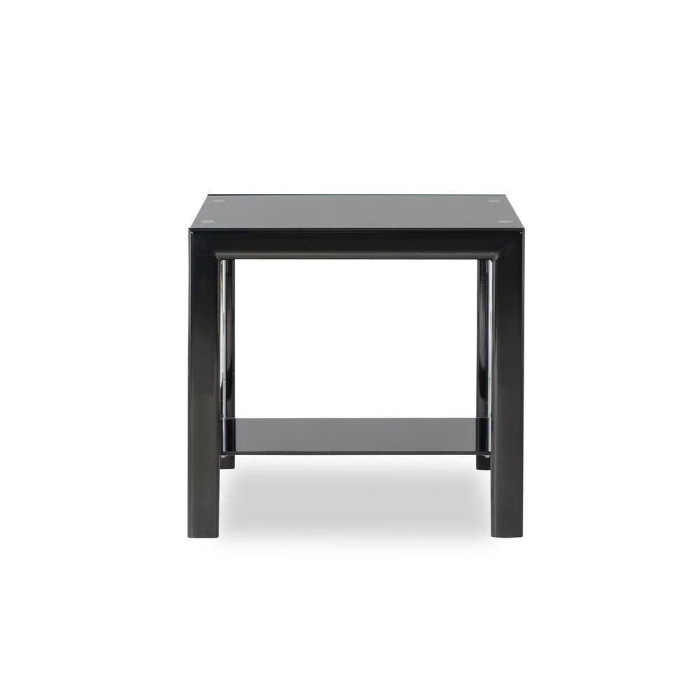 Black Glass Square Coffee Table and End Table set features contemporary “Gloss Black” frame with inset “gloss Silver” grid side panels, 10mm Black glass top, and 8mm Black glass shelf. Folding assembly for the frame and sides, then drop the glass into place. One coffee table and two end tables included. Ships in three cartons.