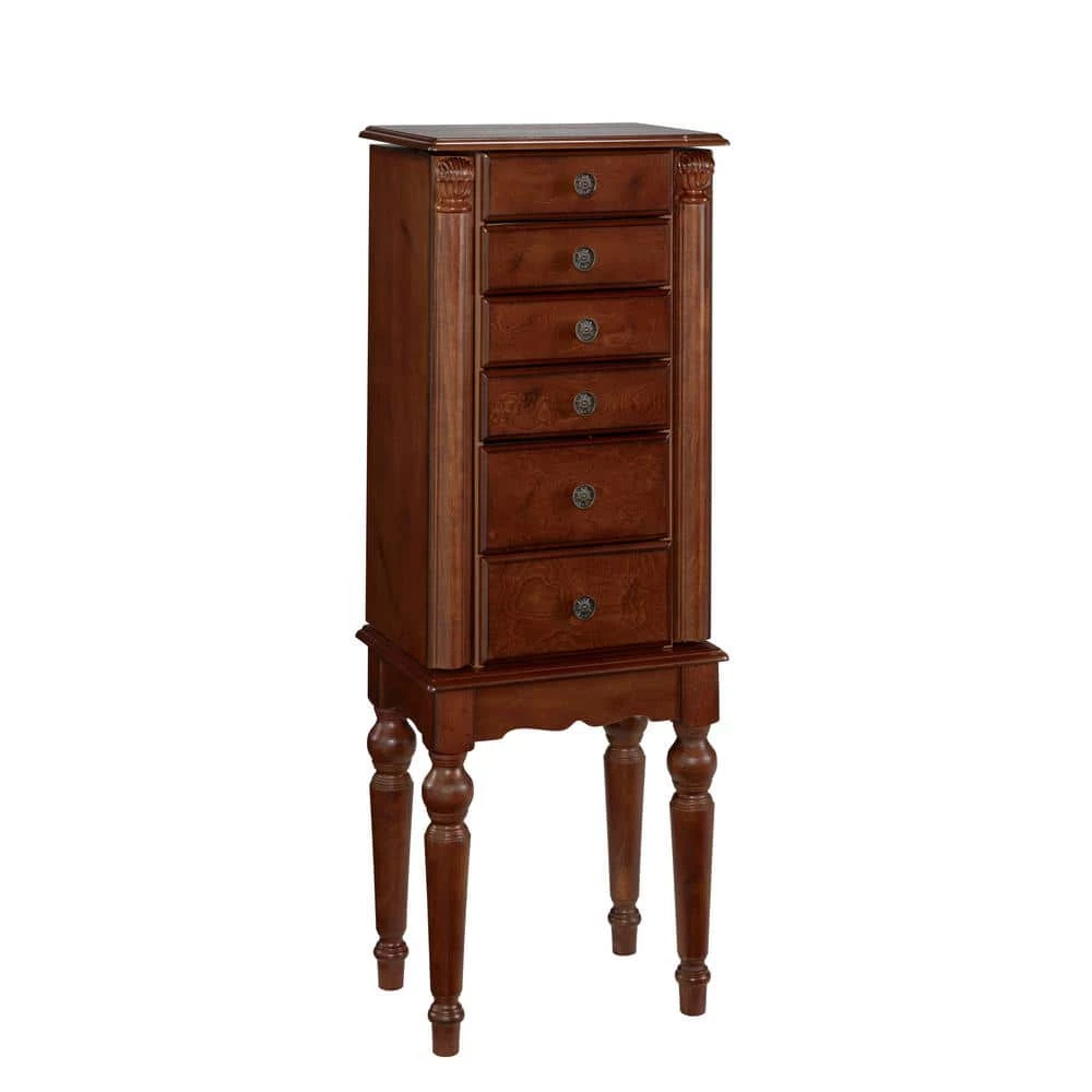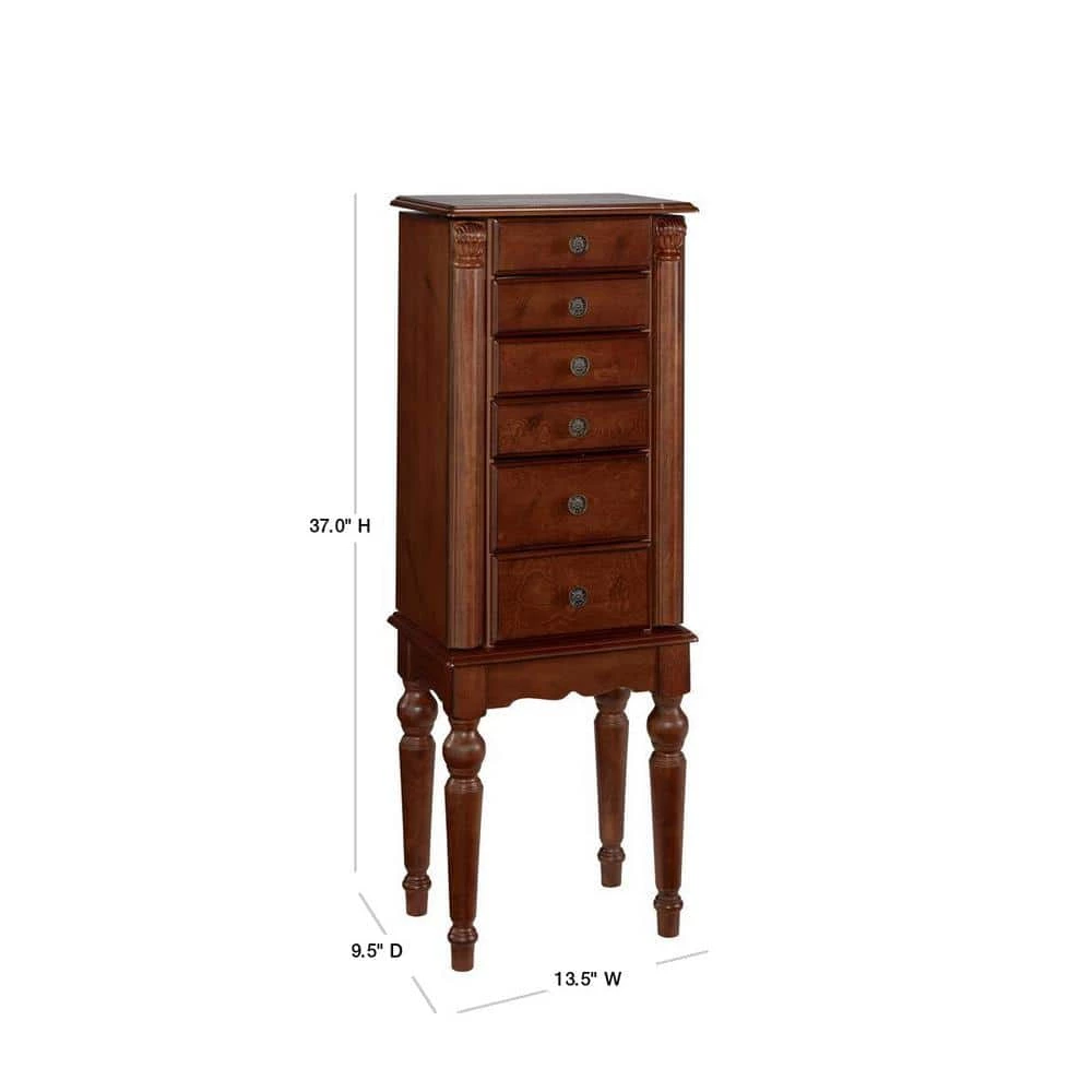 This petite Jewelry Armoire is sized for economy and function. Features a lightly distressed “Deep Cherry” finish with flip top and inset mirror, scalloped skirt, and spindle turned legs. The top compartment is divided with half ring pads and half 2-squares. There are side swing doors with fully lined interior compartment and 1-row each of five chain necklace hooks and matching rayon cord. There are 3-small and 2-large drawers. The first drawer has 6-squares and the second has four. The third, fourth and fifth drawers are open and fully lined. Lining is plush black, 100% rayon. Top and legs assembly required.