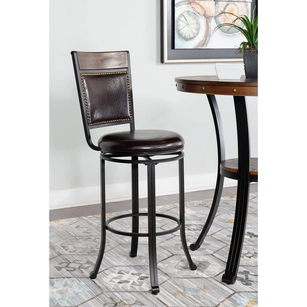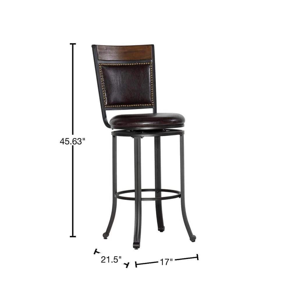 Mixing metal with wood, the transitional Brewer Bar Stool provides a unique addition to your home. The stool features an oak wood grain veneer with a dark brown faux leather back and seat with nailhead trim. The seat sits comfortably with a curved back for support, a wide seat, and a circular kick bar to rest your feet. Some assembly required.