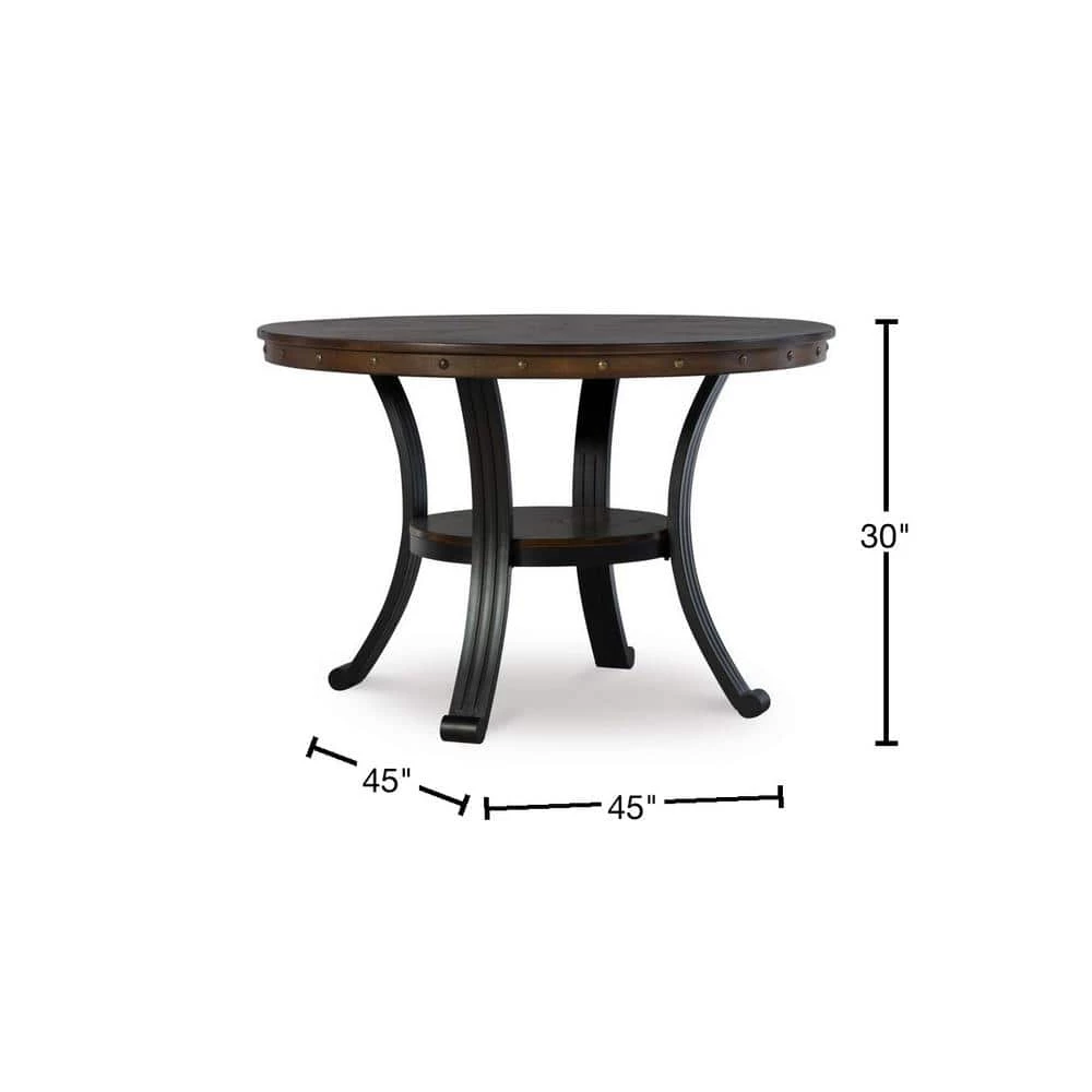 - Round dining table Features an oak woodgrain veneer with nail heads along the apron