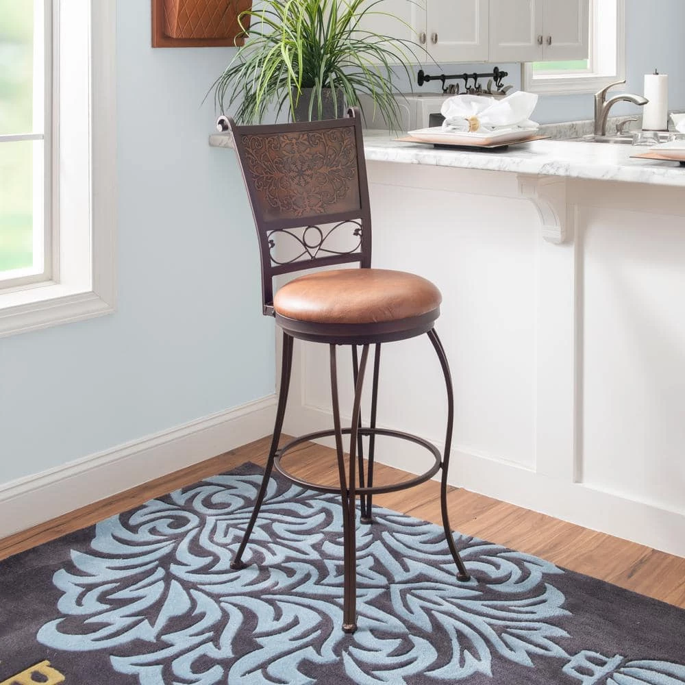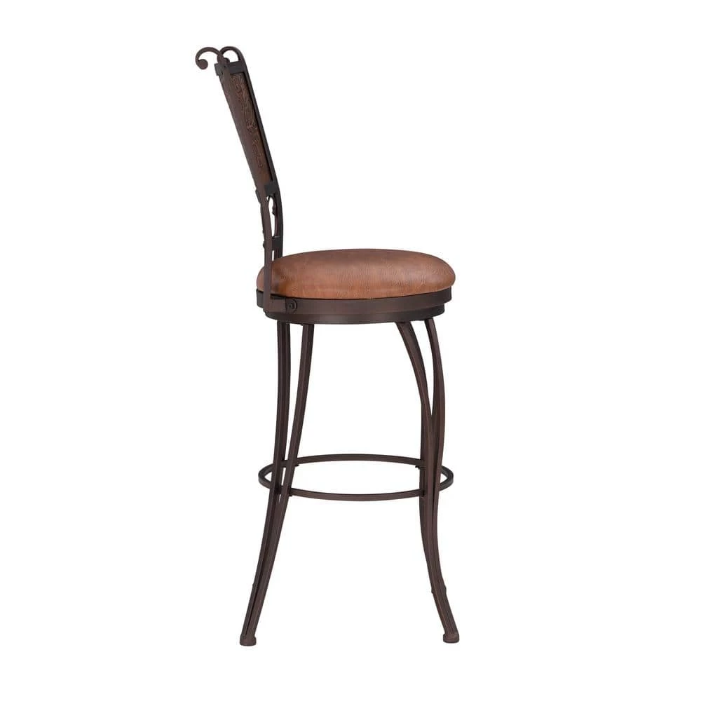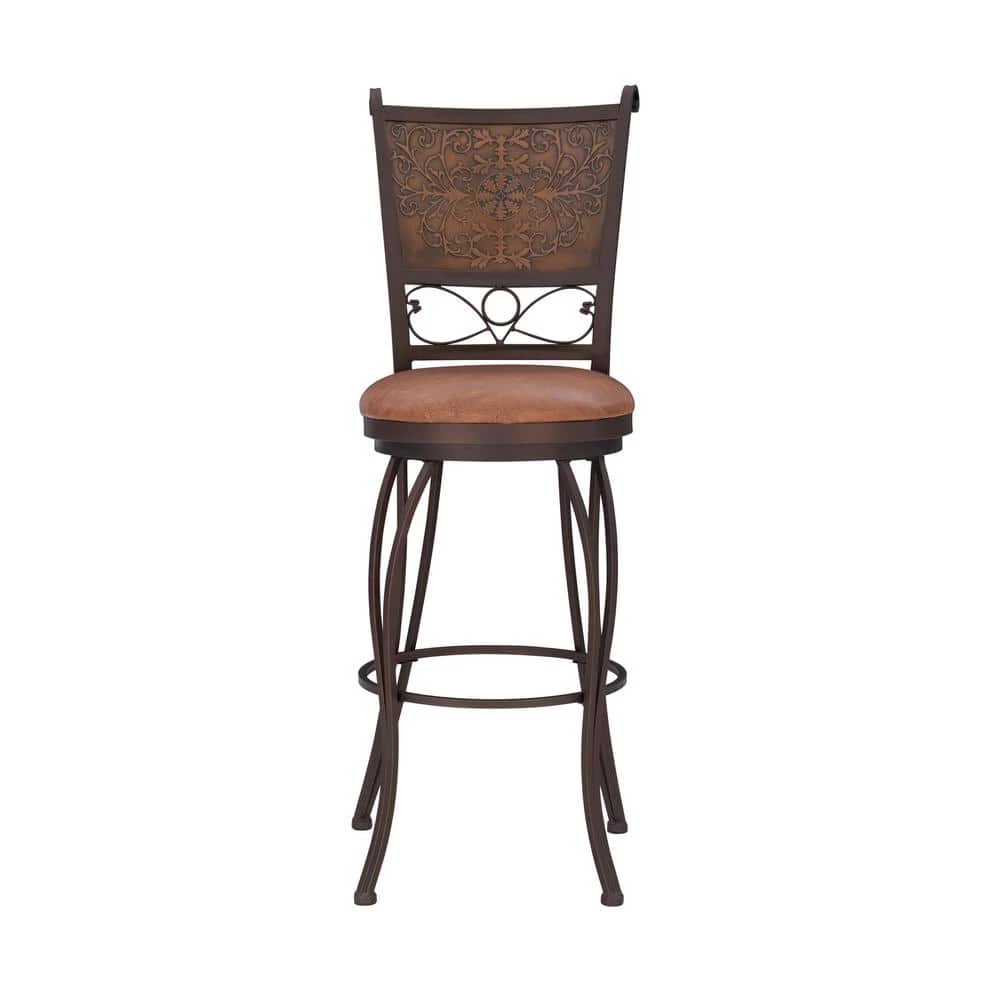 The details make the difference with this elegant Bryant Copper barstool. A stamped back enhances the look while curved front and angled back legs make the design even livelier. The plush faux leather seat is attractive and comfortable. The muted Copper color stamp blends with the Bronze finish. This metal stool, with a 30″ seat height, is a lovely complement to a bar or bar height table or counter around 40″ to 42″ high, and acts as a stylish accent anywhere you want to place it.