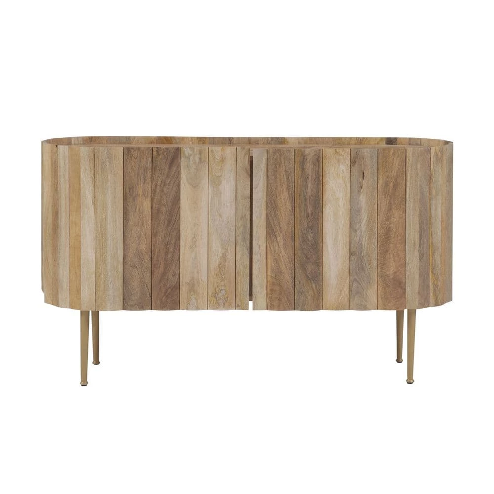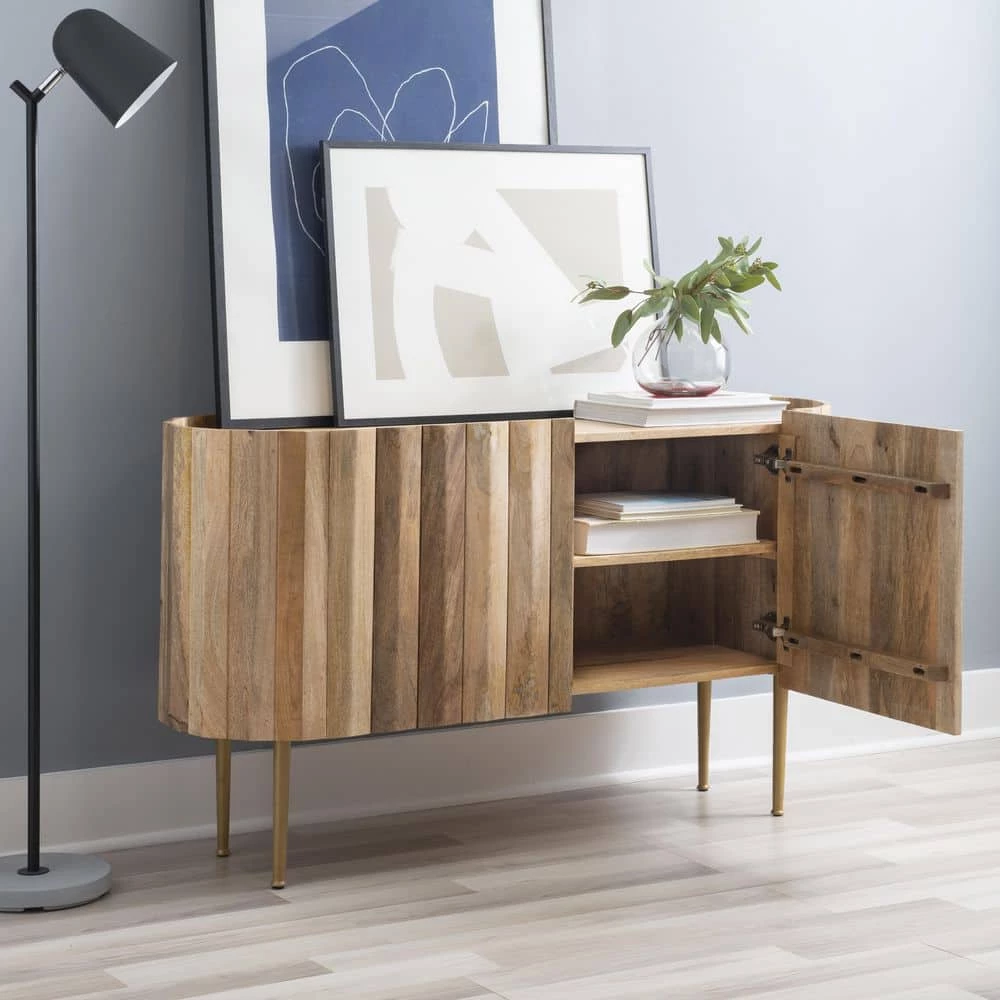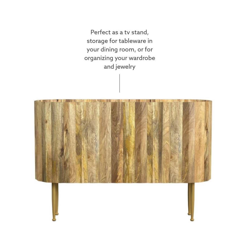 This decorative Charlee 52 in. W Natural 30.25 in. H Elliptical Solid Mango Wood Console Table with 2 Doors and 4 Shelves brings a rustic charm into any space while also maintaining a sense of modernity. Geometric panels made of solid mango wood line the oval shaped frame to create an uninterrupted facade when the doors are closed. They open up to reveal 4 shelves, each of which measures at 18.5 in. x 14.25 in. and supports up to 45 lbs. Iron legs in gold hold the piece 10 in. off the ground and nearly match the natural hues of the mango wood. The only assembly required with this stylish storage cabinet is the attachment of the legs.