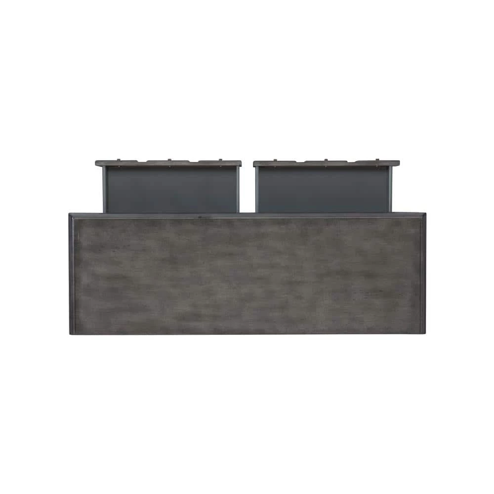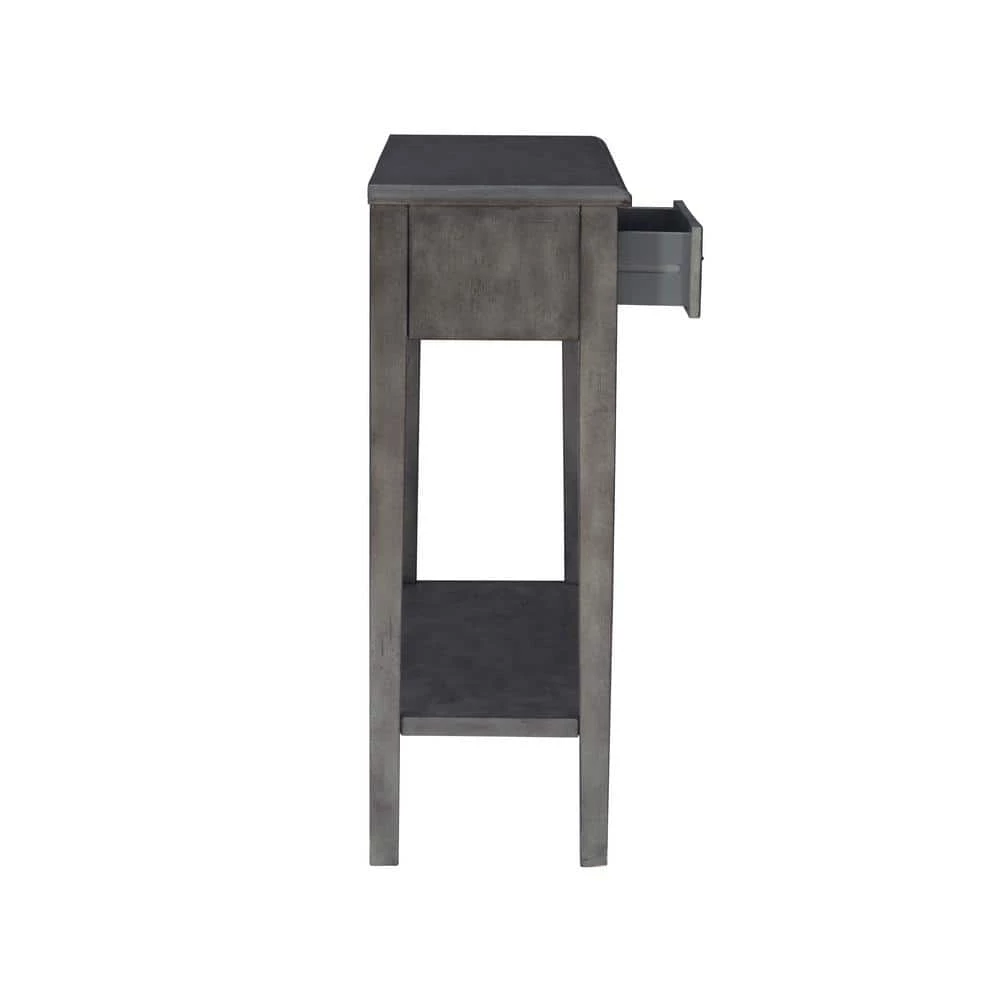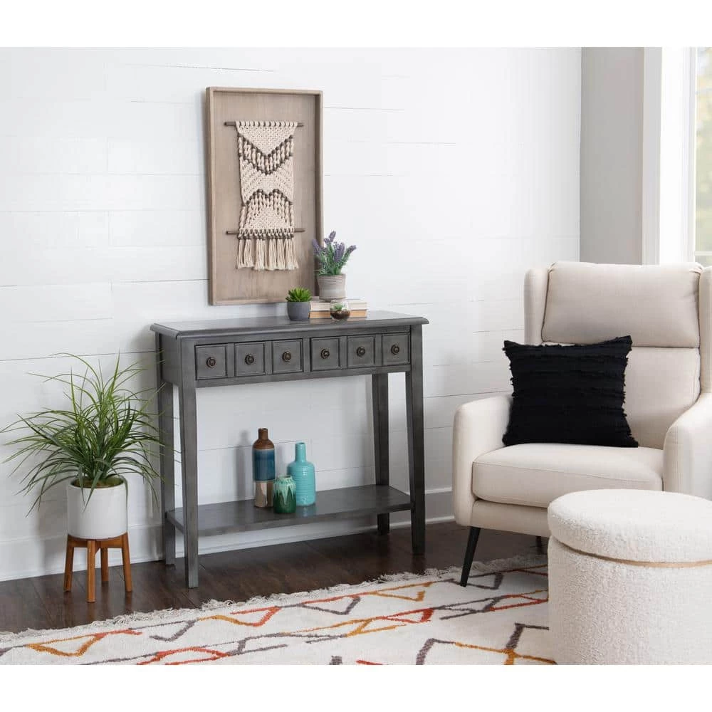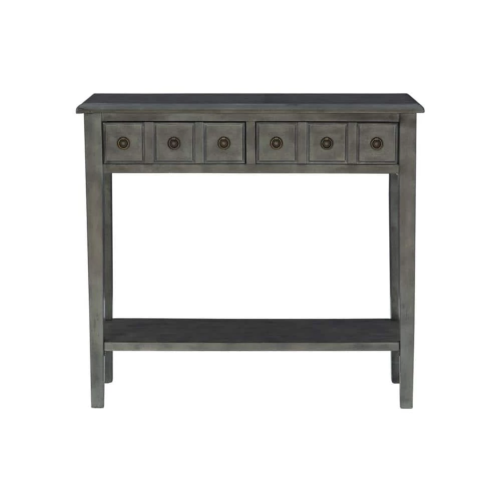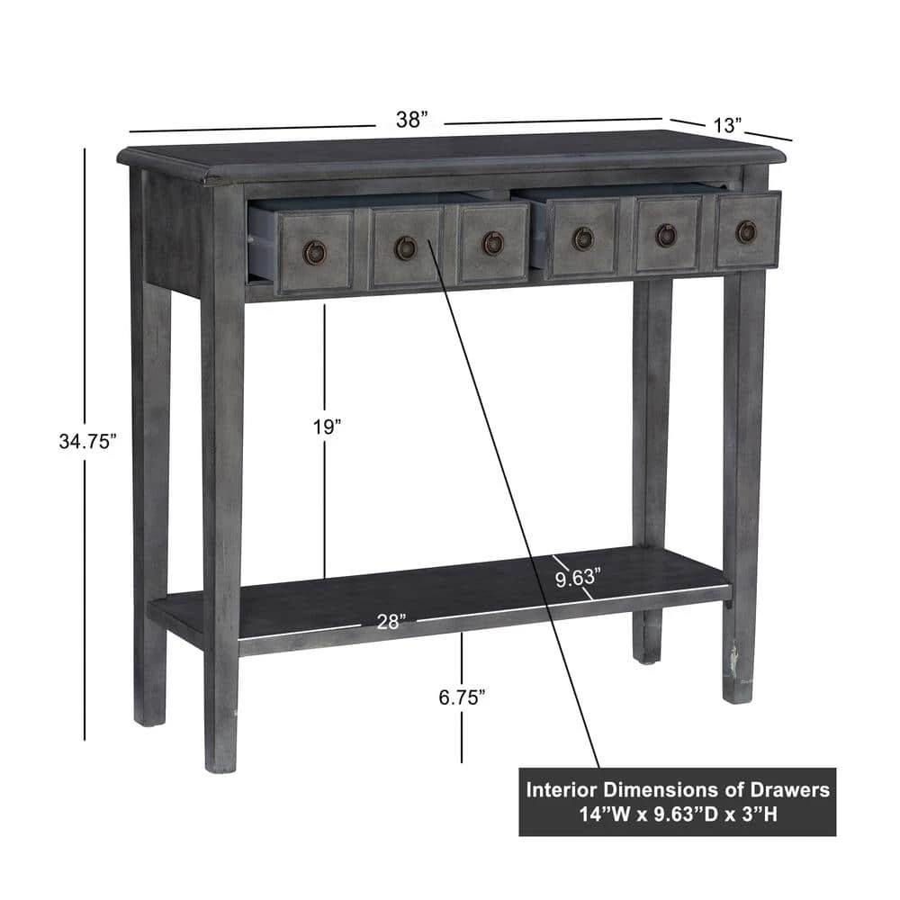 Designed with smaller spaces in mind, this Cindie 38 in. W Grey 34.75 in. H Rectangular Wood Console Table with Two Drawers and Shelf serves as a stylish accent in your foyer, living room or under a wall mounted TV. The slender silhouette is equipped with two drawers to easily store small essentials, while a bottom shelf is perfectly sized to show off your favorite books or greenery. Round, antique bronze metal drawer pulls and four tapered legs add a distinctive touch to this cottage-inspired look. This item is finished with a distressed cream hue for a welcoming feel.