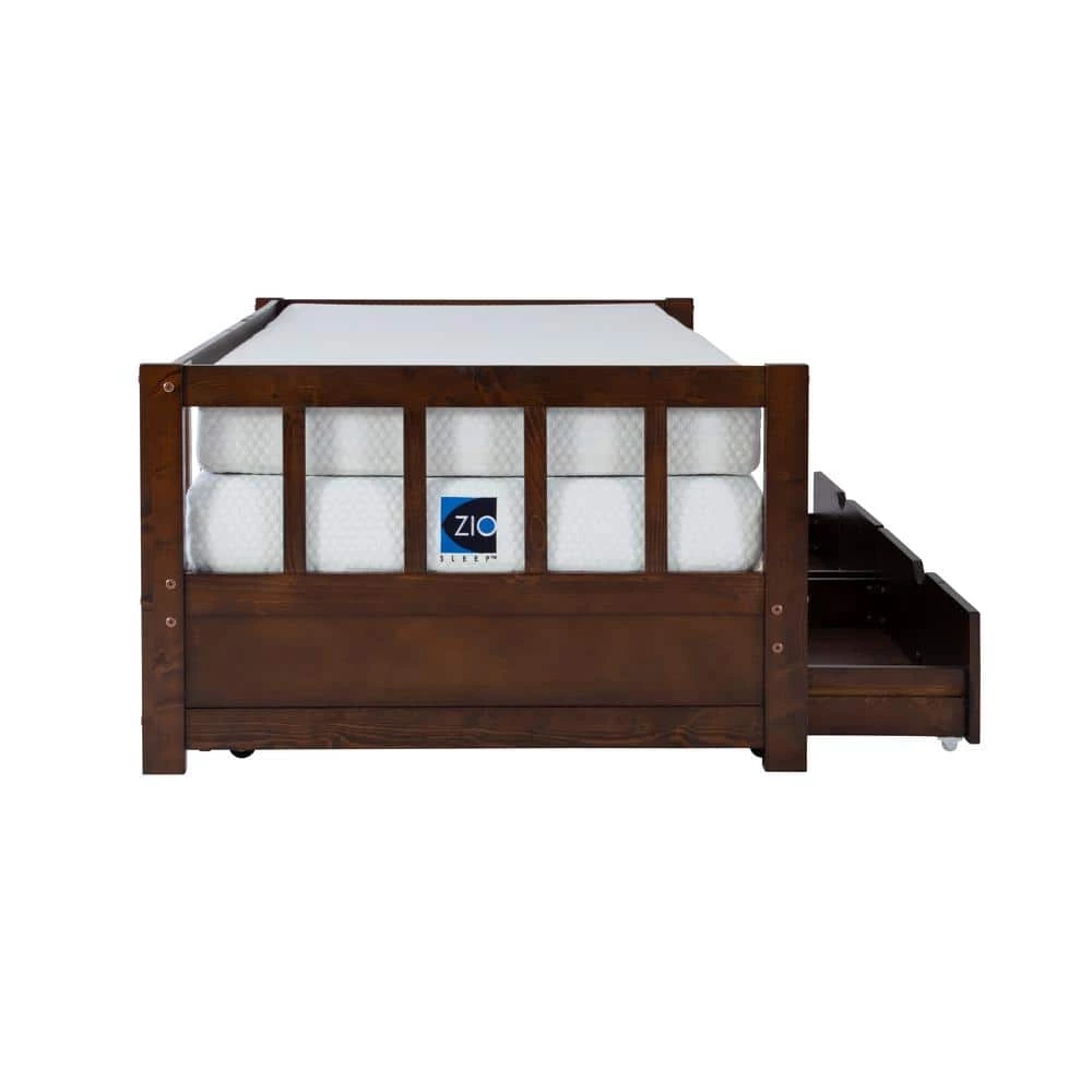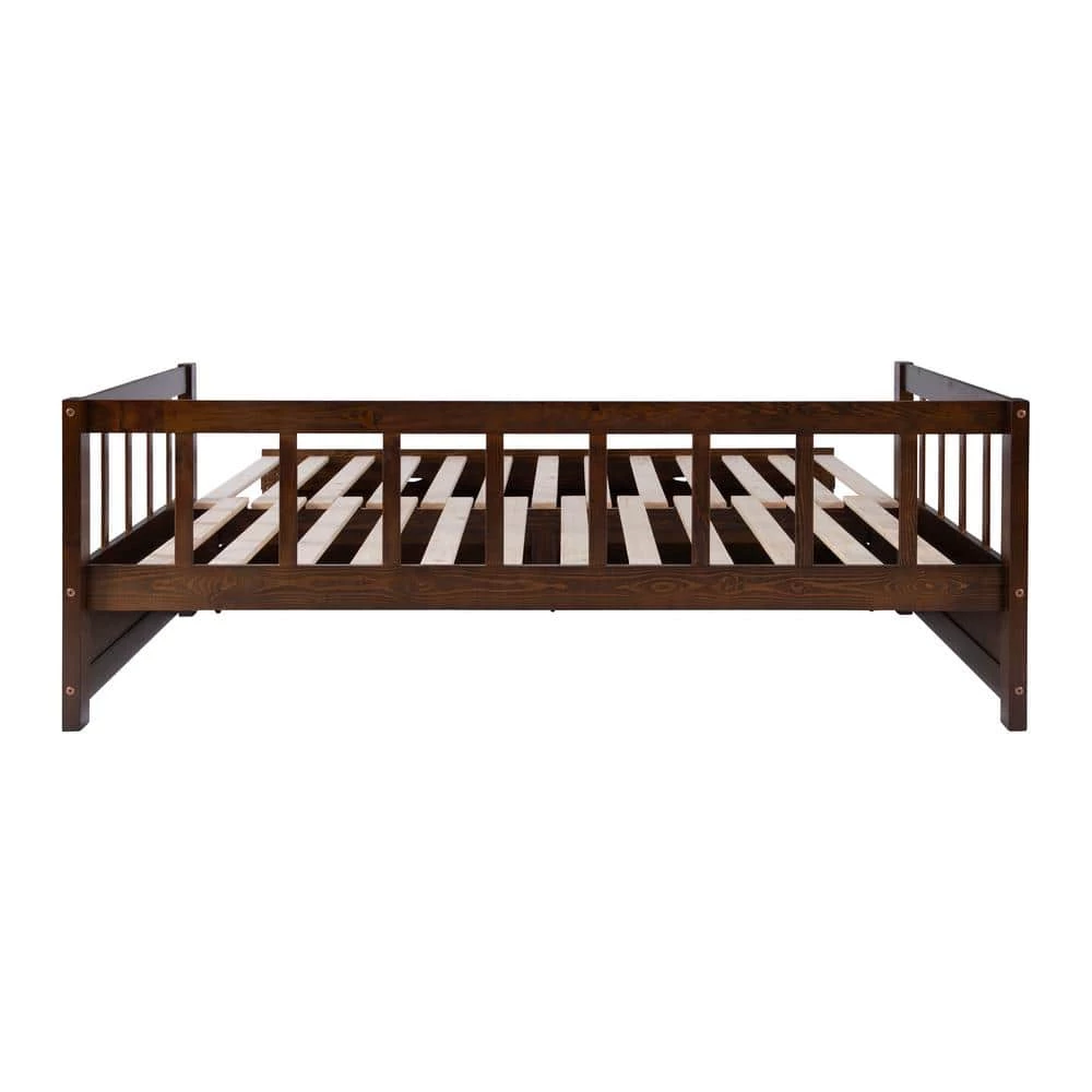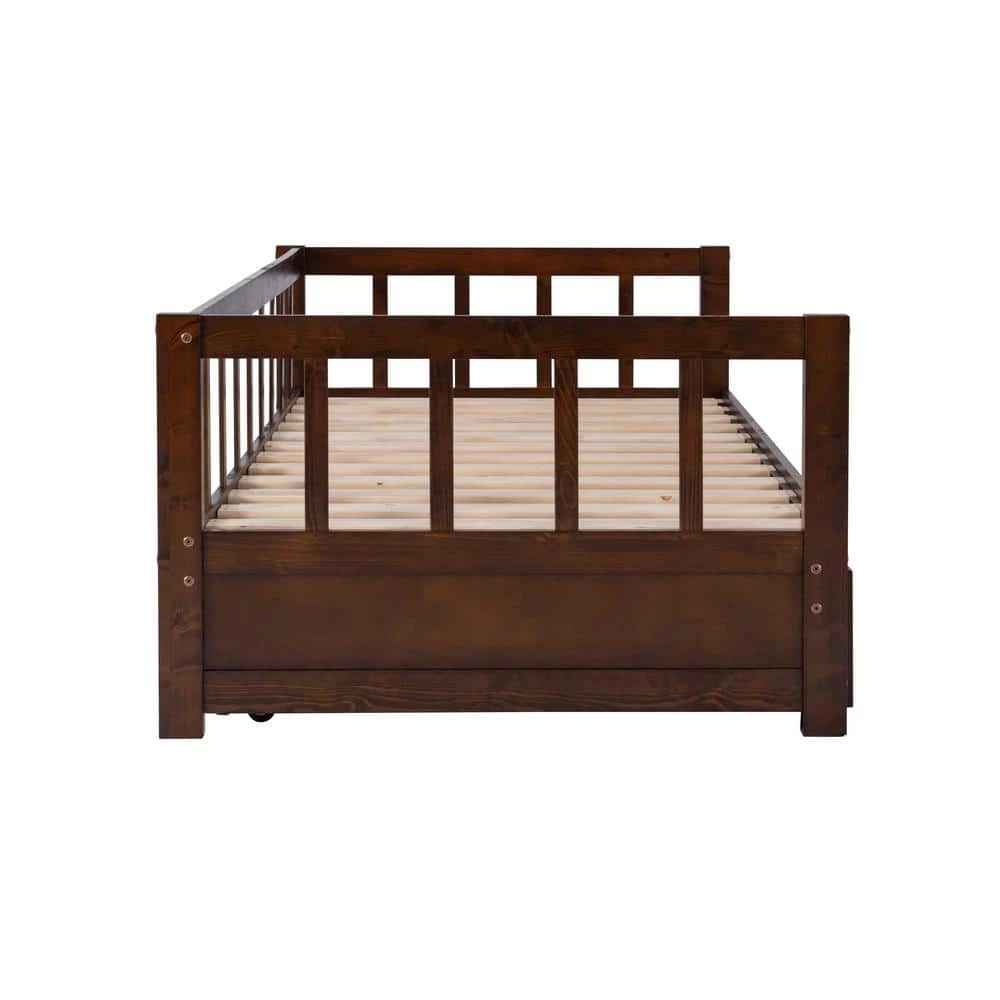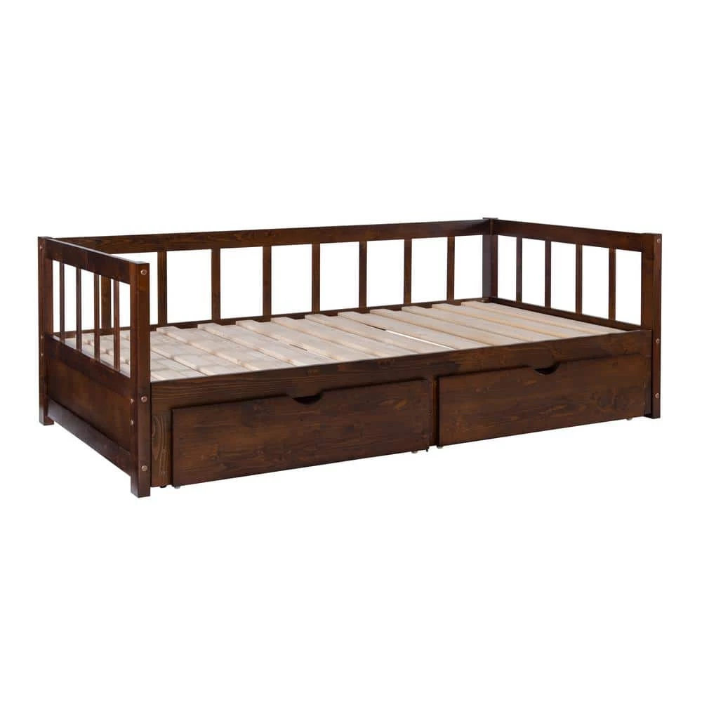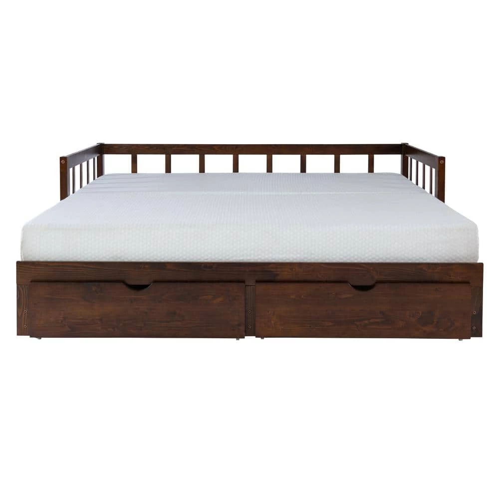 Providing ultimate flexibility for a guest room, kids room or small space living. This Conyers Brown Espresso Double Twin Daybed with Storage converts easily from a twin size daybed to a full size king sleeping zone. When used as a day bed, there is room to stack two 7″ mattresses. When converting to a king bed, simply slide out the frame and cover with one of the mattresses from the day bed. Additionally, two large pull out drawers provide extra storage for the bedding, extra blankets or clothes. Made of solid pine wood that is finished an espresso finish.