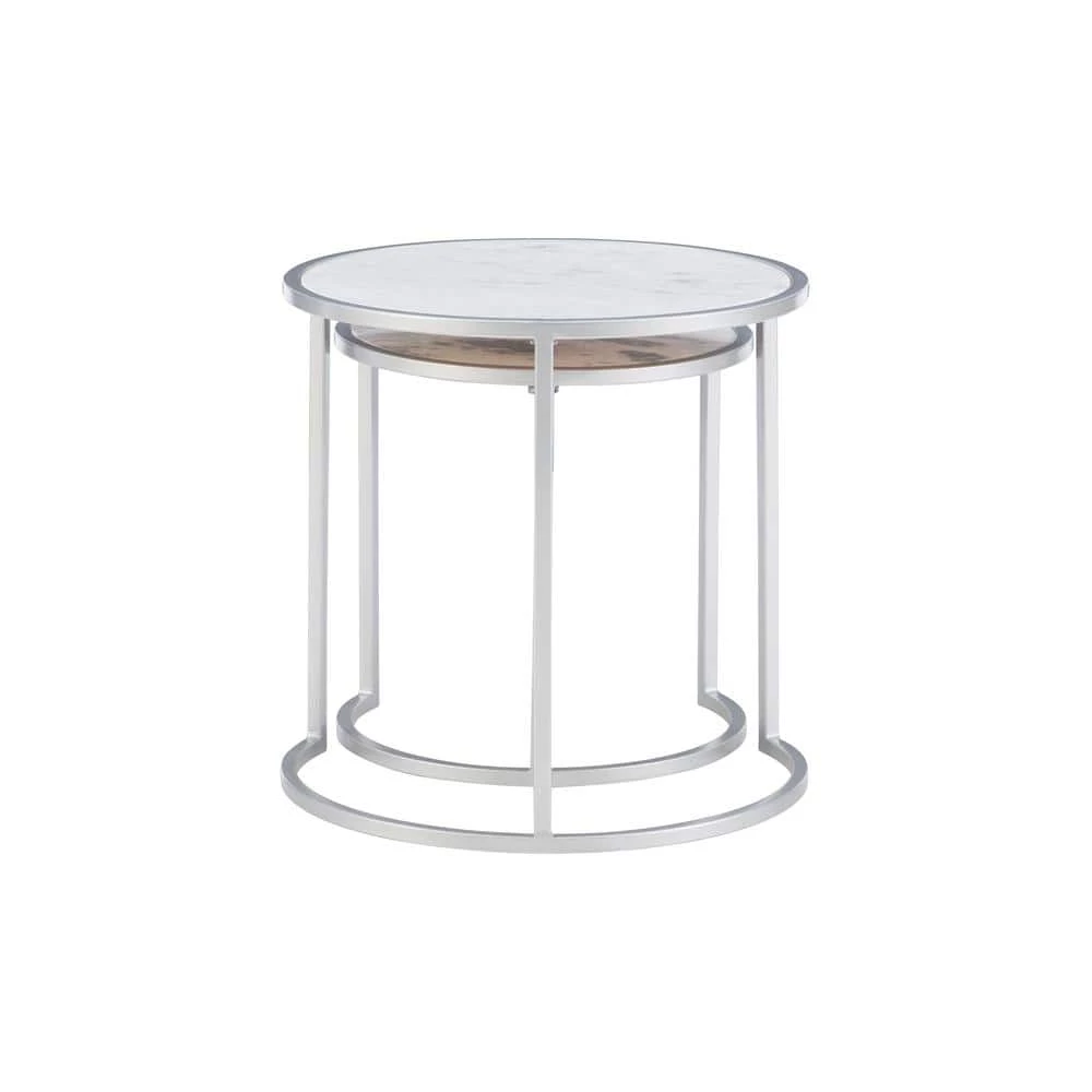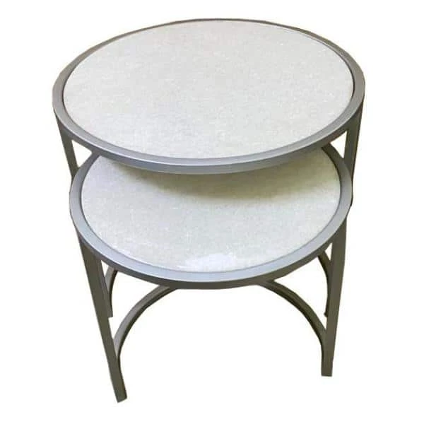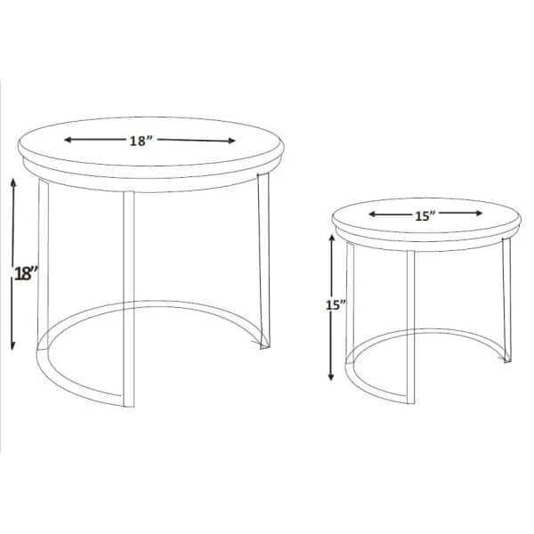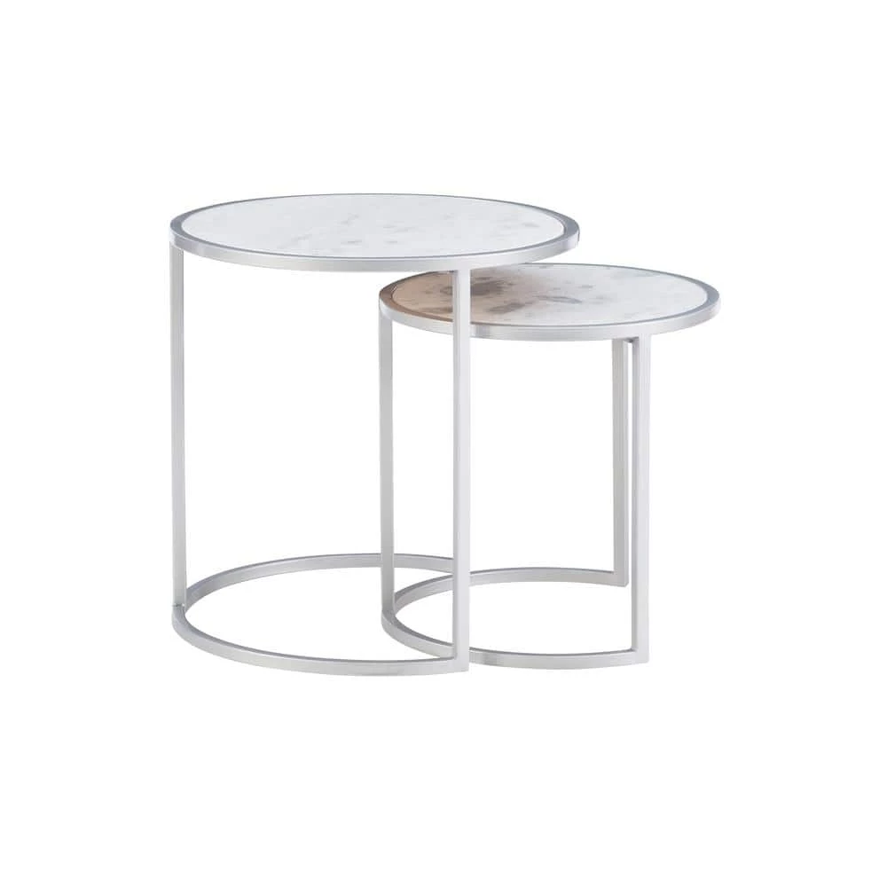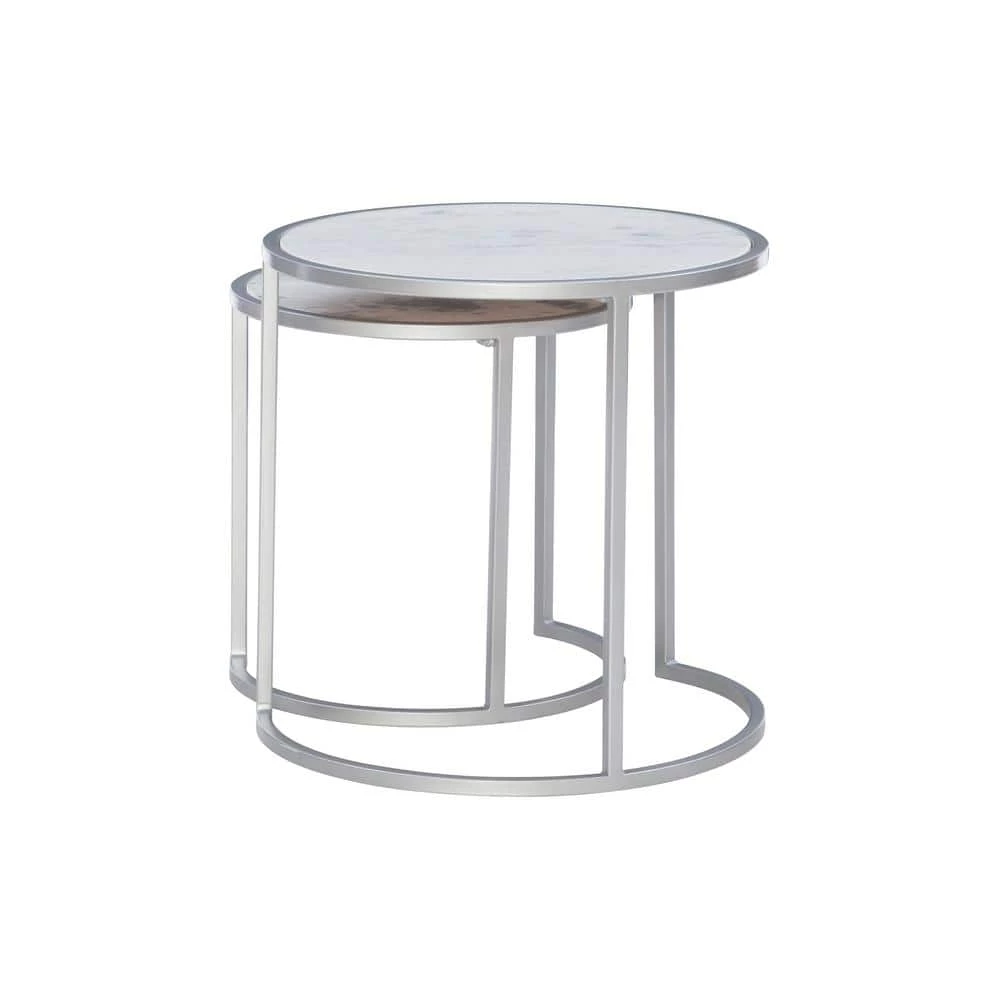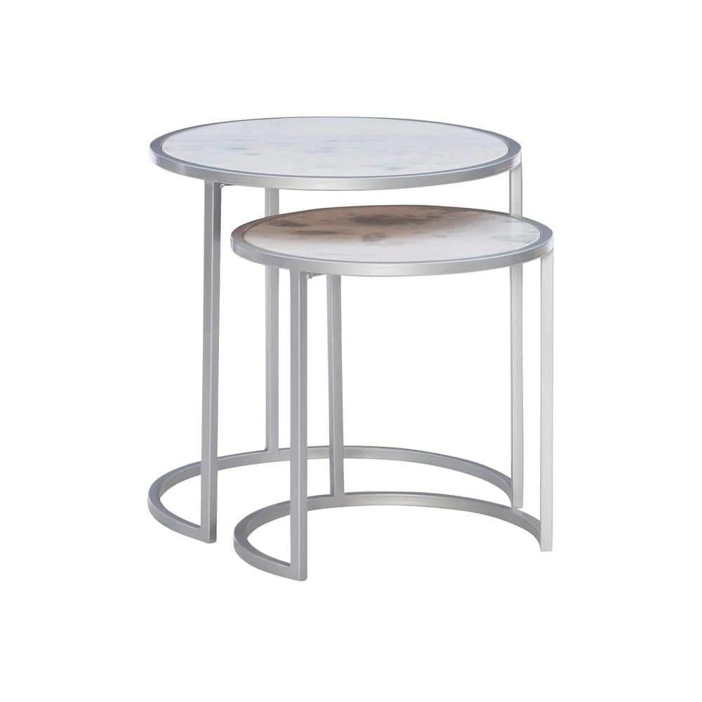 The David 18 in. Gray 18 in. Circular Gray and White Nesting Tables with Marble Tops serves as the perfect foundation for casual dinner parties, a light lunch with the family, or sipping your coffee alone in the morning. The gray and white marble tops are supported by iron frames with a silver finish, creating a neutral palette that pairs seamlessly with a variety of decor. The taller of the two measures at 18 inches high, making both tables an ideal accompaniment to a couch or set of plush chairs. Now your favorite cocktail or coffee is only an arm’s length away.