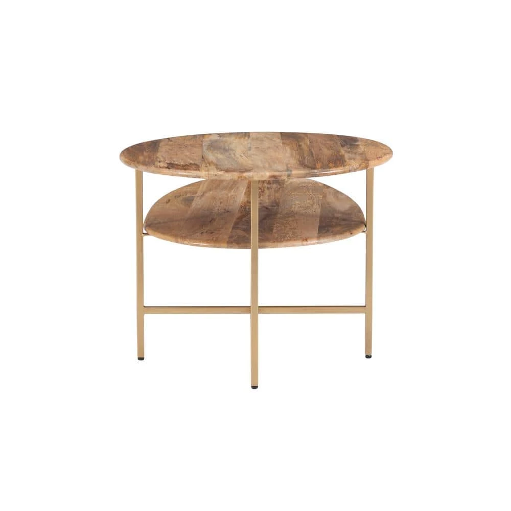 With two tiers, this Dawson Two Tiered Walnut and Gold Coffee Table can do it all. This space saving table looks lovely alongside a sofa and is the perfect anchor for any seating area. The clean lines allow surrounding accents to breathe, while the gold finish completes the look. Two solid mango wood tabletops, one round and one oval, provide a perfect stage for drinks, snacks, books and magazines. Levelers under the four iron legs ensure a stable surface to keep your belongings safe.