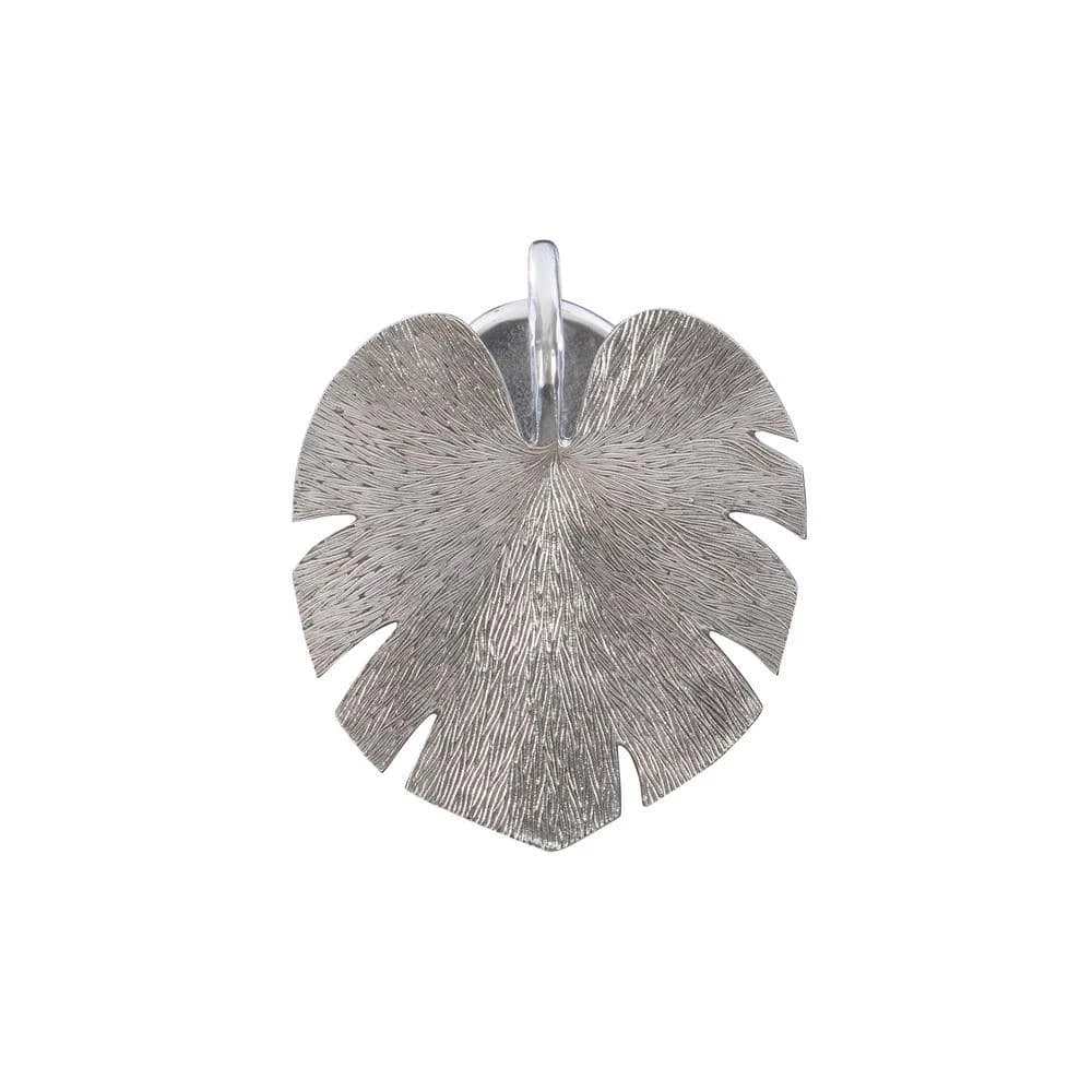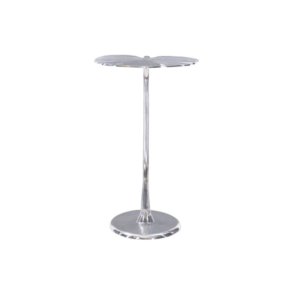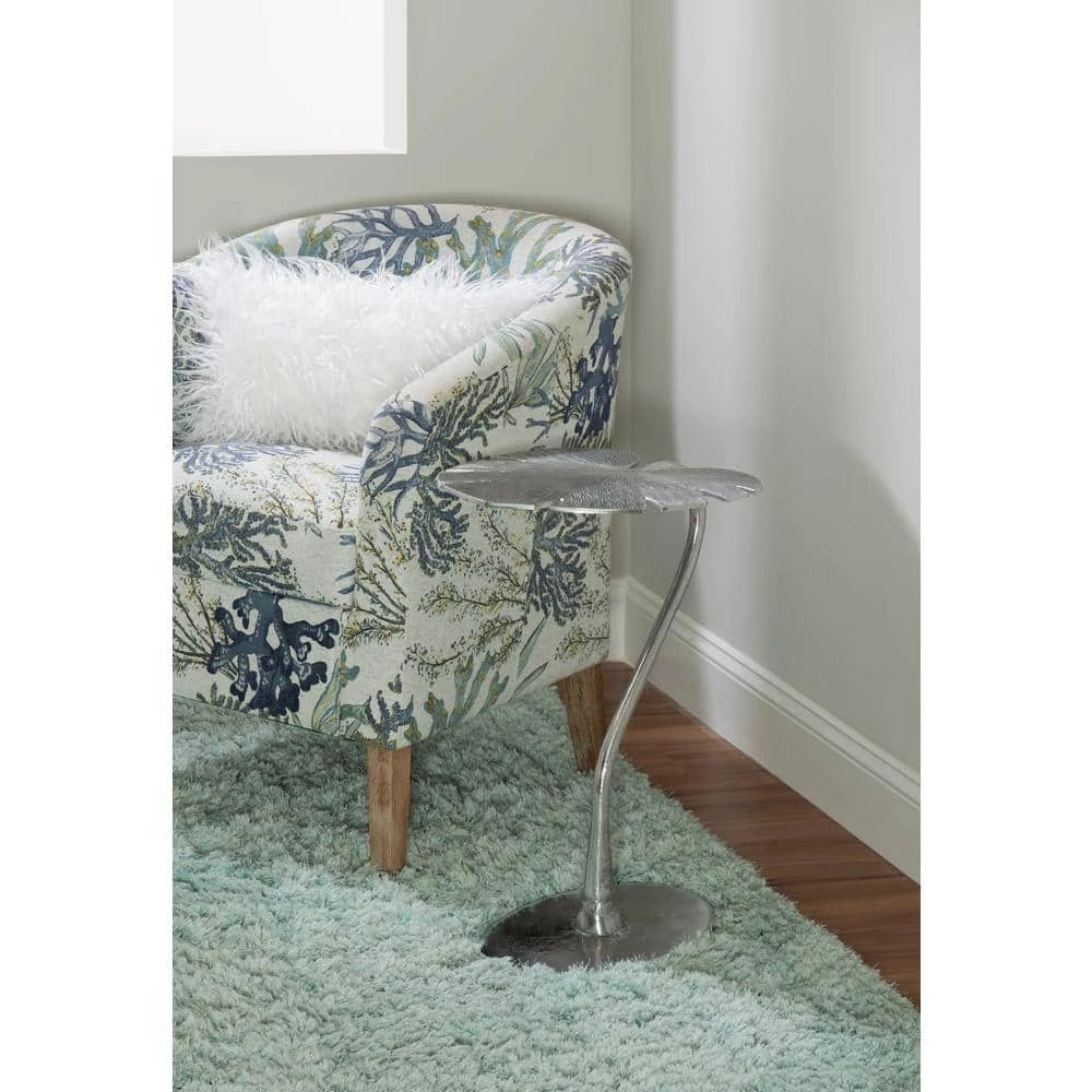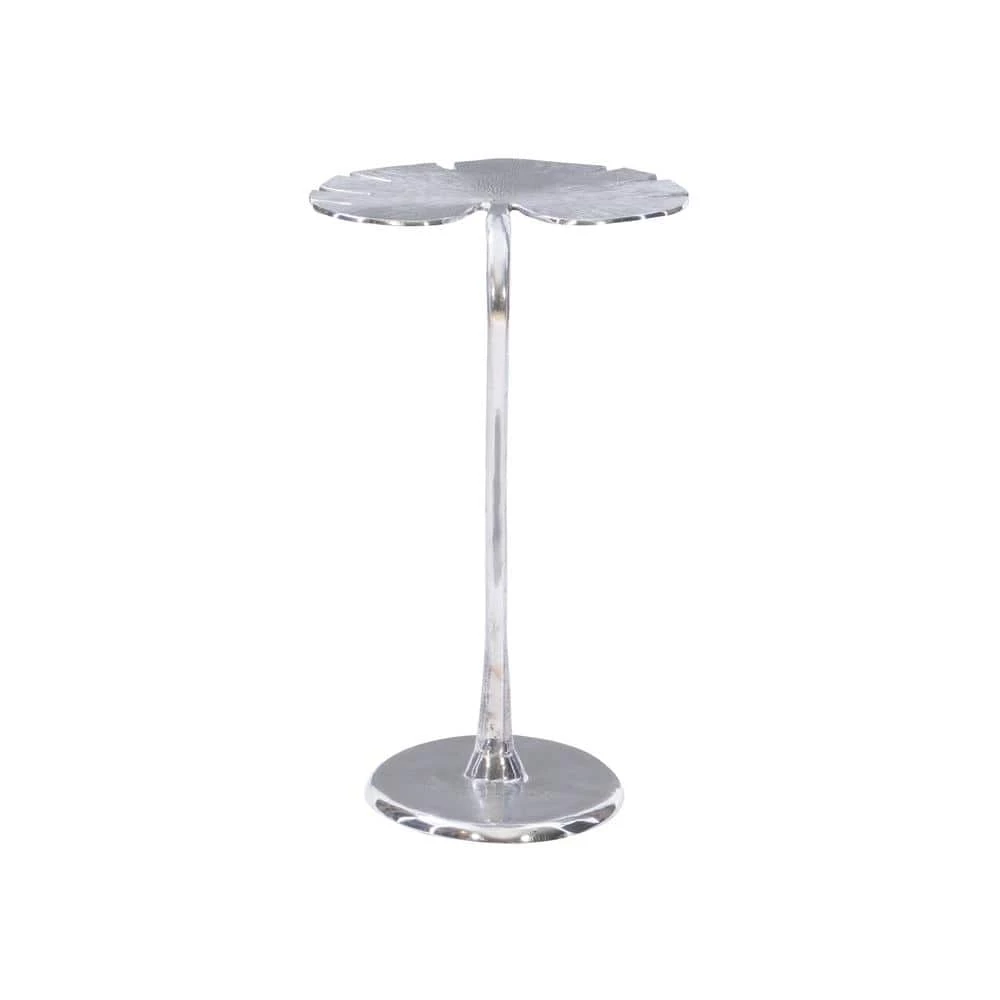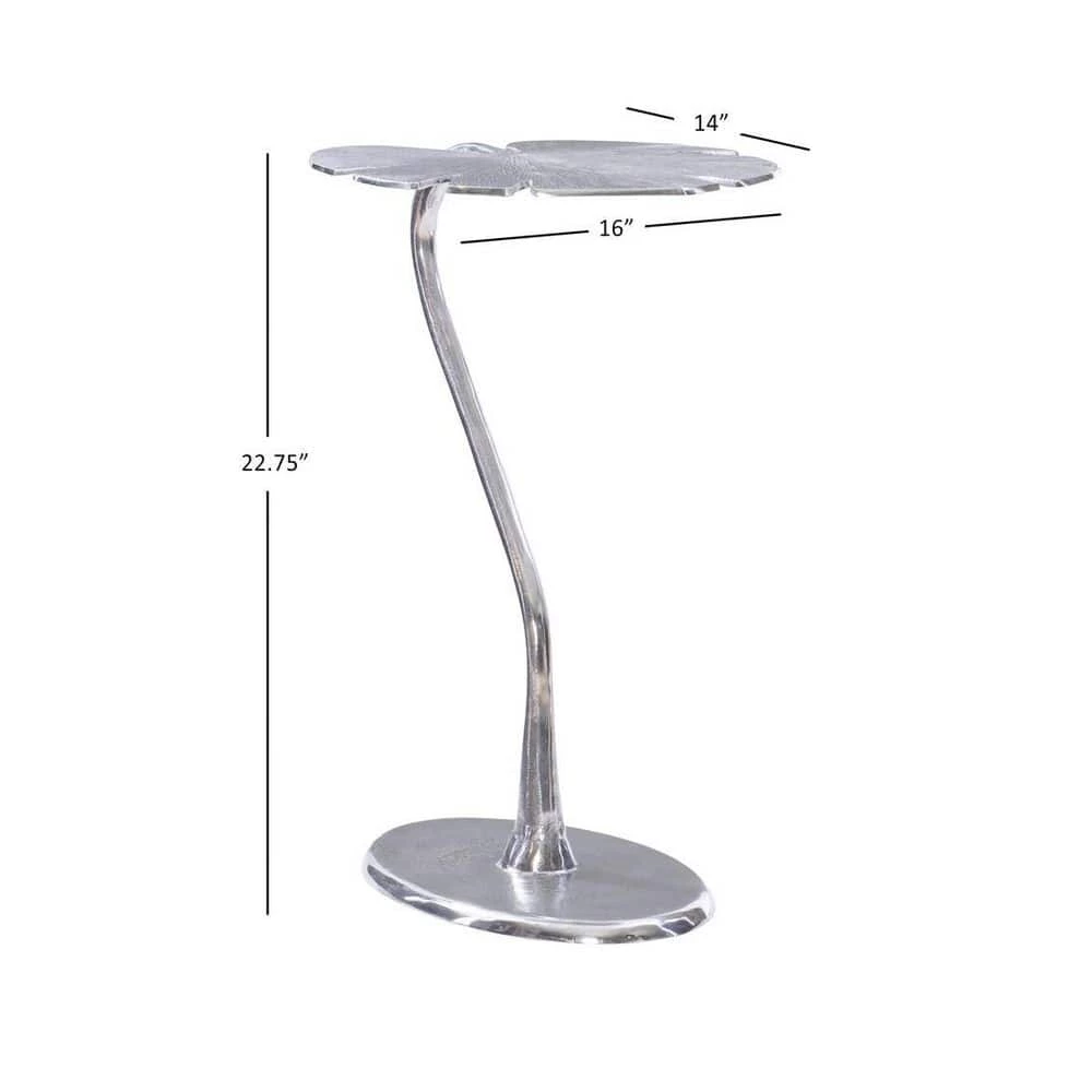 Make a statement with this beautiful contemporary Dhania Silver Metal Side Table. Inspired by the lush foliage of a tropical garden, this sculpture like piece features dramatic curves and an intricately detailed leaf that will add an elegant touch to any room. The modern design works perfectly as a living room end table or a stand for a candle and a glass of wine while relaxing in the bath. You can even add this aluminum table to your outdoor furniture set. It is an exquisite combination of form and function for your home.