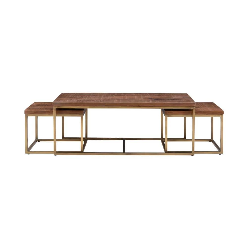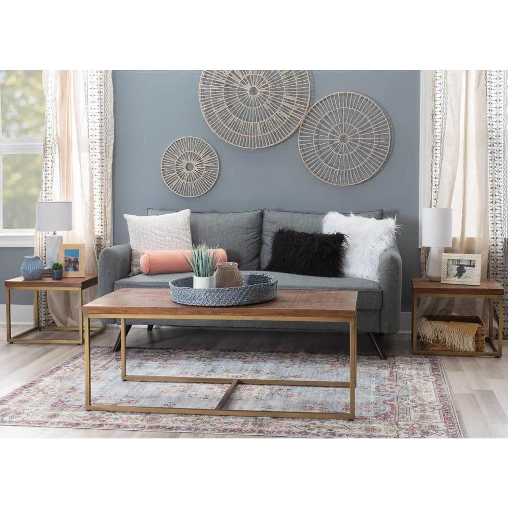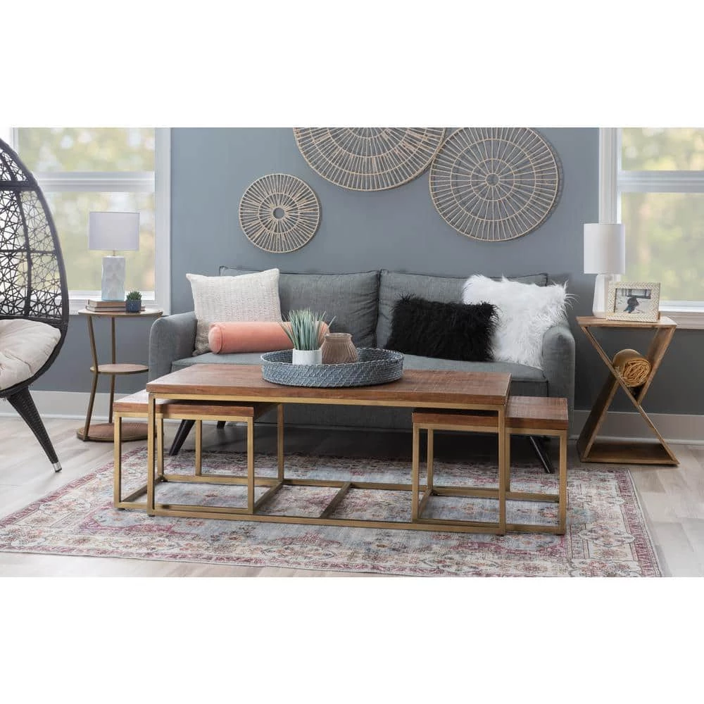 Stretched out for a party spread or buttoned up to conserve space and keep things tidy, this Edith 48 in. W Gold Metal 18.5 in. H Rectangular Coffee Table with 2 End Tables can do it all. A 48 in. x 22 in. surface serves as home base to two separate tables that can be seamlessly tucked away or configured to accommodate extra guests or be used as end tables. The antique gold iron base components support solid mango wood tops that are covered in a natural stain. This versatile set arrives fully assembled, ready to bring new possibilities to your living room or entertainment space.