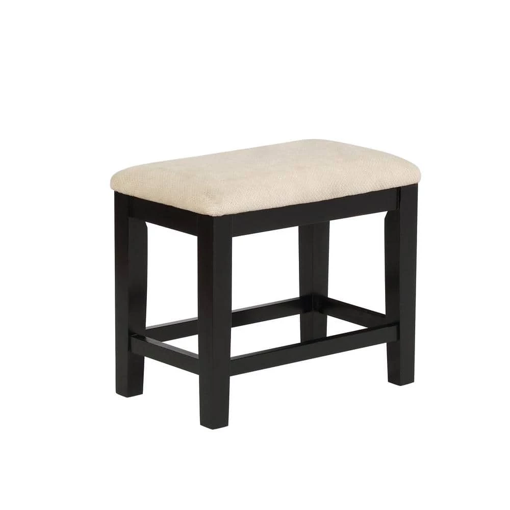 - Rectangular bench is thickly upholstered in beige fabric
