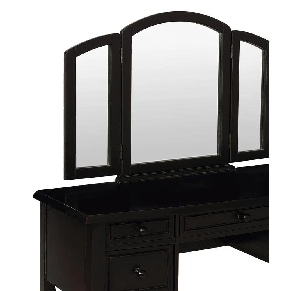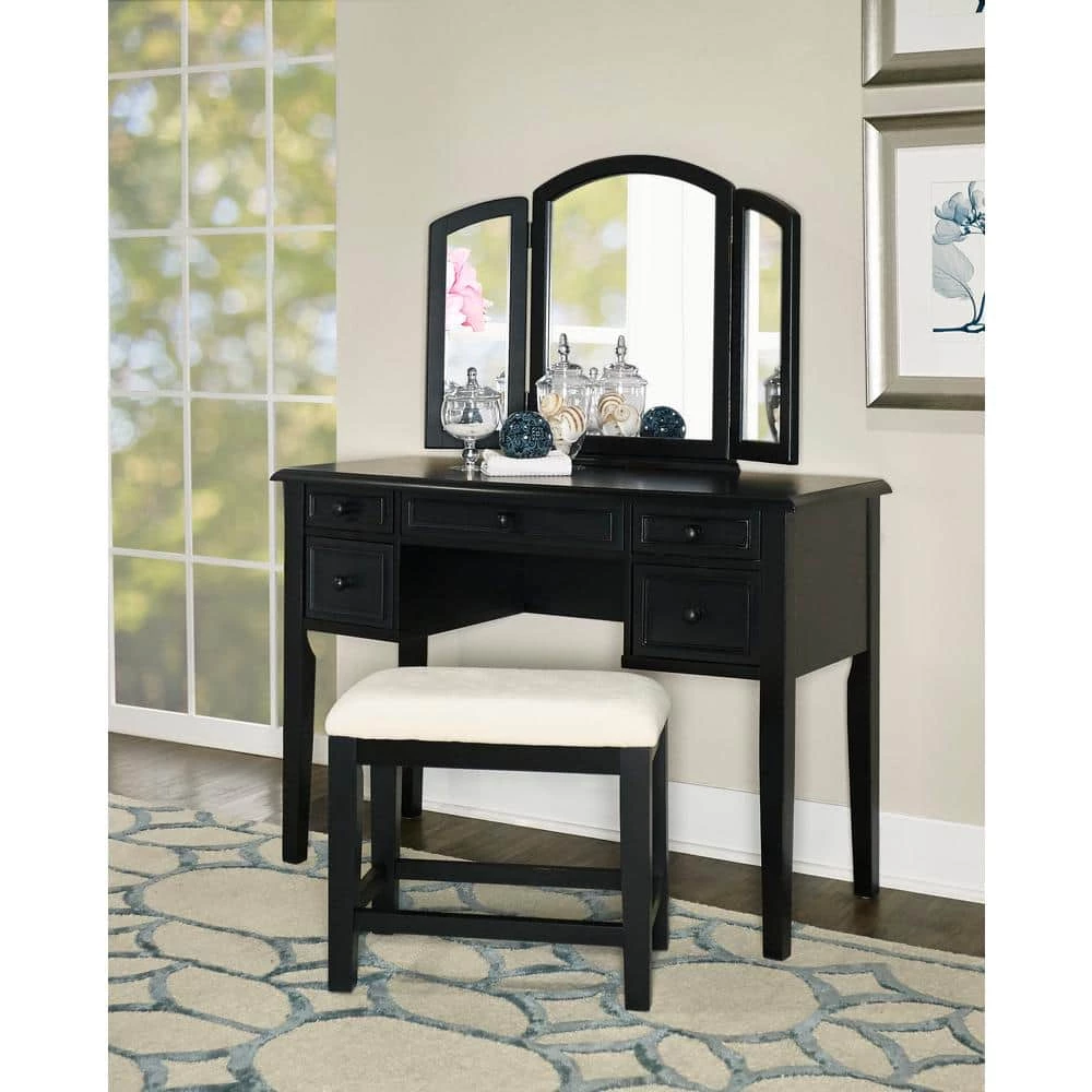 You cant help but feel pretty sitting in front of this transitional styled vanity with hinged tri-fold mirror for a side-to-side view. Crafted in MDF and solid wood, the generously sized top is large enough for writing. Five working curved drawers with raised frame rest on graceful square tapered legs. The rectangular bench has square tapered legs and is thickly upholstered in beige fabric, 63% cotton and 37% polyester. Vanity has leg and mirror assembly. Bench has leg assembly.