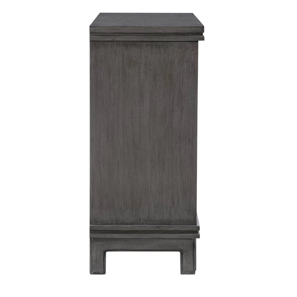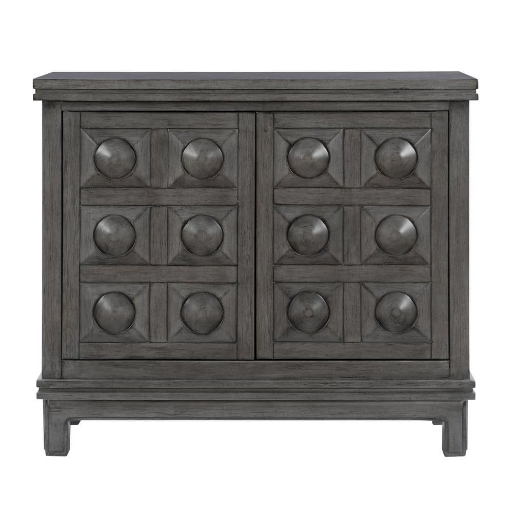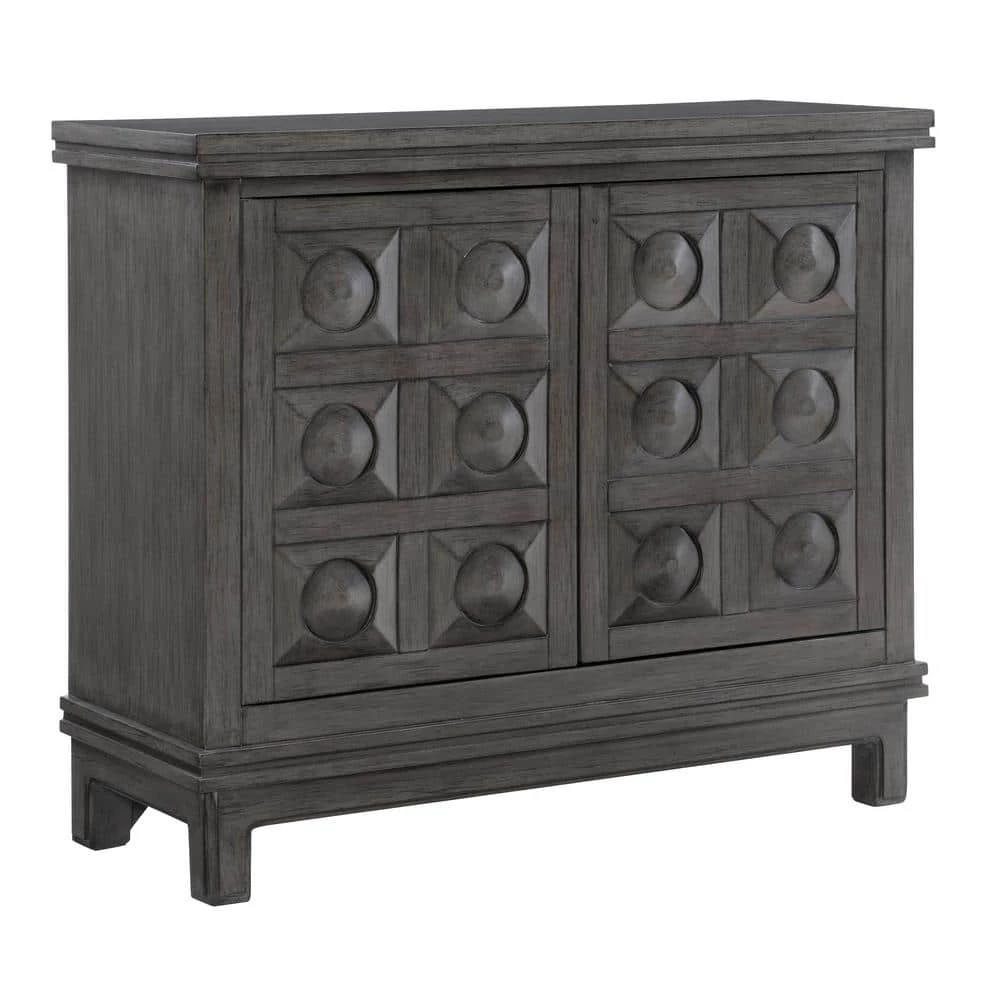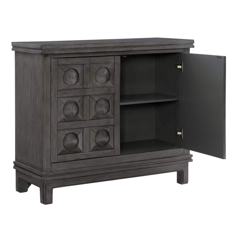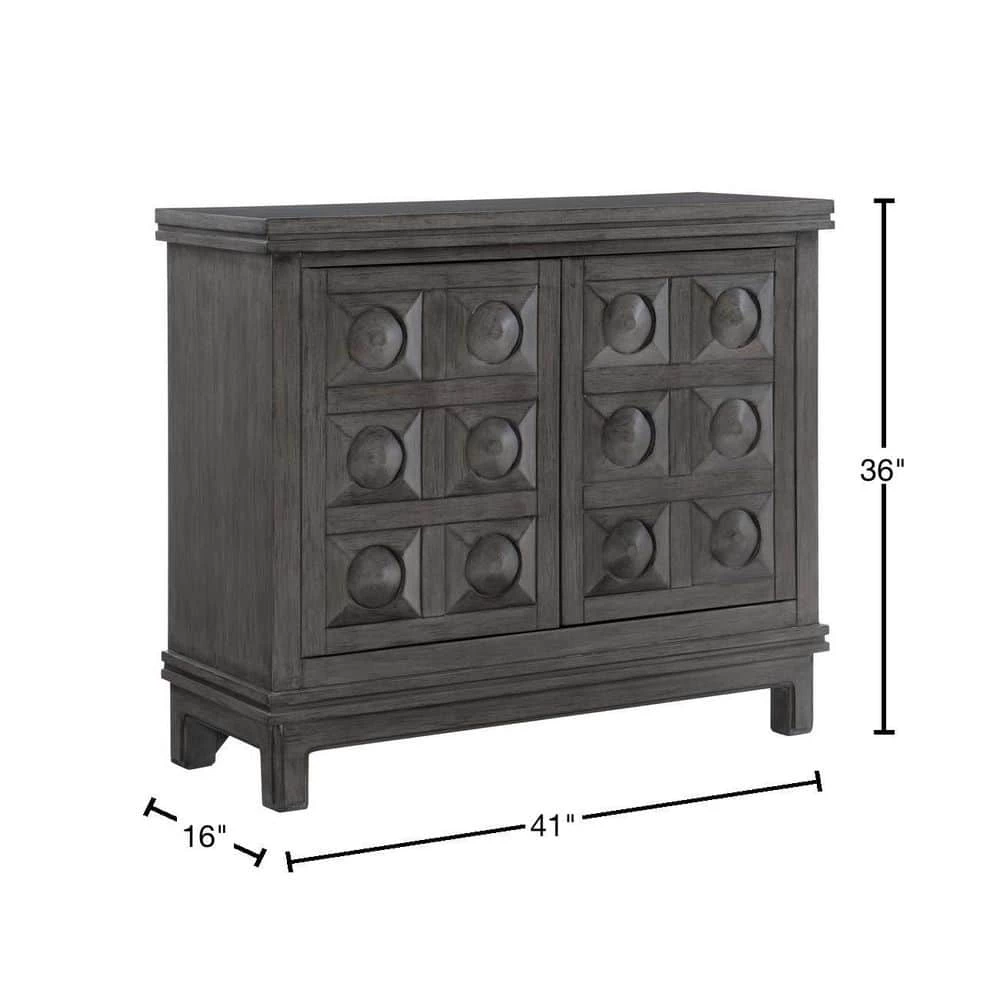 Dramatic raised and dimensional door fronts set this Ezekiel 41 in. W Grey 36 in. H Rectangular Wood Accent Storage Cabinet with Shelf apart. In a rich, multi step grey finish that provides an anchor piece for any room. Two large doors on hidden euro hinges, open to revel a fully finished storage area with a fixed shelf. Arrives fully assembled and ready to impress in a living room, dining room or entryway.
