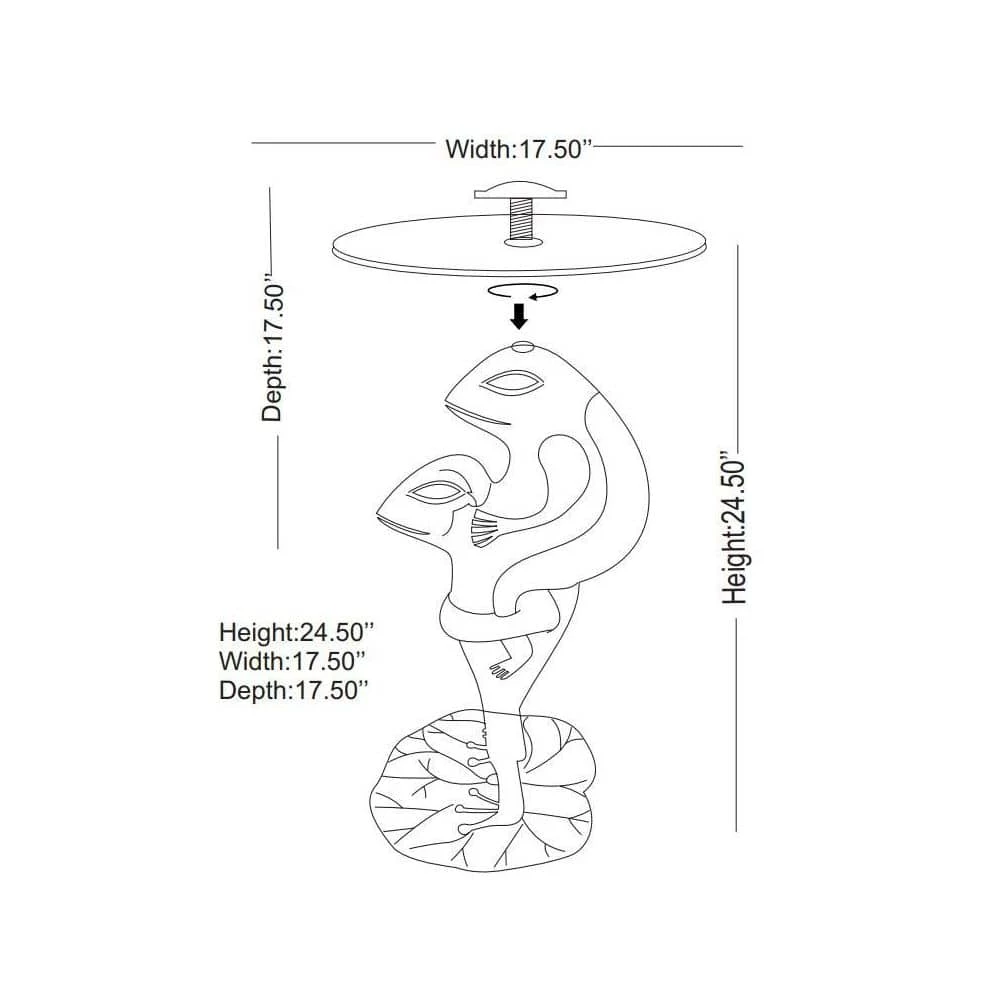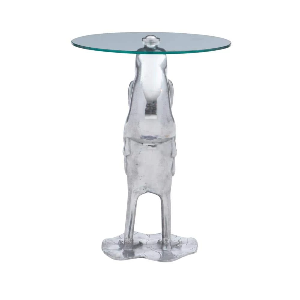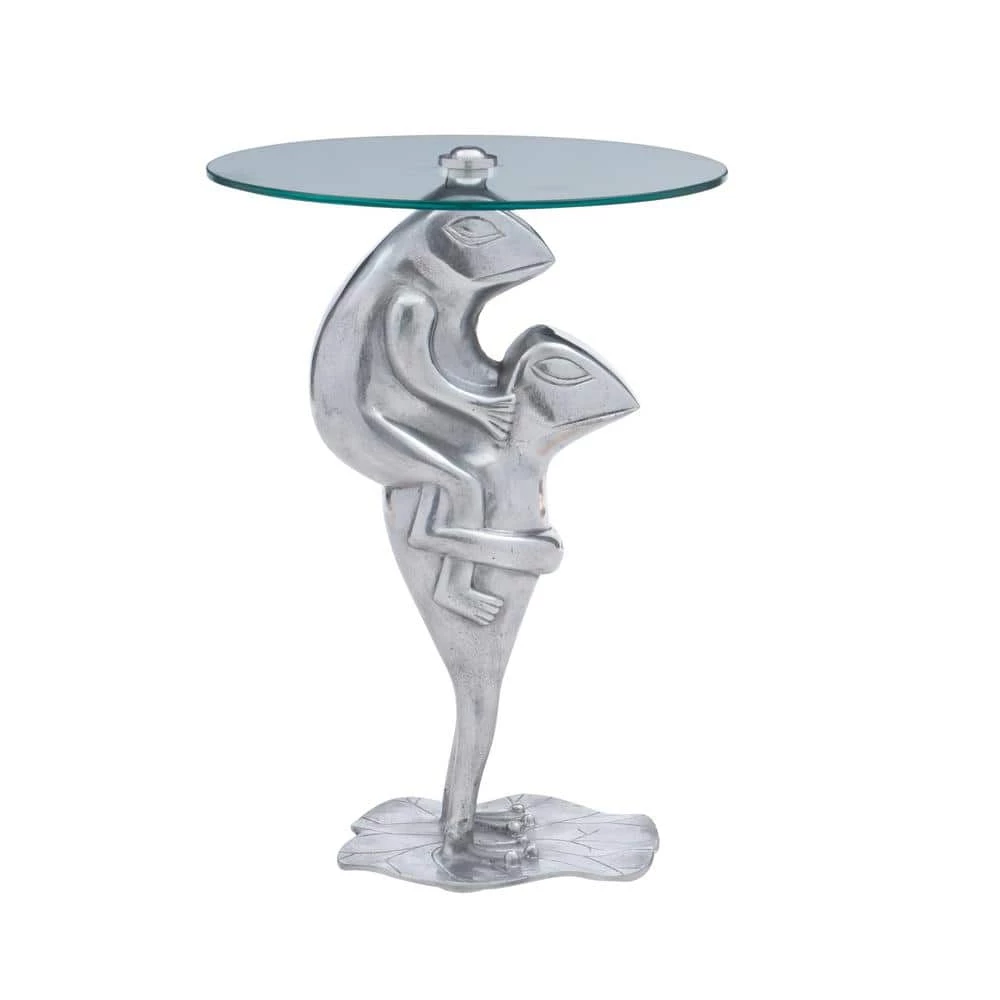 Hop on partner, we’re headed to a new pad. This outlandish side table is sure to turn heads and create smiles. The clear tempered glass top is 8 mm thick and supported by two sturdy frogs in the semi polished aluminum base, here to lend a hand through many a cocktail party. Measuring at 17.5 in. L x 17.5 in. D x 17.5 in. H, it fits perfectly next to a couch or set of chairs and is guaranteed to be the life of the party whether placed in a living room, foyer or home bar.