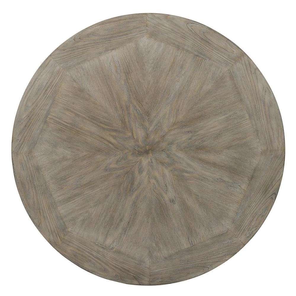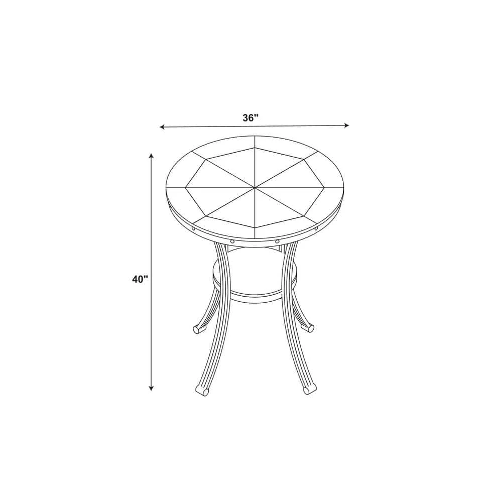 Dramatic grey wash wood inlay pattern on top of this handsome gathering height pub table is a conversation starter. Sturdy metal legs and frame are powder coat finished in a pewter and apron is accented with matching nail heads. Legs feature an elegant curve with a convenient middle shelf for extra storage. With a 36 inch round top that is 40 inch tall, this table provides casual dining for small space areas or a great place to gather in a den or family room. Matching barstools available.
