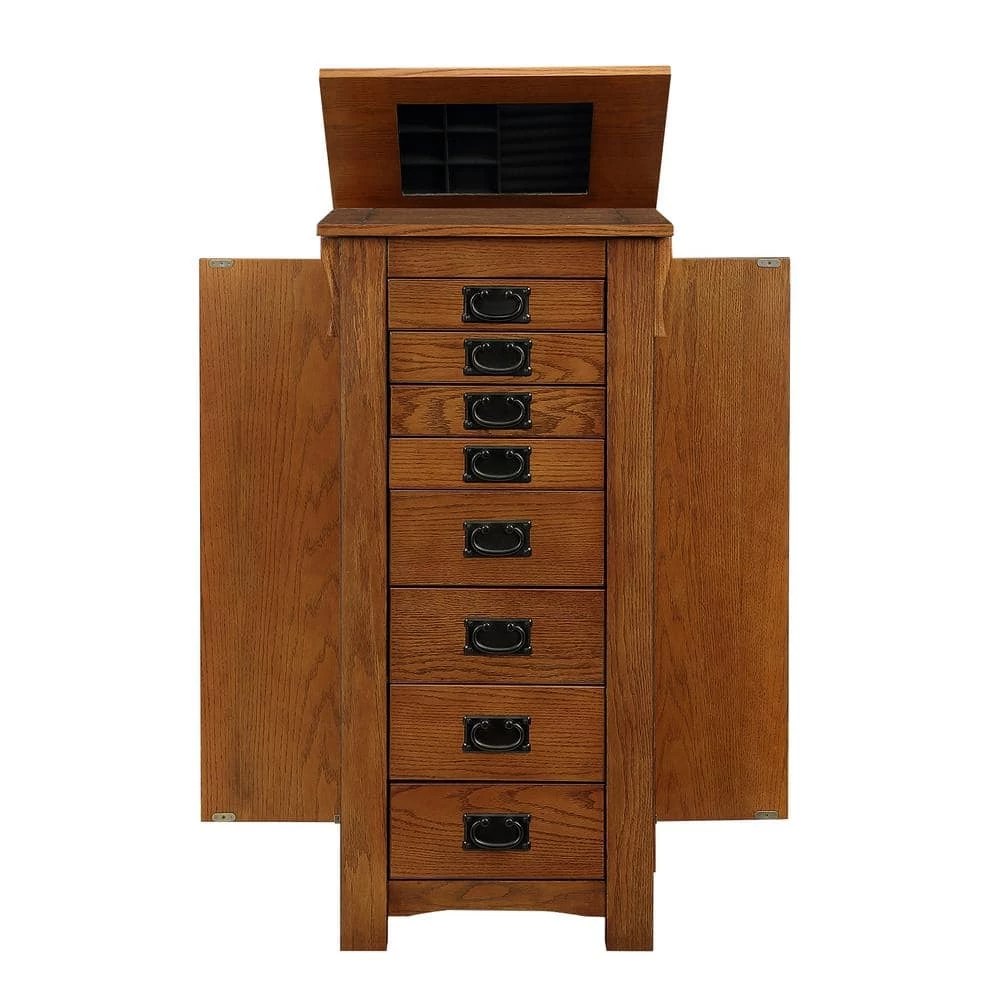 Free-standing Fremont Jewelry Armoire in “Mission Oak” finish with “Mission Gray” hardware provides the ultimate storage for all of your jewelry and accessories. Store your rings, earrings and more in the eight black fully lined drawers. Flip-top mirror opens to a black lined compartment. Touch latch side doors swing open to store chains. Minimal assembly, attach top only.
