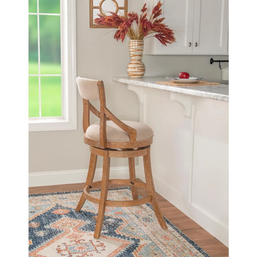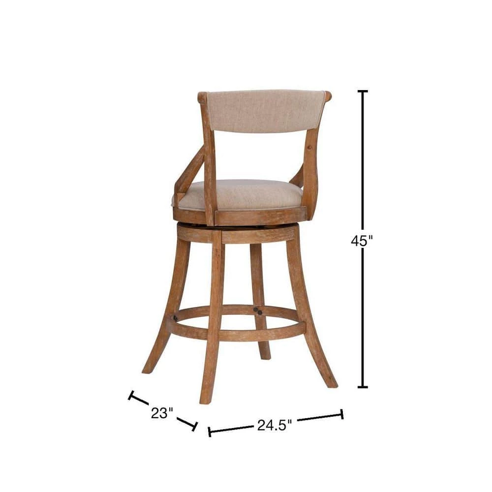 Designed with comfort in mind, this Gilda Brown Wirebrush Finish with Natural Linen Upholstery 31″ Bar Stool has an oversized padded seat and gently curved back, capable of holding up to 400lbs. The 360 degree swivel feature comes in handy and provides a full range of viewing with ease. Complete with a foot rest, this stool brings total comfort. Wood legs and frame are finish in a natural with whitewash accent. Upholstered using a 100% polyester linen weave fabric in a natural color. This barstool fits best with counters that are a minimum of 36″high.