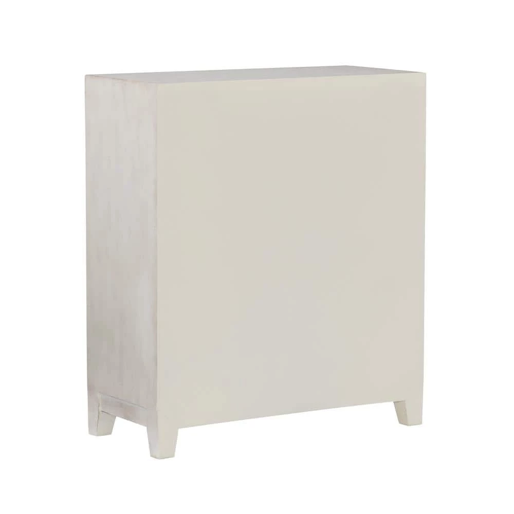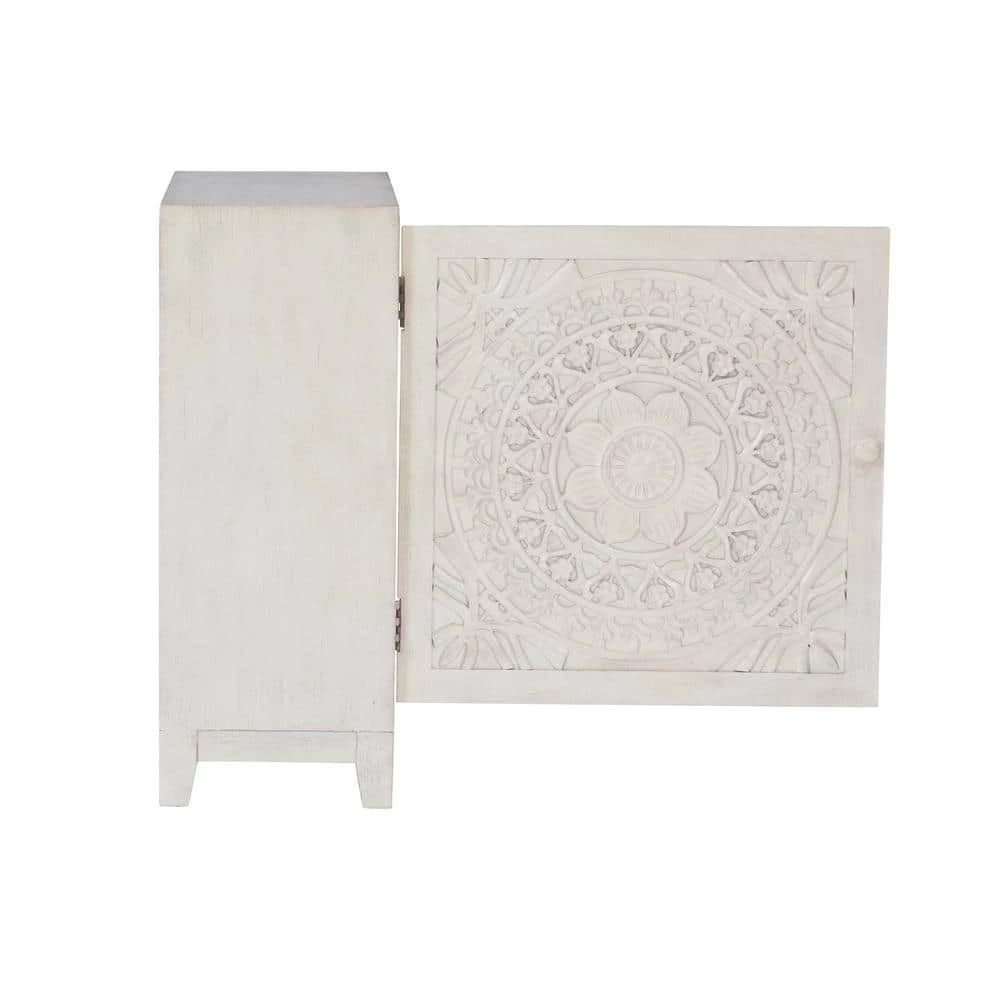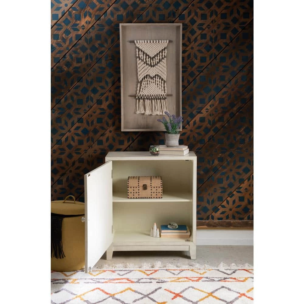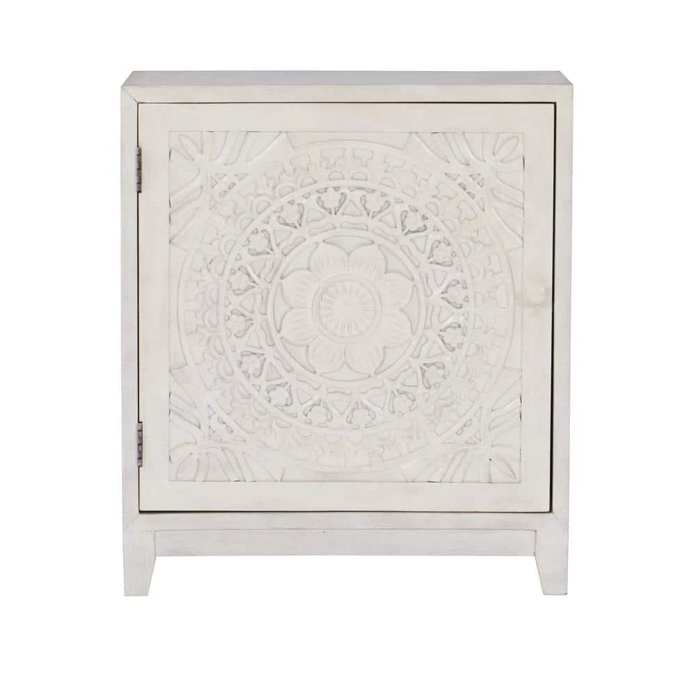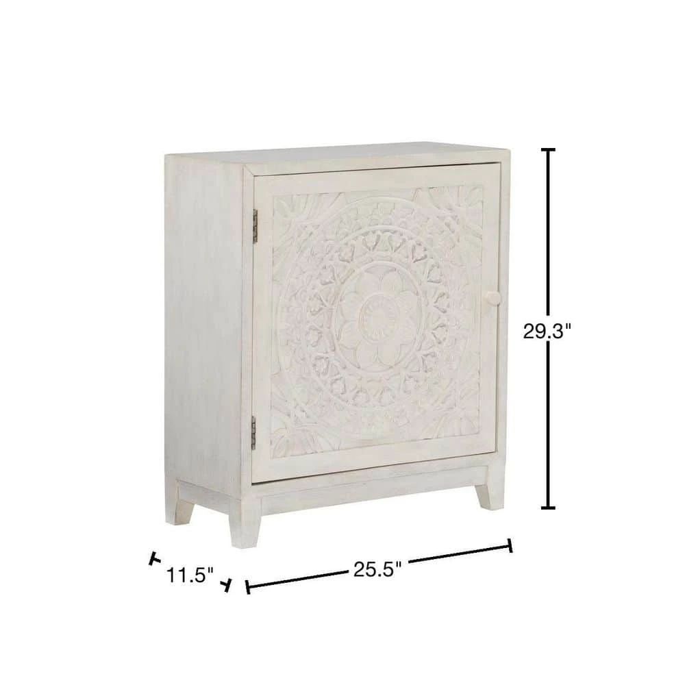With a modern rustic look, the Grace Cabinet is a lovely decor choice for any room in your home. The perfectly neutral white antiqued finish highlights the resin medallion front of the cabinet door. The door opens to one fixed interior shelf for storage and organization. The round wooden knob and short, straight legs bring finishing touches to this sophisticated piece.
