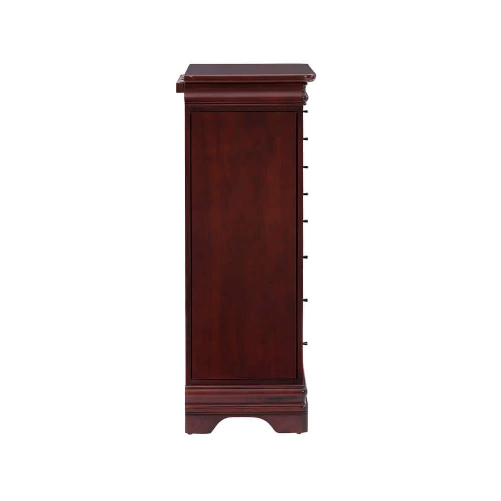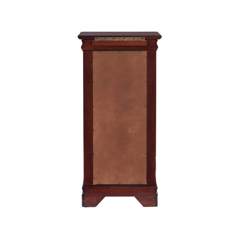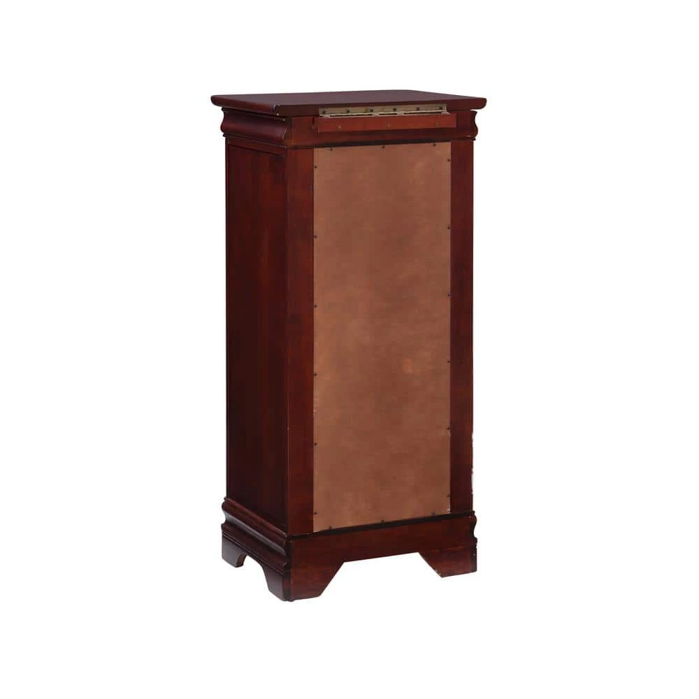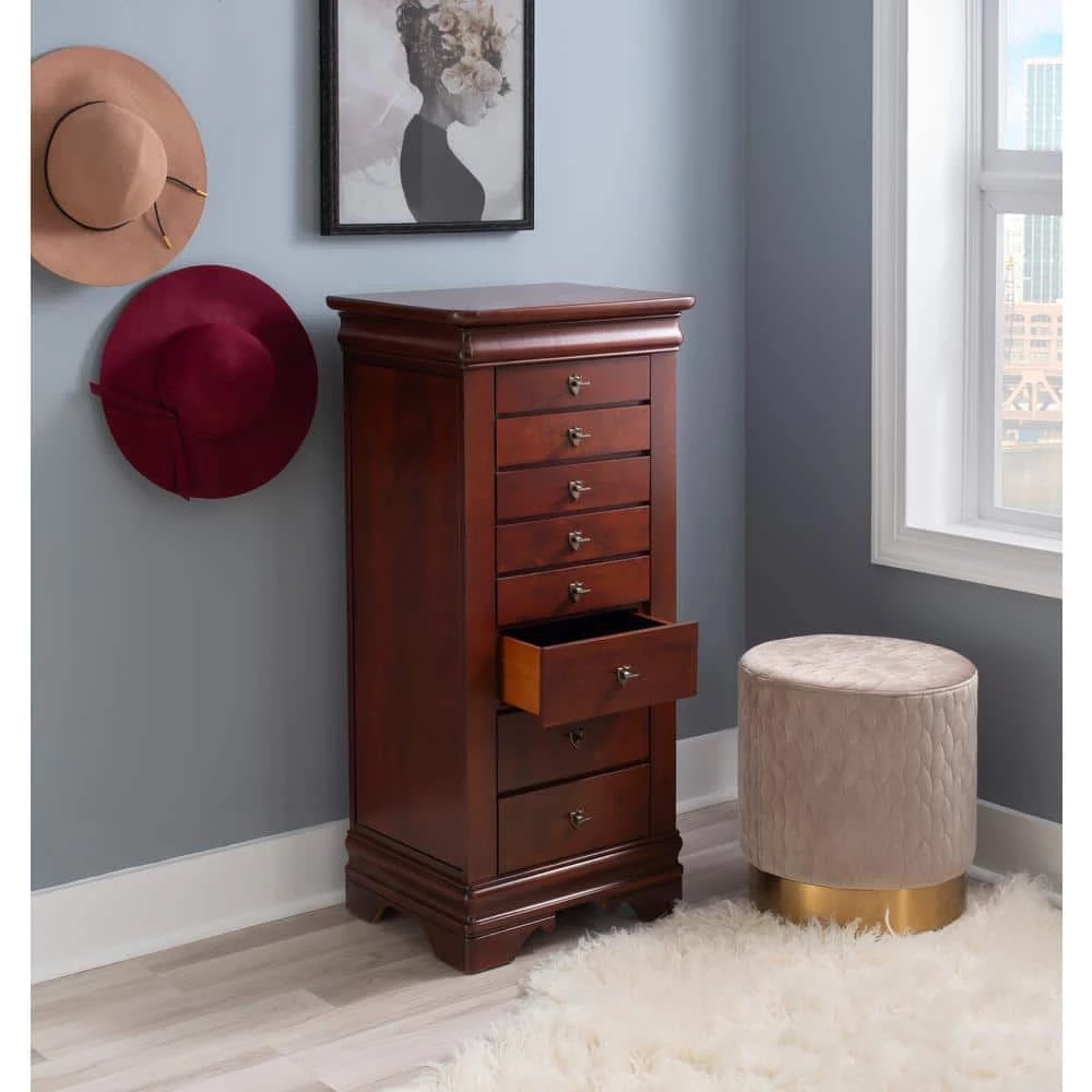 Free-standing Greta jewelry armoire in Marquis Cherry finish is accented with classic Louis Philippe features. Flip-top mirror opens to a lined and divided jewelry compartment. Touch latch side doors swing open to reveal necklace hangers. Eight lined drawers for jewelry and accessories. Lining is plush black and drawer pulls are shaped as a shield of honor in antique brass finish. Minimal assembly, attach top only.