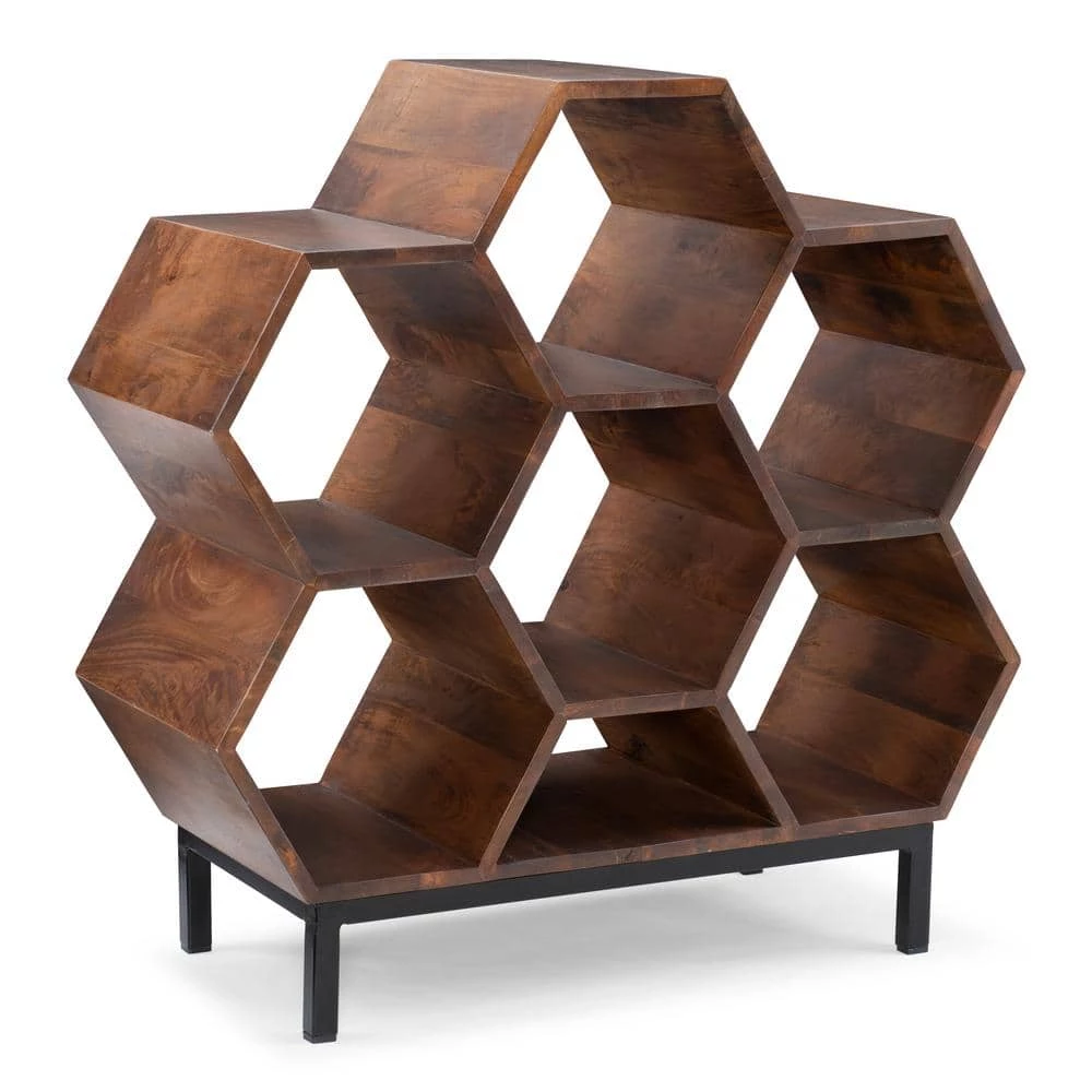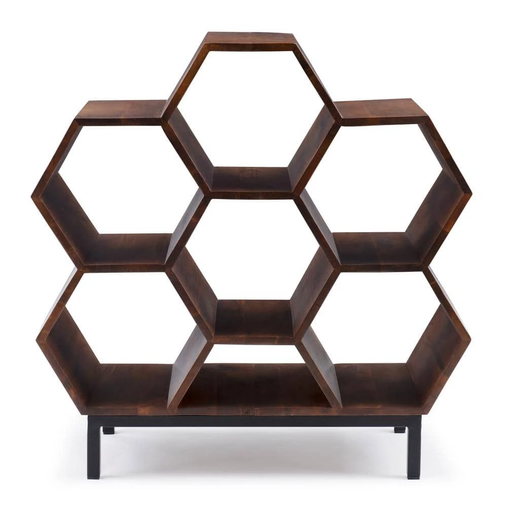With its unique geometric shape and warm hazelnut tones, this one-of-a-kind Honey-comb bookshelf is sure to be the talk of your home. Function and form perfectly harmonize with six and a half cubbies for books or trinkets to give it your own personal touch. Black iron legs give this piece the strong groundwork to facilitate an incredible 300lb weight limit while adding a touch of mixed media to perfectly balance this design. No assembly needed. Just open the box and you’re ready to go!