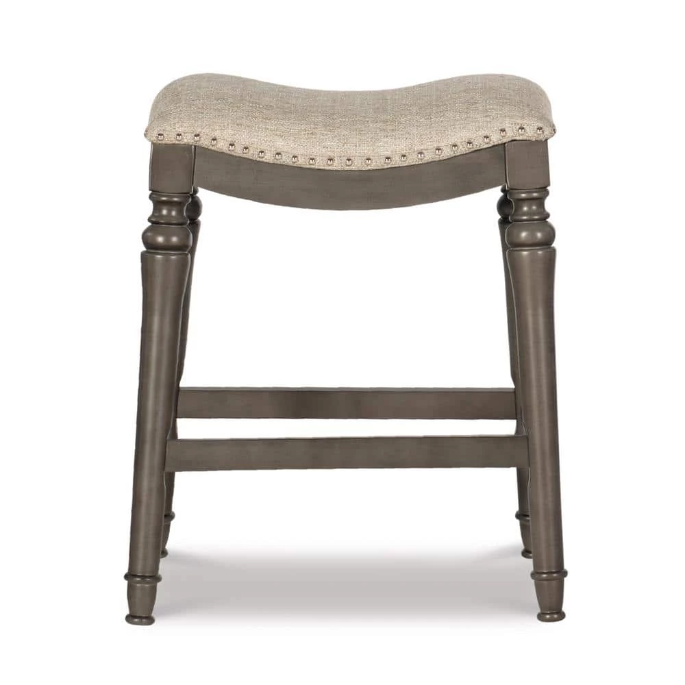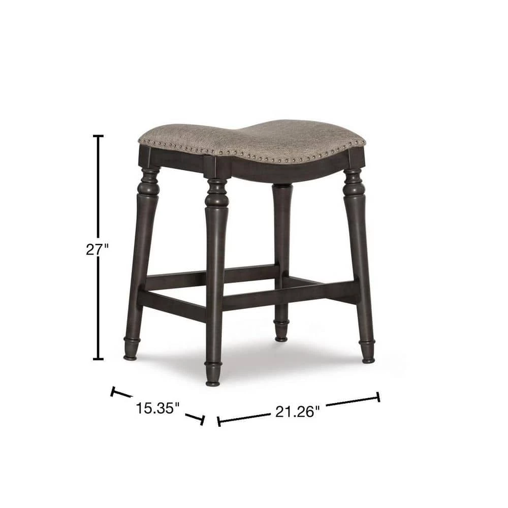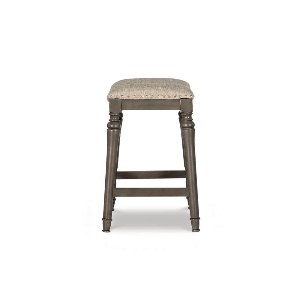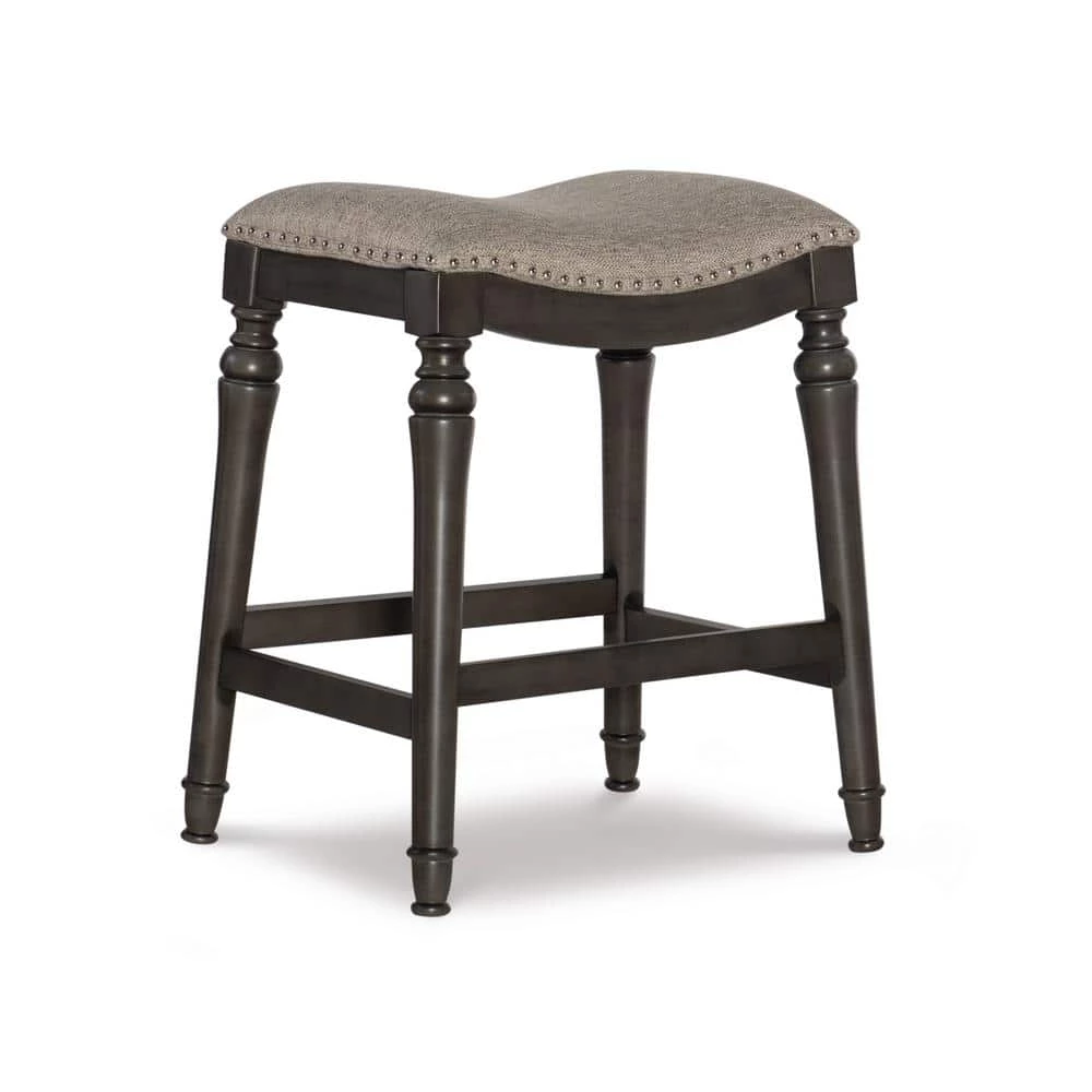 The backless Hynes Counter Stool revitalizes the familiar lines of timeless design with comfort and cost in mind. The 275 lbs. weight limit stool comes in a stylish grey finish and is made out of rubberwood. Individually placed chrome nail head detailing border. A grey fabric seat tops off this counter stool.
