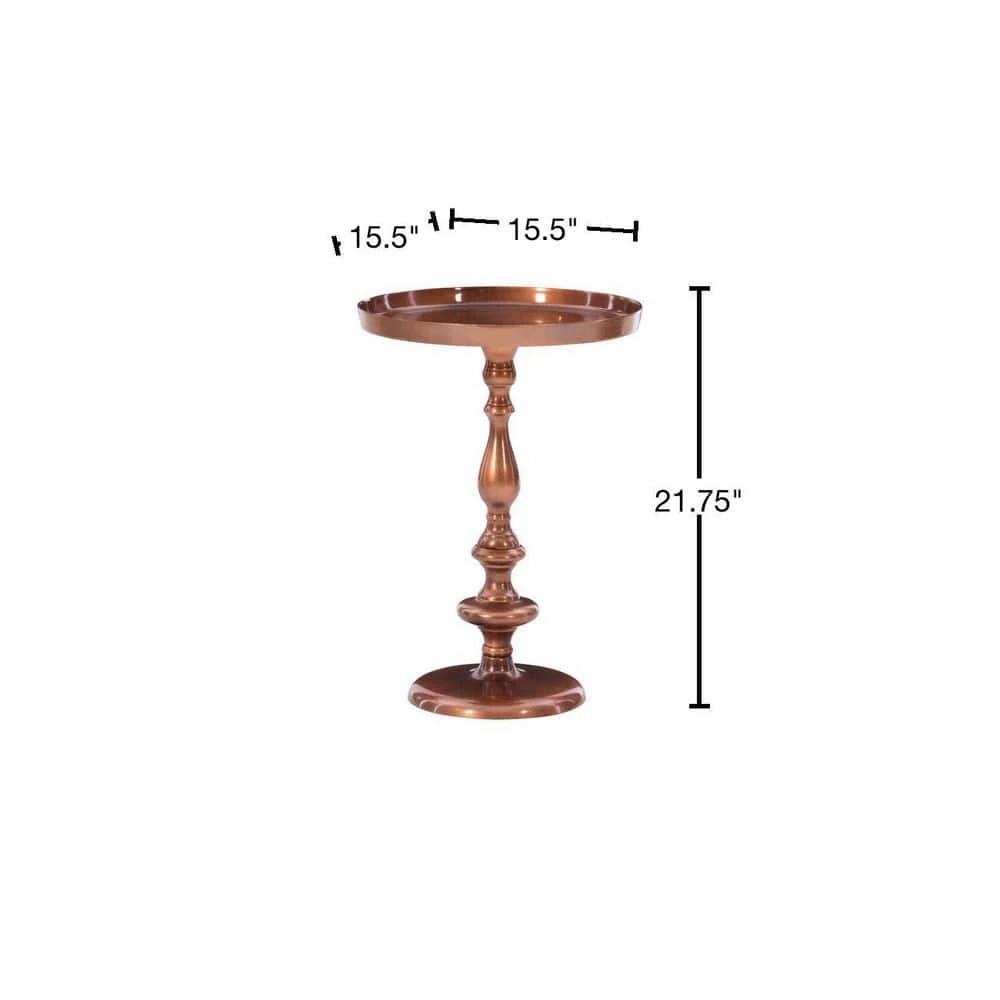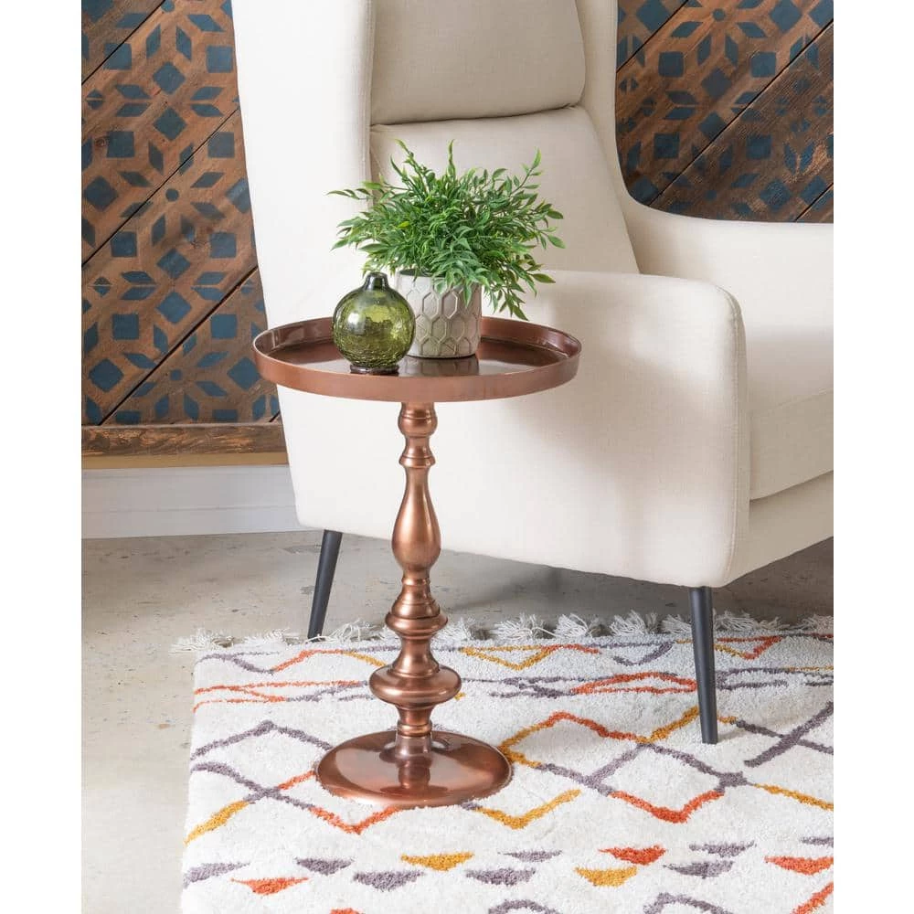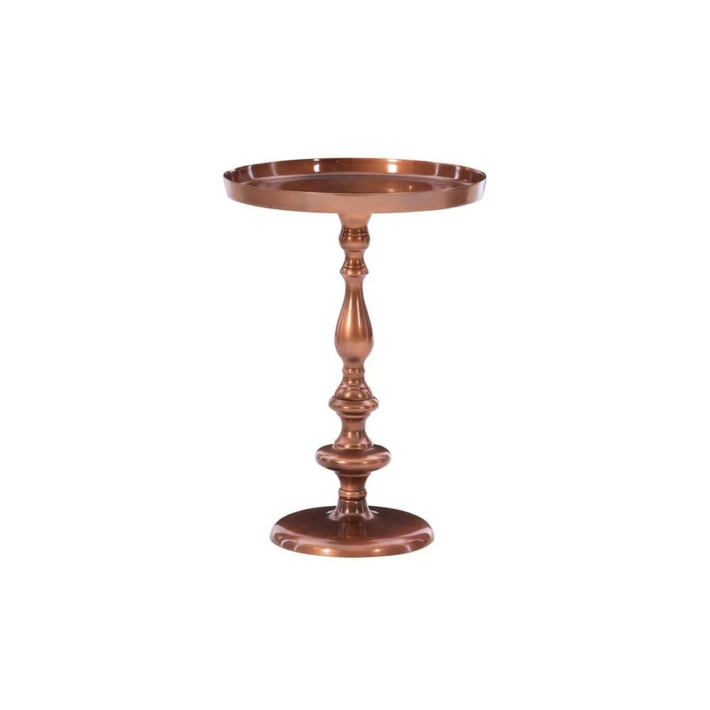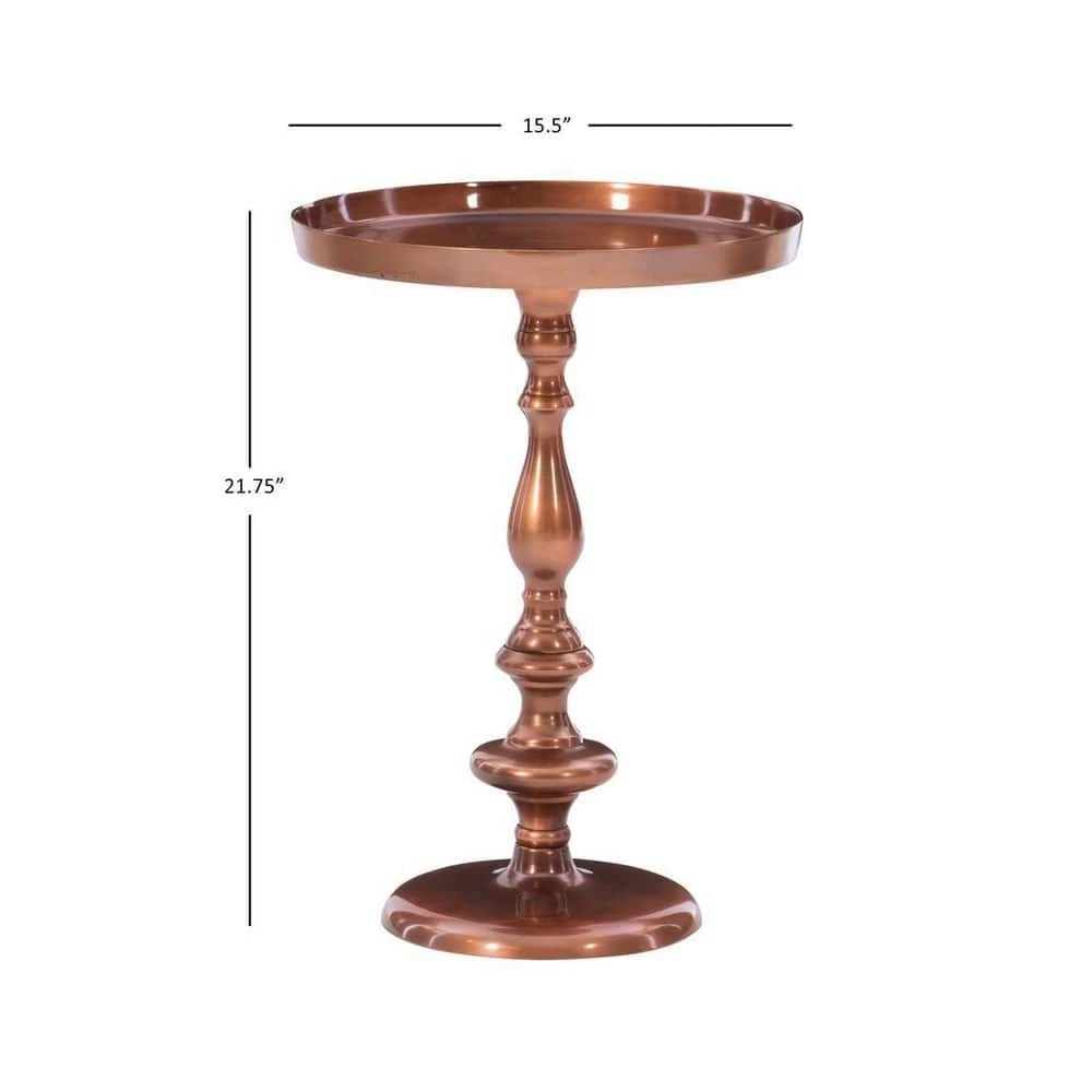 Add a classic look to any room in your home with this stunning Jhana Copper Metal Side Table. Crafted to resemble a traditional candlestick, the gleaming antique copper finish combines modern style with vintage appeal to complement virtually any decor. The recessed tabletop is a perfect perch for a tray of drinks or a potted plant. Nestle between two chairs, at your bedside, or use as an elegant bathroom stand. From glam to bohemian, this will be a versatile addition to your furniture set whatever your style.