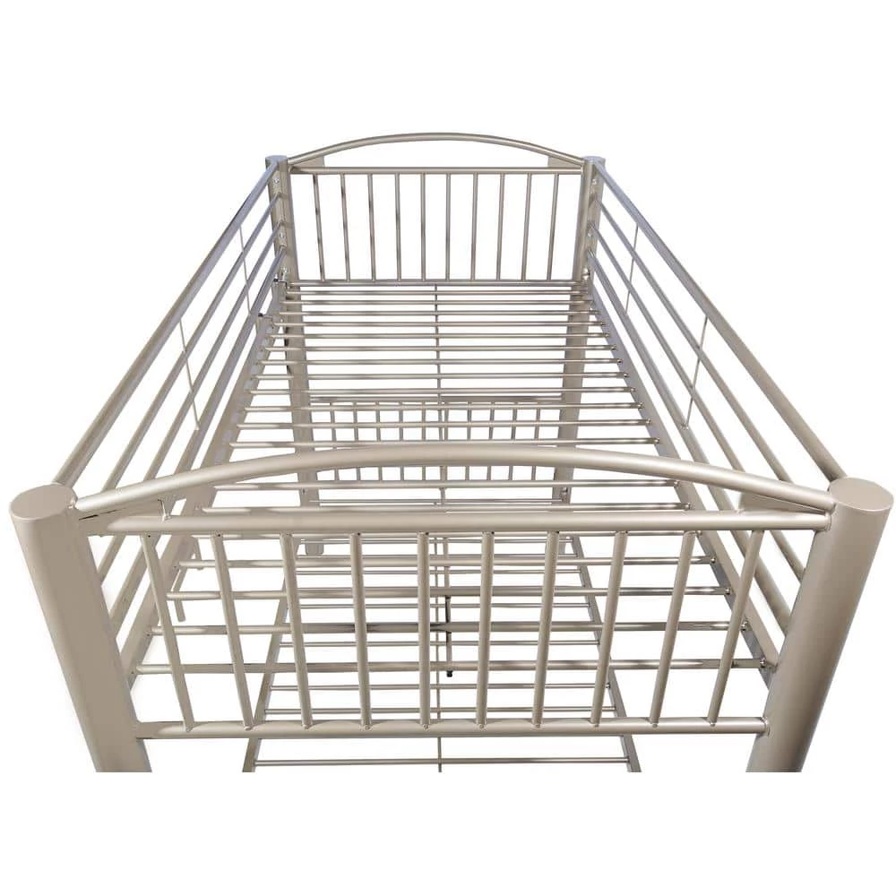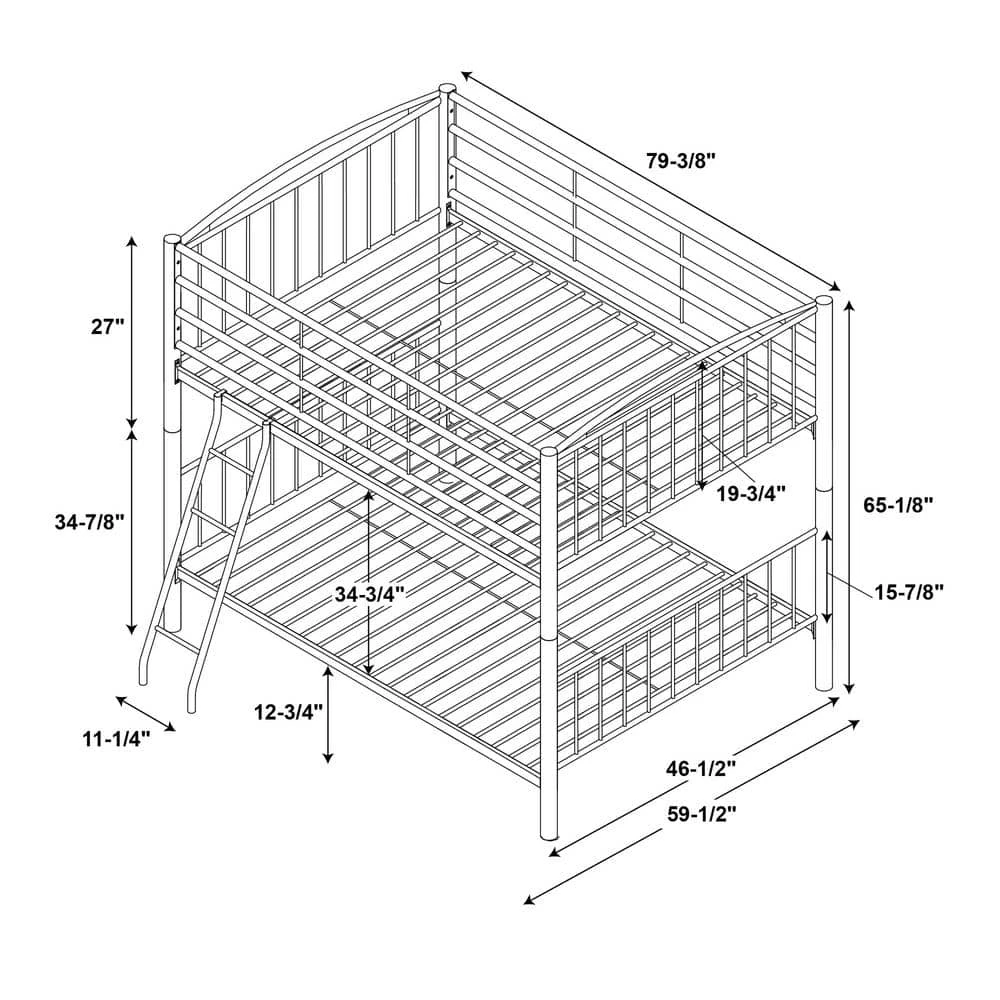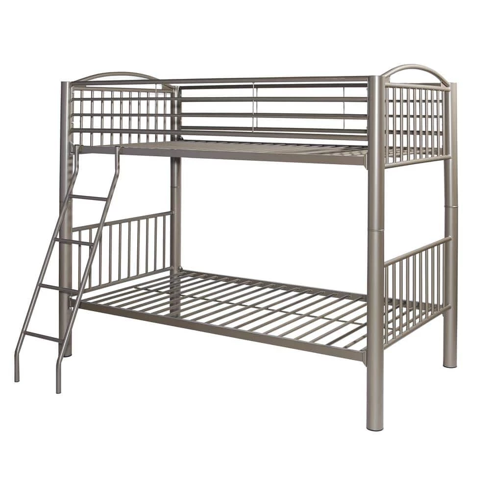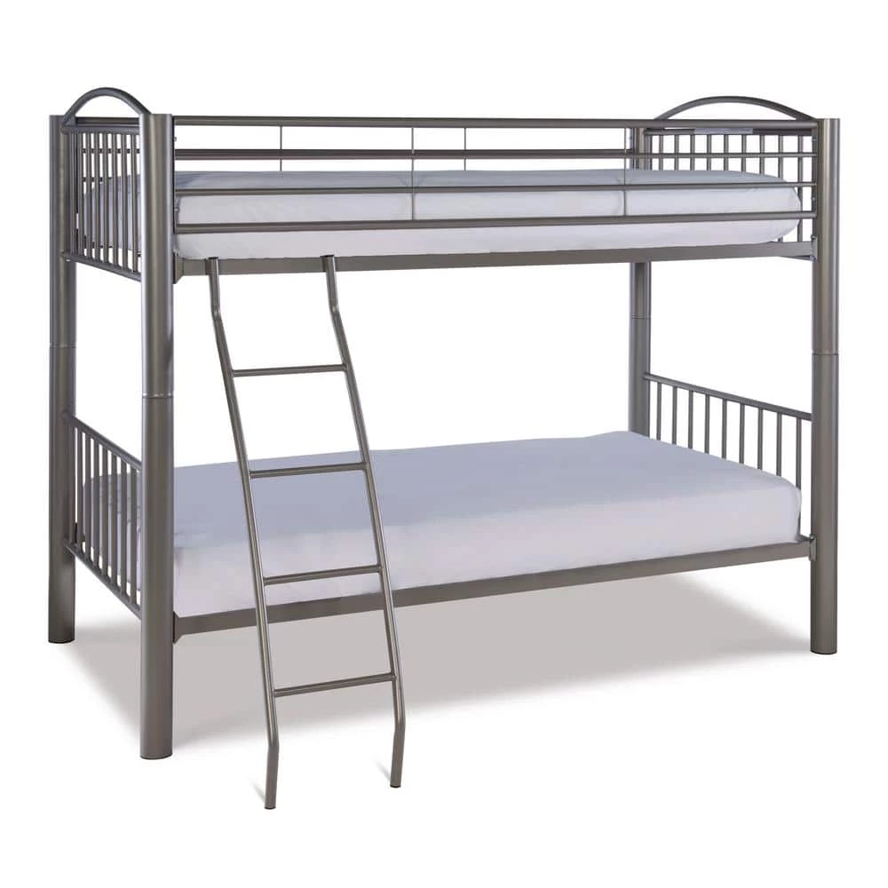 The Jordan Collection is made to withstand all of the adventures and pressures of a youth environment. Crafted of Pewter Metal, this piece easily complements the ever changing dcor of a child’s room. Two beds in the space for one, this piece features a twin size bed above a twin size bed. A sturdy step ladder provides easy up and down access to the top bunk. Some assembly required.