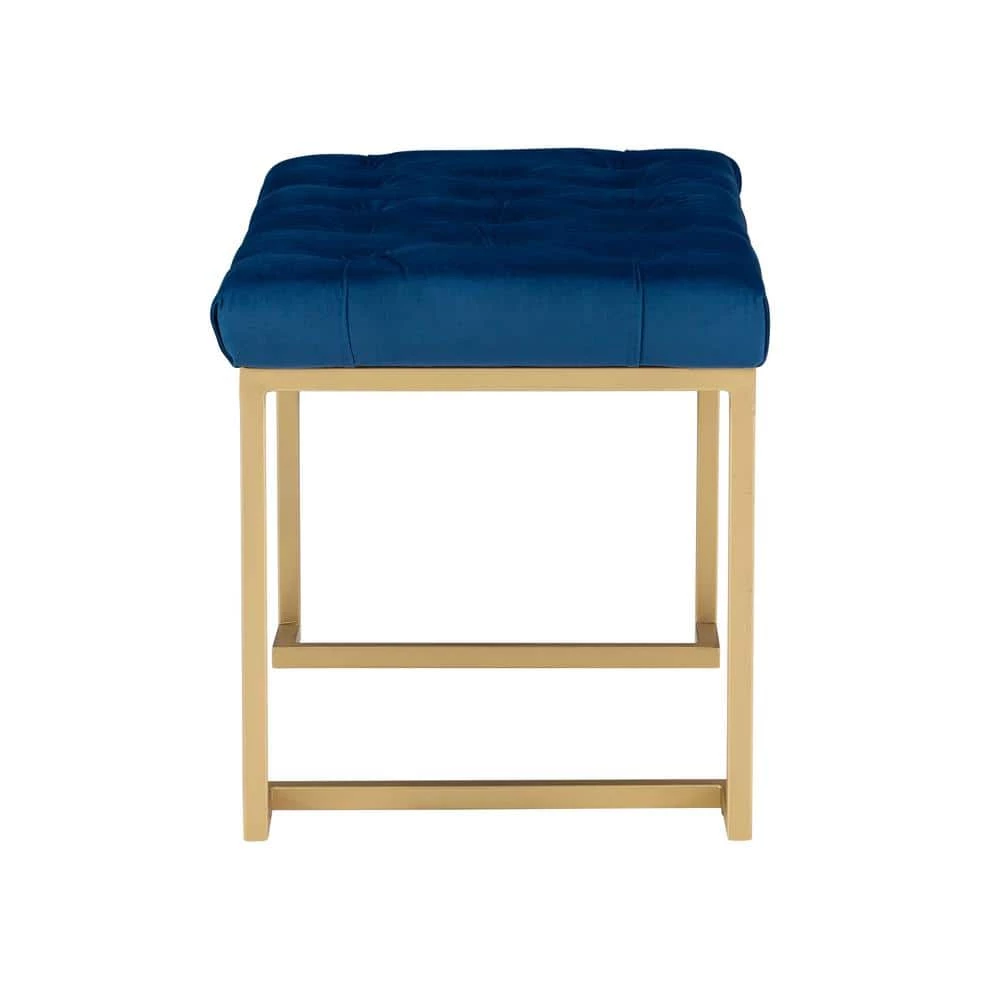 A plush cushion is upholstered in navy blue velvet to create the regal aesthetic of this Kelli Navy Upholstered Bench with Gold Metal Legs 18″H x 26″W x 16″D. The iron frame is finished in a gold powder coating that shines in the light and pairs wonderfully with the tufted seat. This royal color scheme, fit for nobility or the humble furniture enthusiast, is sure to bring new excitement to your gallery, sunroom, living room and the like. The piece arrives fully assembled and supports up to 300 lbs.