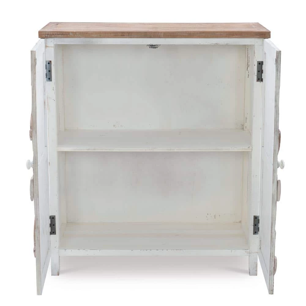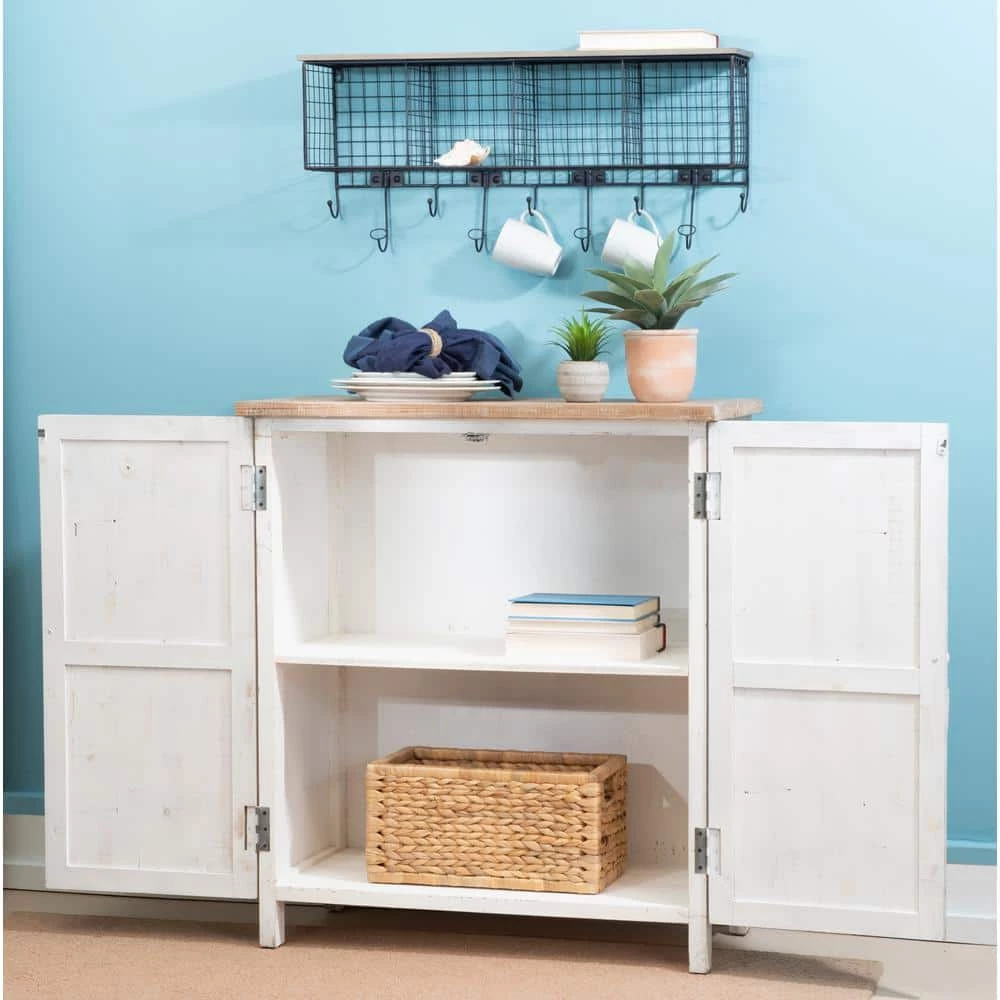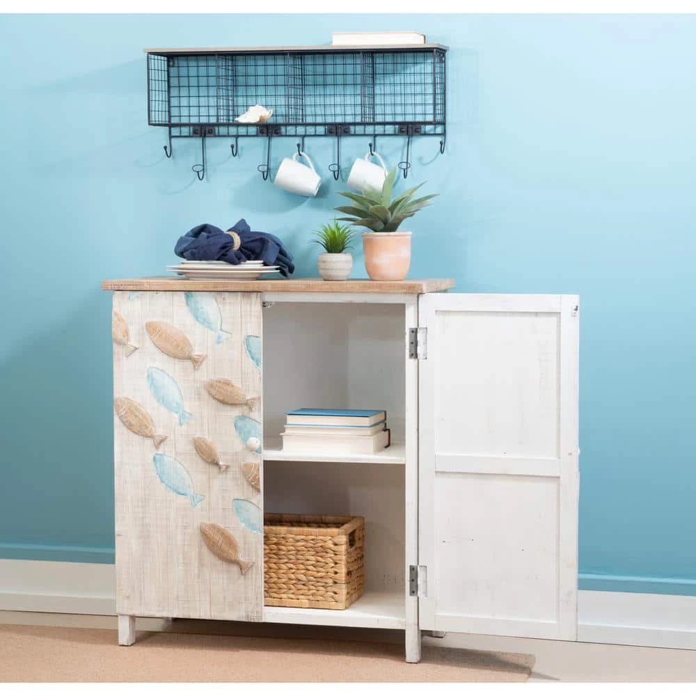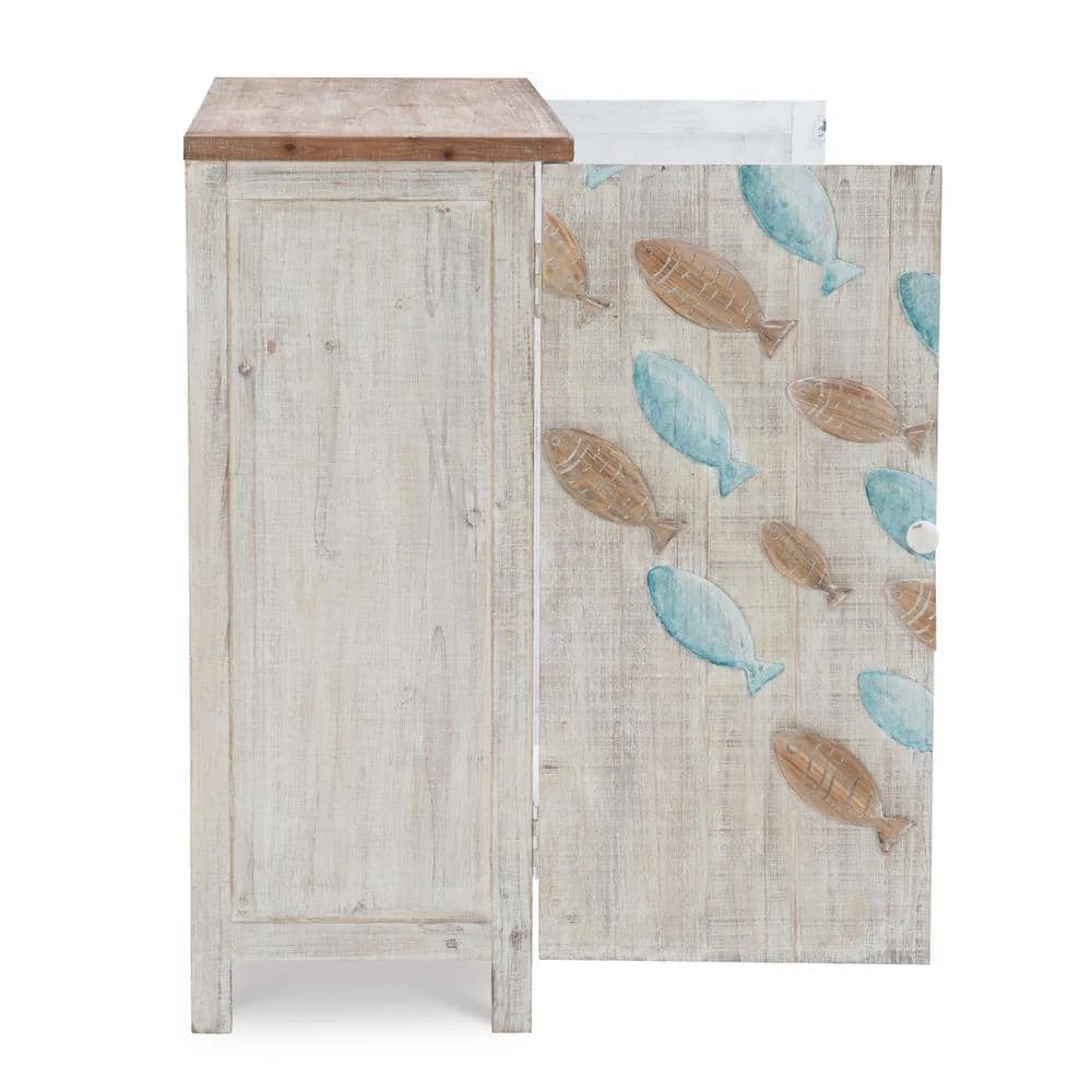Keyes Distressed 2-Door Cabinet with Fish Accents features a school of fish depicted in both carved 3D wood forms and hand painted versions. An overall ocean weathered, white wash and natural look provide a found treasure feel. 2 doors open to revel a large storage area with a fixed shelf. Arrives fully assembled and ready to add to your bedroom, kid’s room, living or family room. Ideal for a beach cottage or coastal themed room.