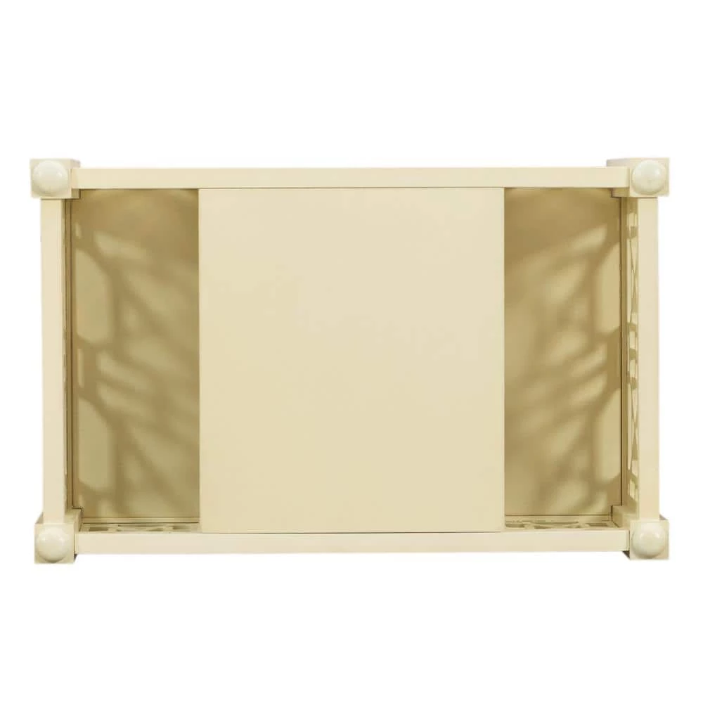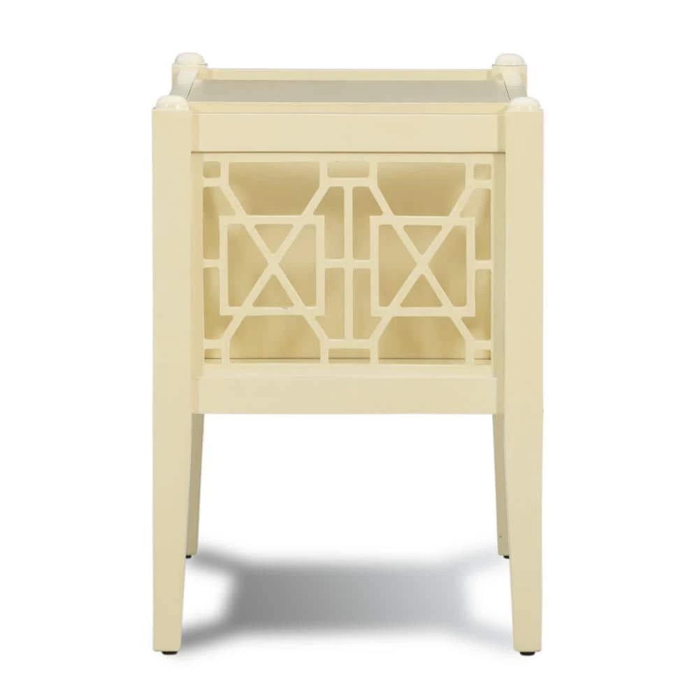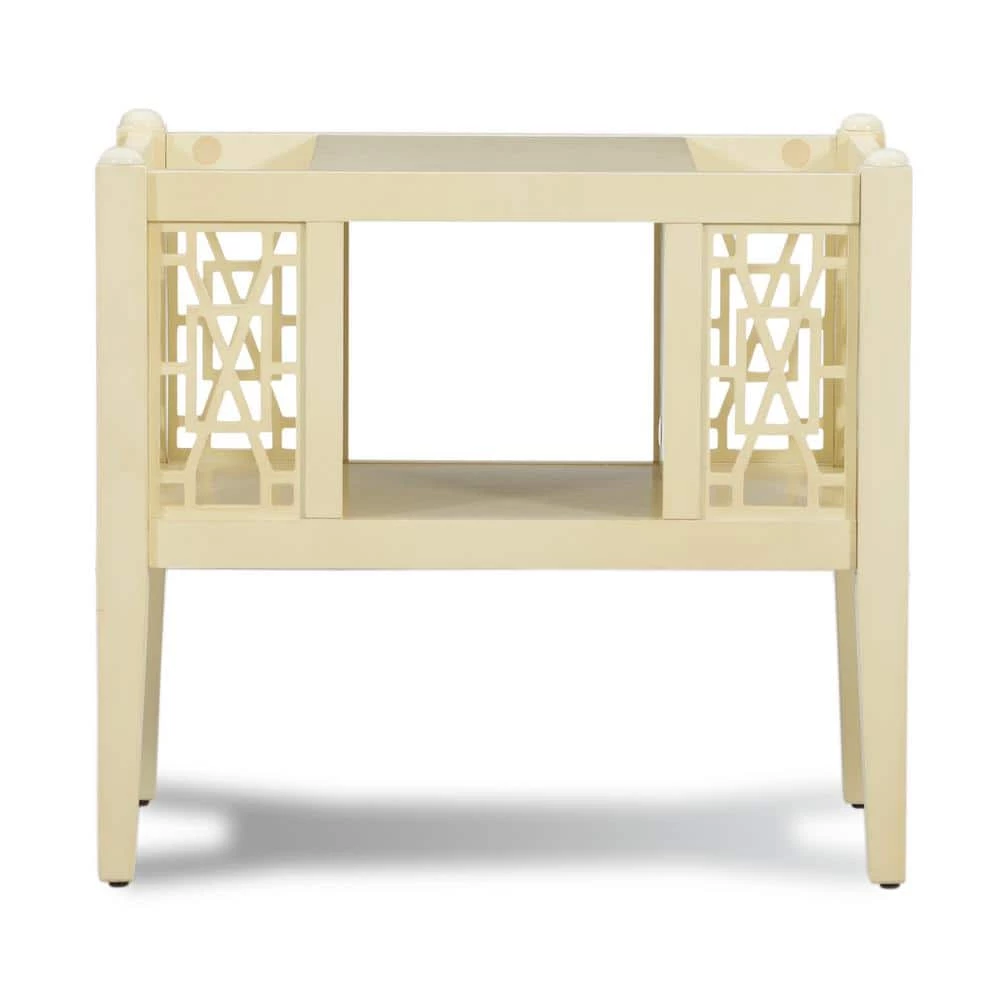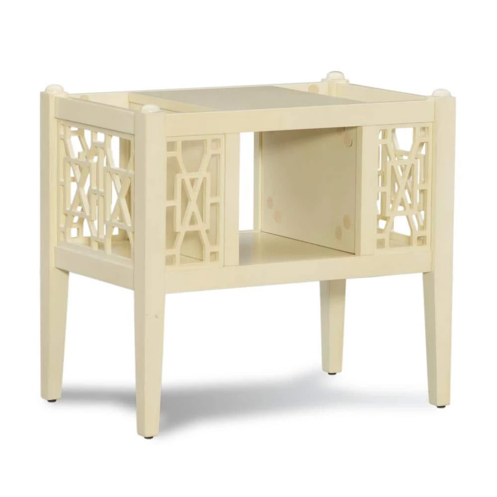Kinzlee Cream Magazine Table offers updated design with classic function. Sized to fit easily next to a sofa or chair, the Layla table has an open shelf in the middle and storage space on either side for a tablet, laptop, magazines, or pillows. Open fretwork design runs down either side for added charm. Neutral cream finish.