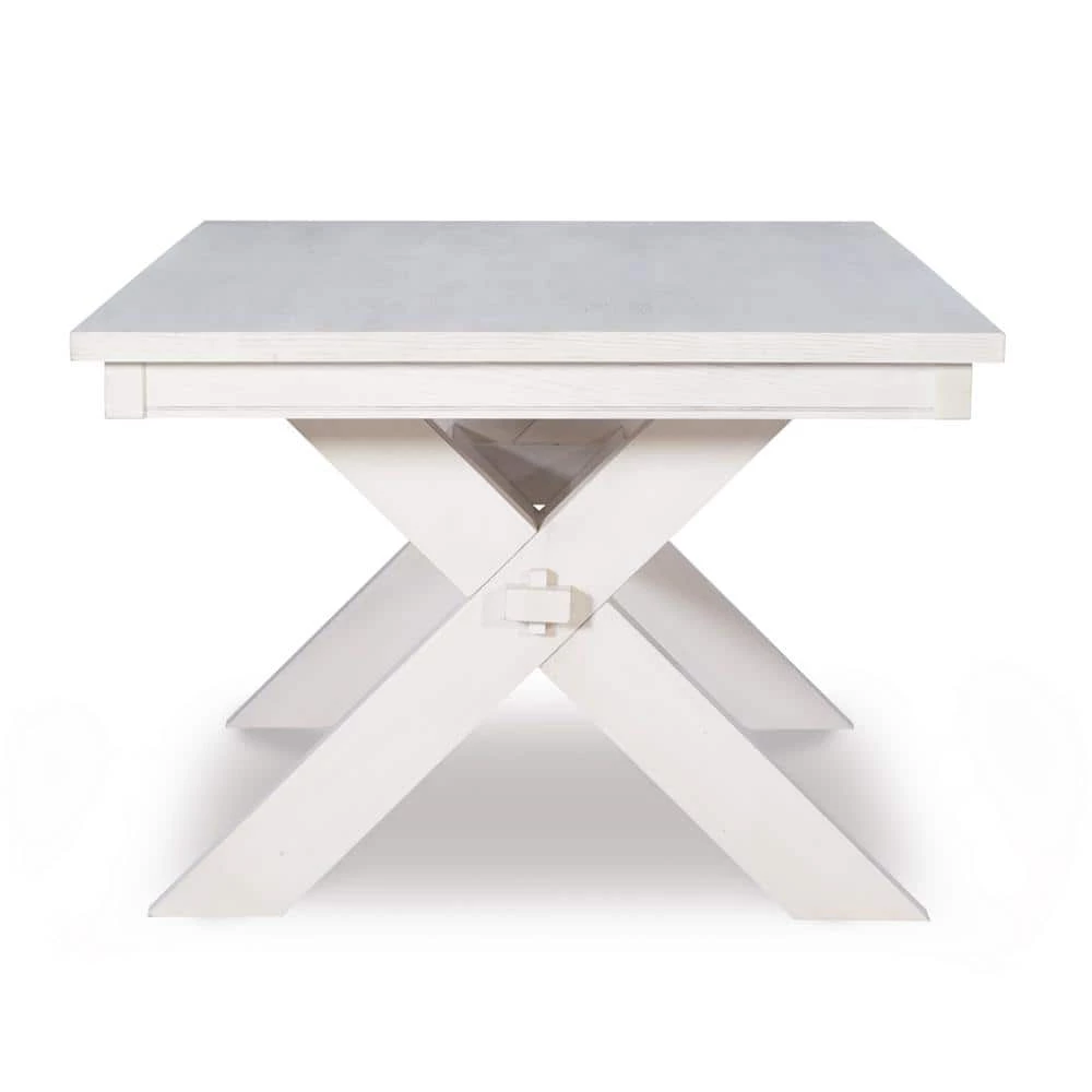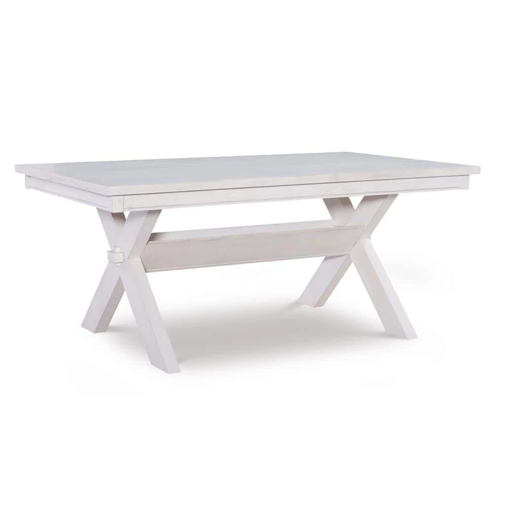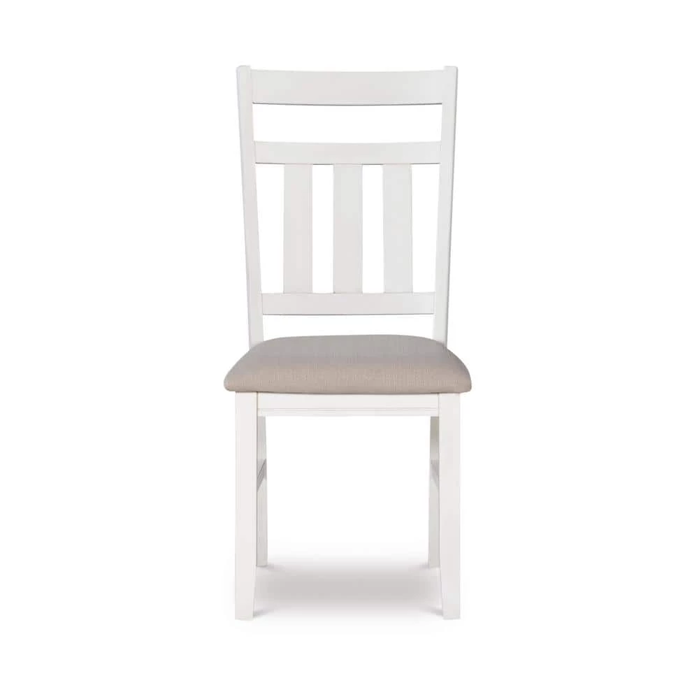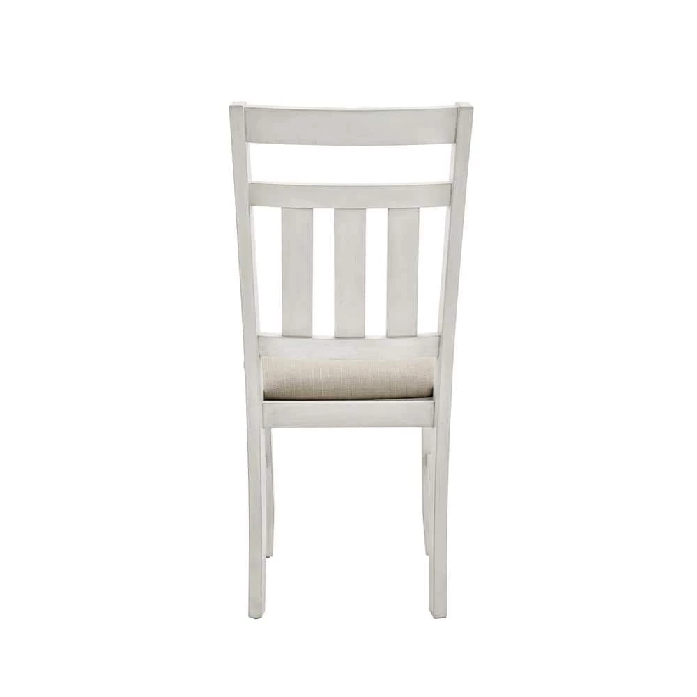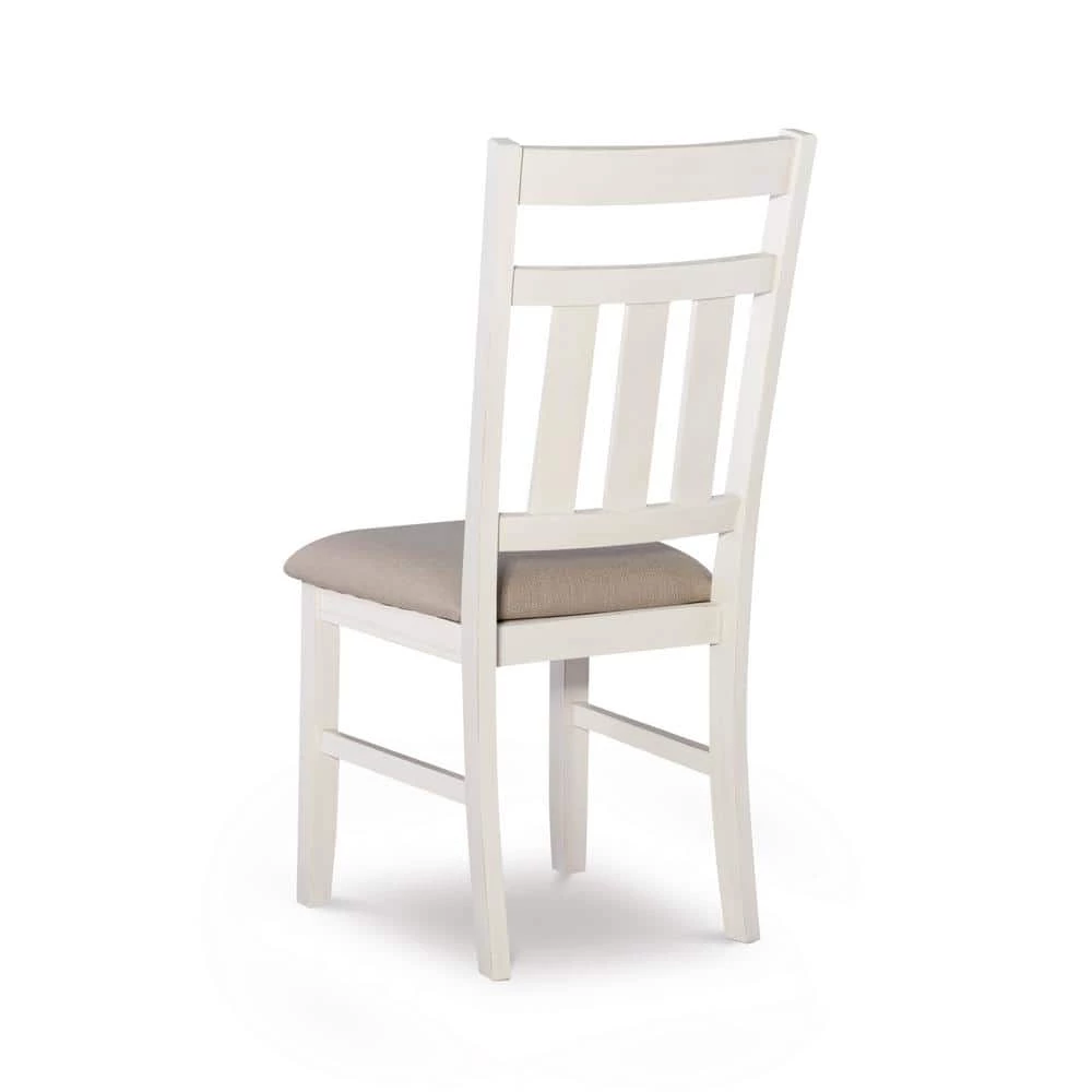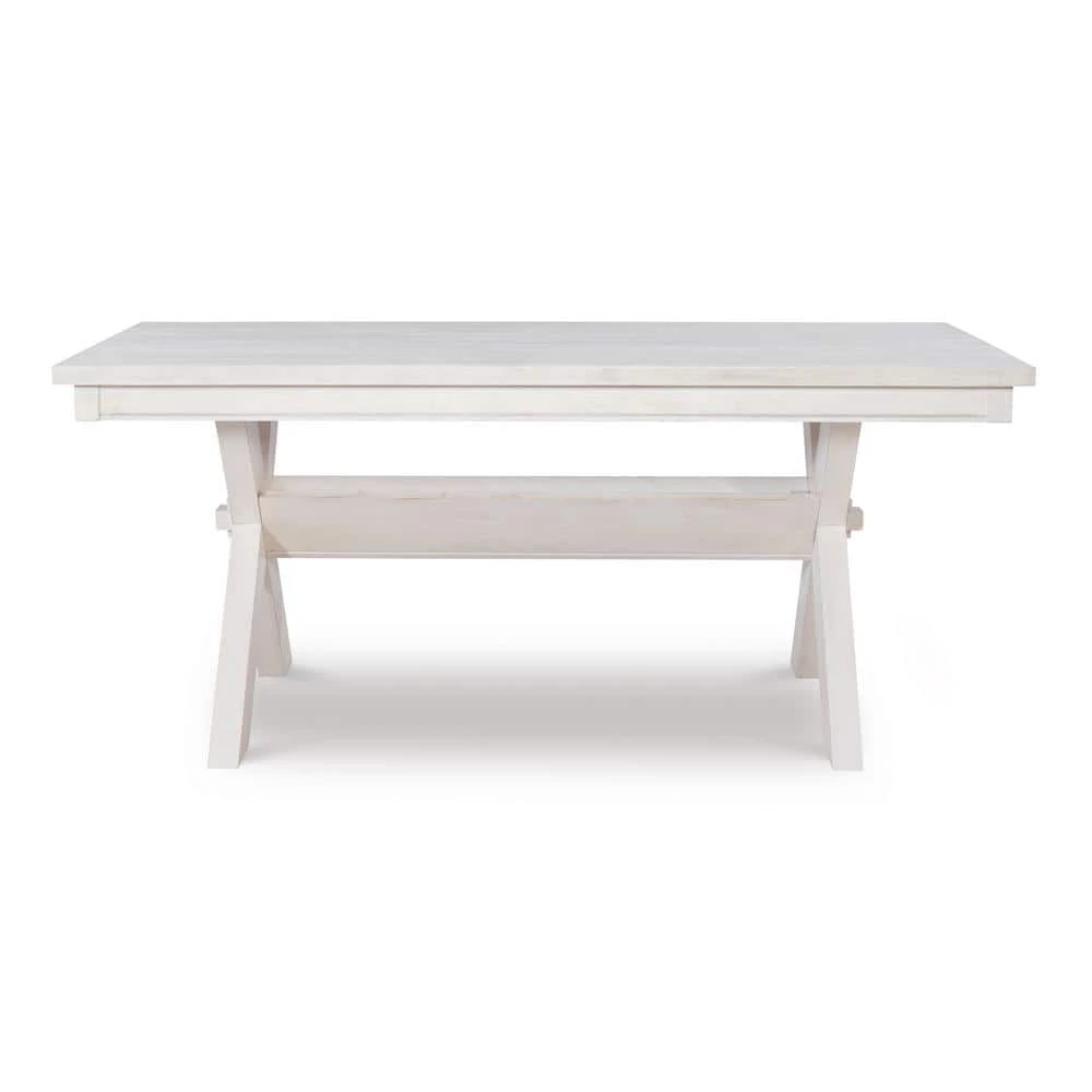 Gather around this handsome five-piece dining set featuring a timeless trestle table and four matching chairs. Constructed from rubberwood with a rustic ash wood veneer, this table brightens any space with its distressed white finish and beige chair upholstery. Neutral hues suit any color scheme while the padded upholstery ensures premium comfort. By balancing durability with inviting farmhouse style, this set offers long-lasting beauty for years to come.