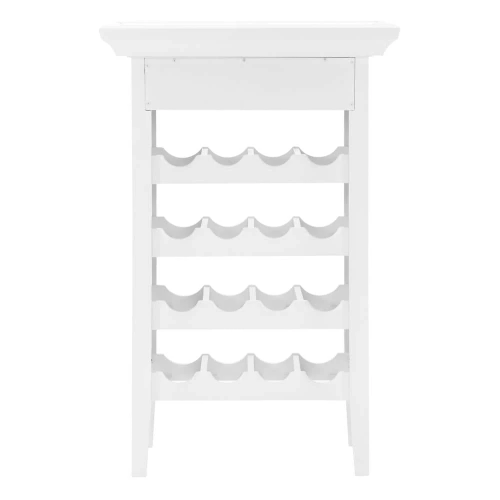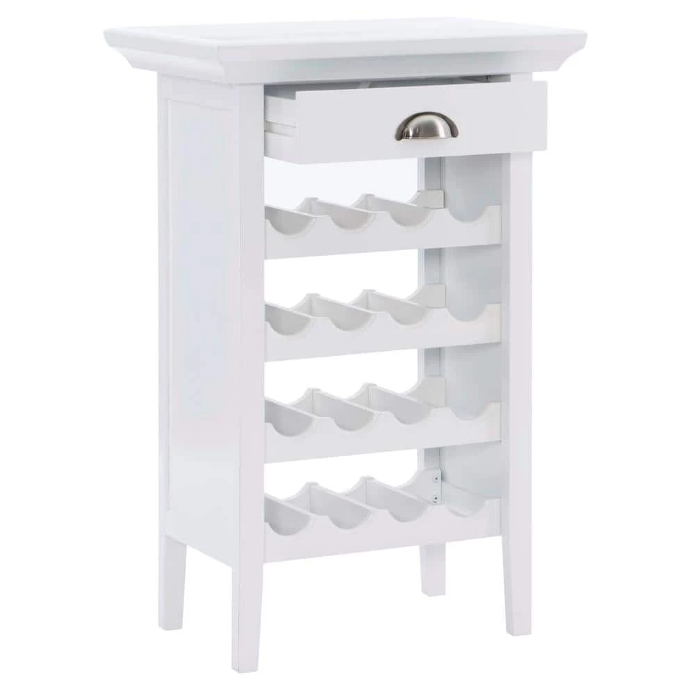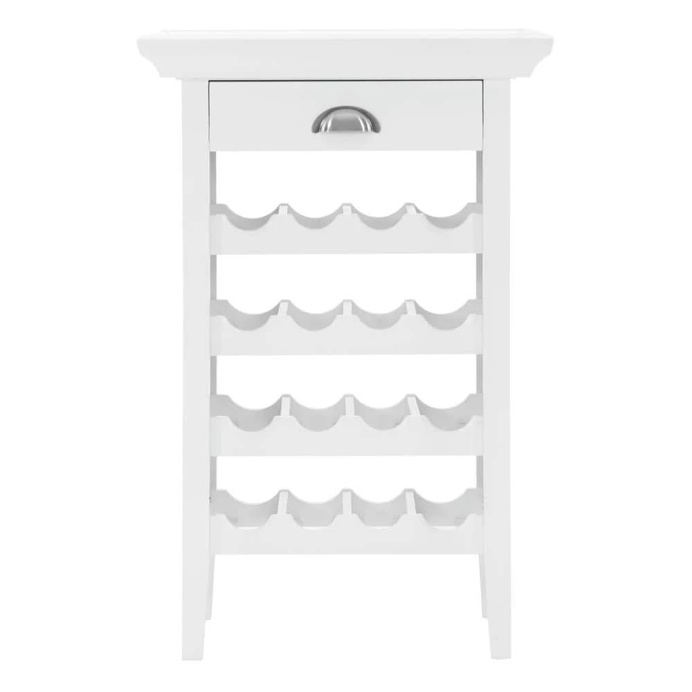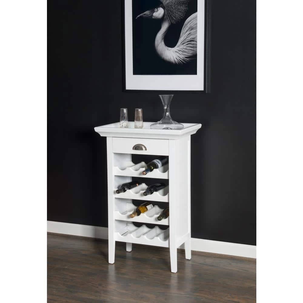 Show off your wine collection and be ready to enjoy serving your guest in style. The Lucille White Wine Cabinet holds up to sixteen standard size wine bottles in the perfect storage position. A handy drawer organizes your bottle opener, napkins and other serving essentials. The top is also a removable serving tray. Prepare everything on top and then it is ready to bring the service right to your friends and family. Finished on all sides in a semi-gloss white with a silver drawer pull to complete the look.