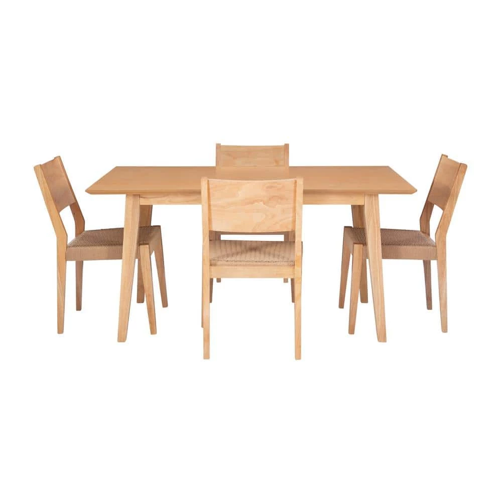 This elegant Marlene Natural Modern 5 Piece Dining Set with Woven Rope Seats is the perfect centerpiece for family gatherings and meals. The sleek silhouettes embody the grace and simplicity of the classic design movement, while handwoven rope seats help to evoke a more rustic and welcoming atmosphere. The set includes a 36 in. x 60 in. table with a beautiful rubberwood veneer that provides plenty of tablespace for 6, as well as 4 or 6 chairs, each with the comfortable basket weave pattern. All pieces are made of solid wood for long term durability.