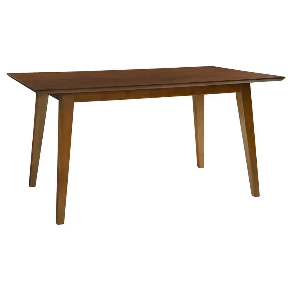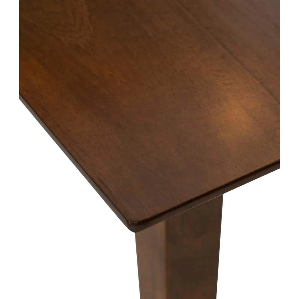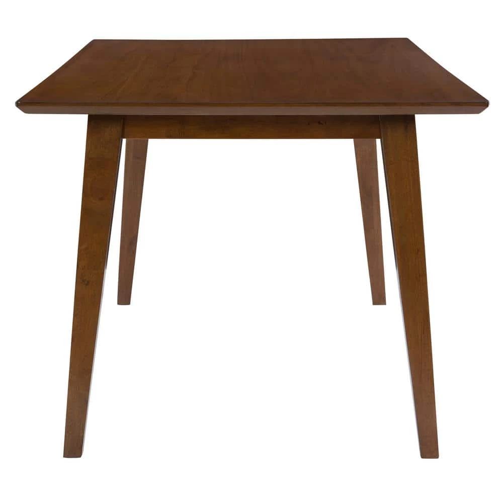 This elegant midcentury Marlene Brown Modern Dining Table is the perfect centerpiece for family gatherings and meals. The tapered legs and gentle reversed beveled edge of the tabletop join to create a sophisticated look, while also lending to functionality. Up to 6 can sit around the table comfortably and enjoy generous legroom. The beautiful rubberwood veneer can also be paired with a matching bench and 4-chairs, each with seats hand woven with rope in a intricate basket weave pattern.
