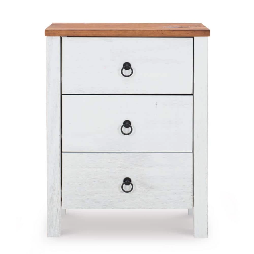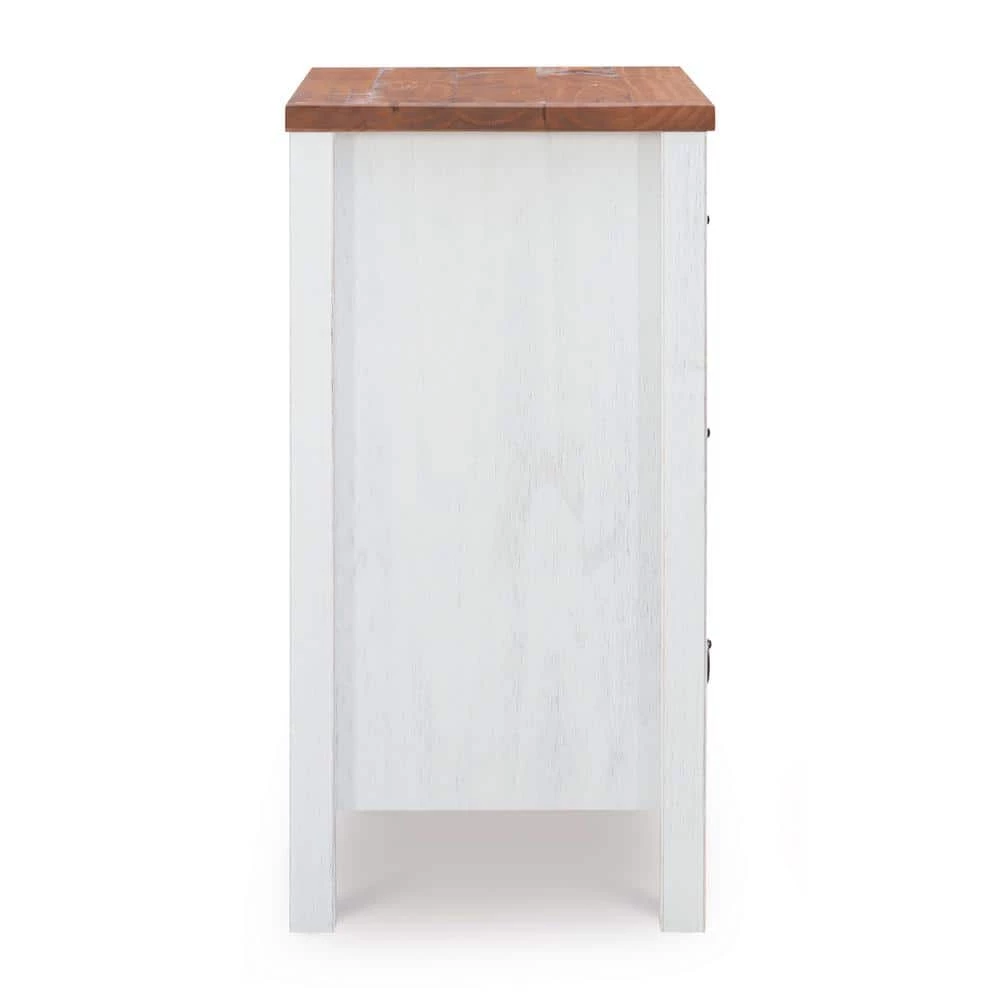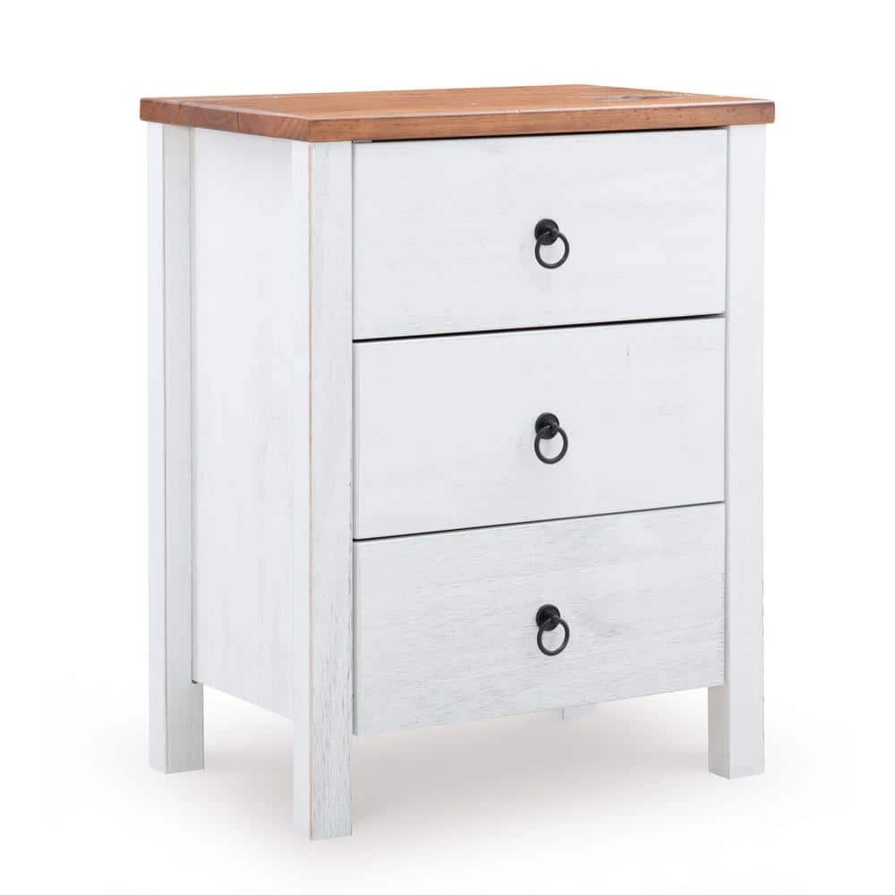 Refresh your bedroom with this classic three-drawer chest featuring clean lines and a two-tone finish. Constructed of solid Elliotis Pine, this durable chest brightens any room with the contrast created between the distressed white and rustic oak finishes. Add this piece to your existing set or pair it with the matching headboard and storage pieces to create a bedroom set that meets your needs in charming, farmhouse style.
