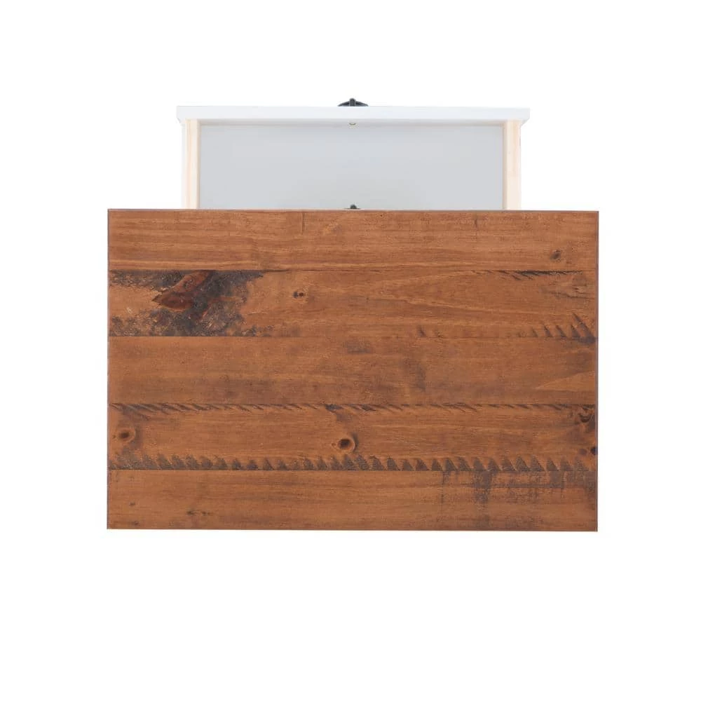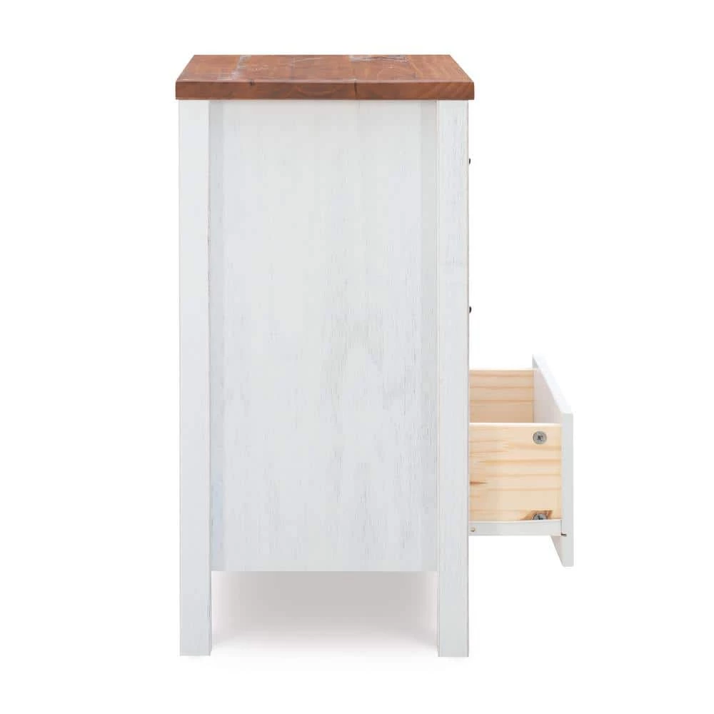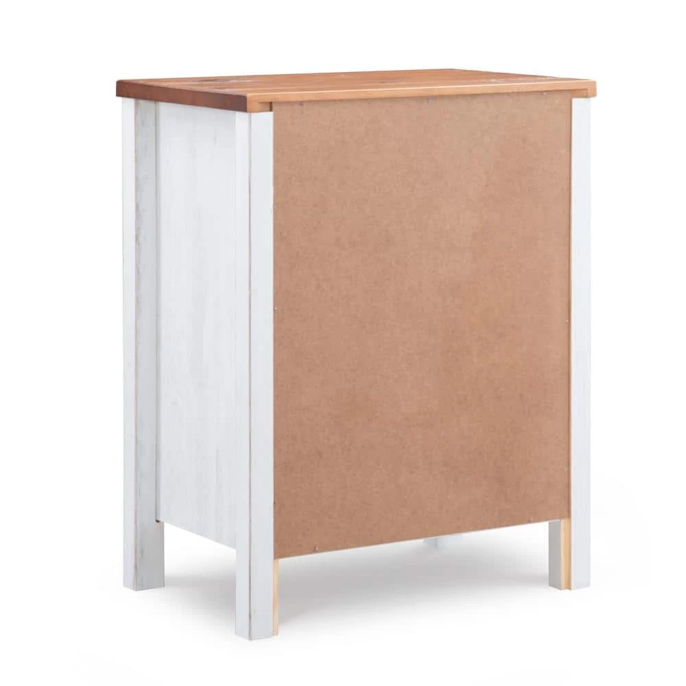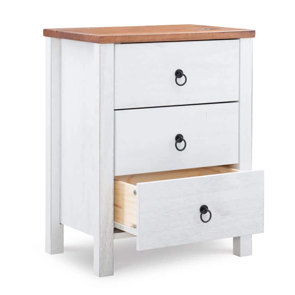 Refresh your bedroom with this classic three-drawer chest featuring clean lines and a two-tone finish. Constructed of solid Elliotis Pine, this durable chest brightens any room with the contrast created between the distressed white and rustic oak finishes. Add this piece to your existing set or pair it with the matching headboard and storage pieces to create a bedroom set that meets your needs in charming, farmhouse style.