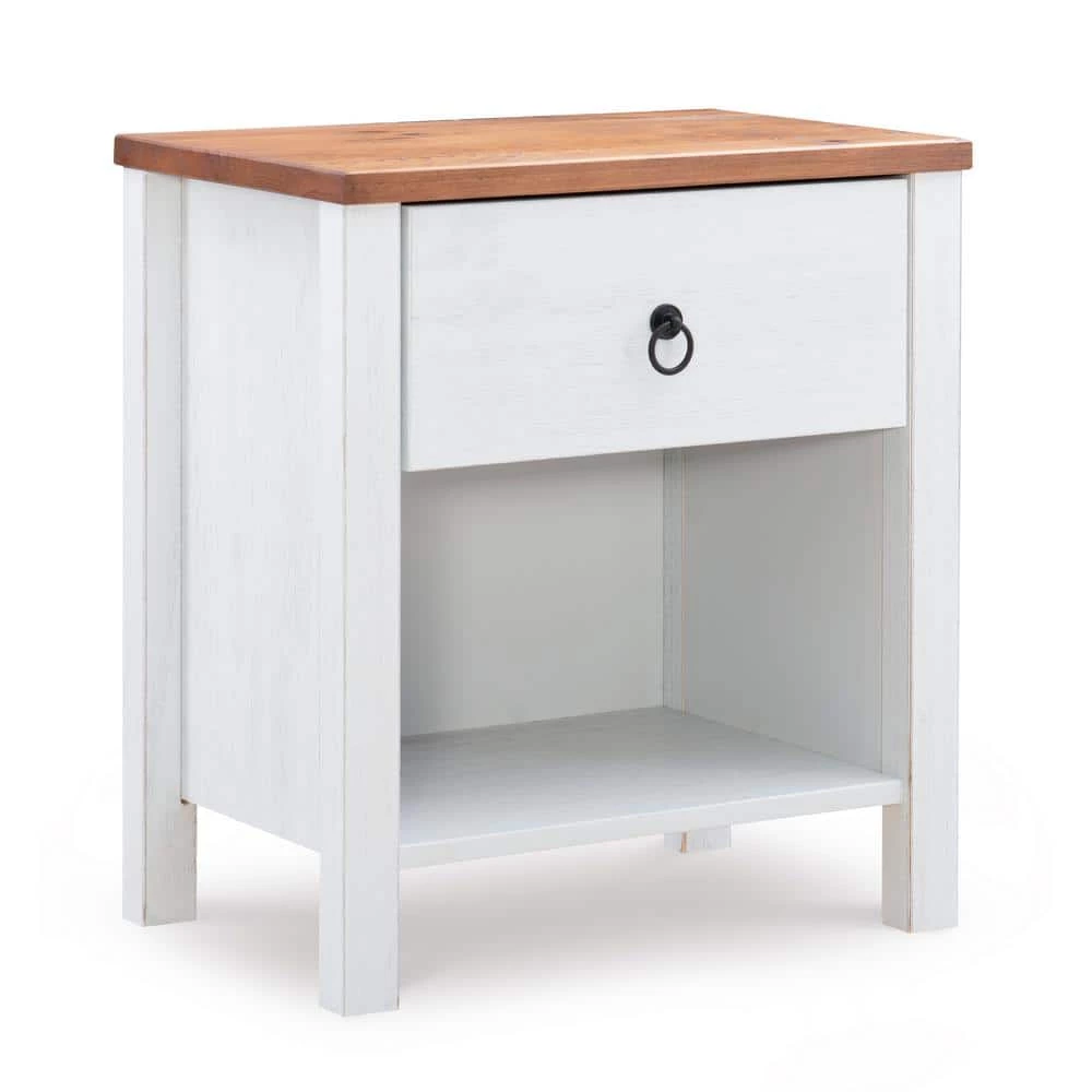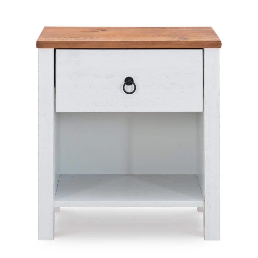 Refresh your bedroom with this classic nightstand featuring clean lines and a two-tone finish. Constructed of solid Elliotis Pine, this durable nightstand brightens any room with the contrast created between the distressed white and rustic oak finishes. Add this piece to your existing set or pair it with the matching headboard and storage pieces to create a bedroom set that meets your needs in charming, farmhouse style.