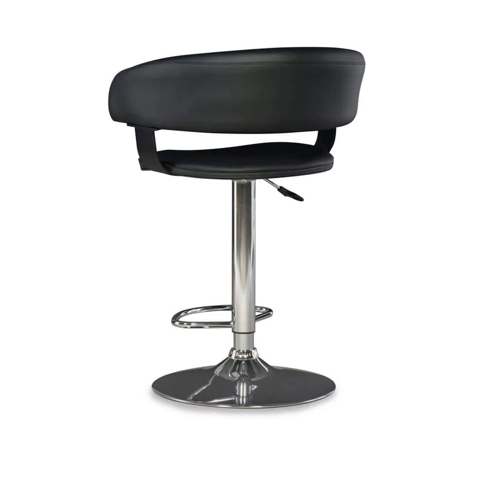 - Cushioned seats and rounded barrel backs are upholstered in black faux leather for comfort and easy cleaning
