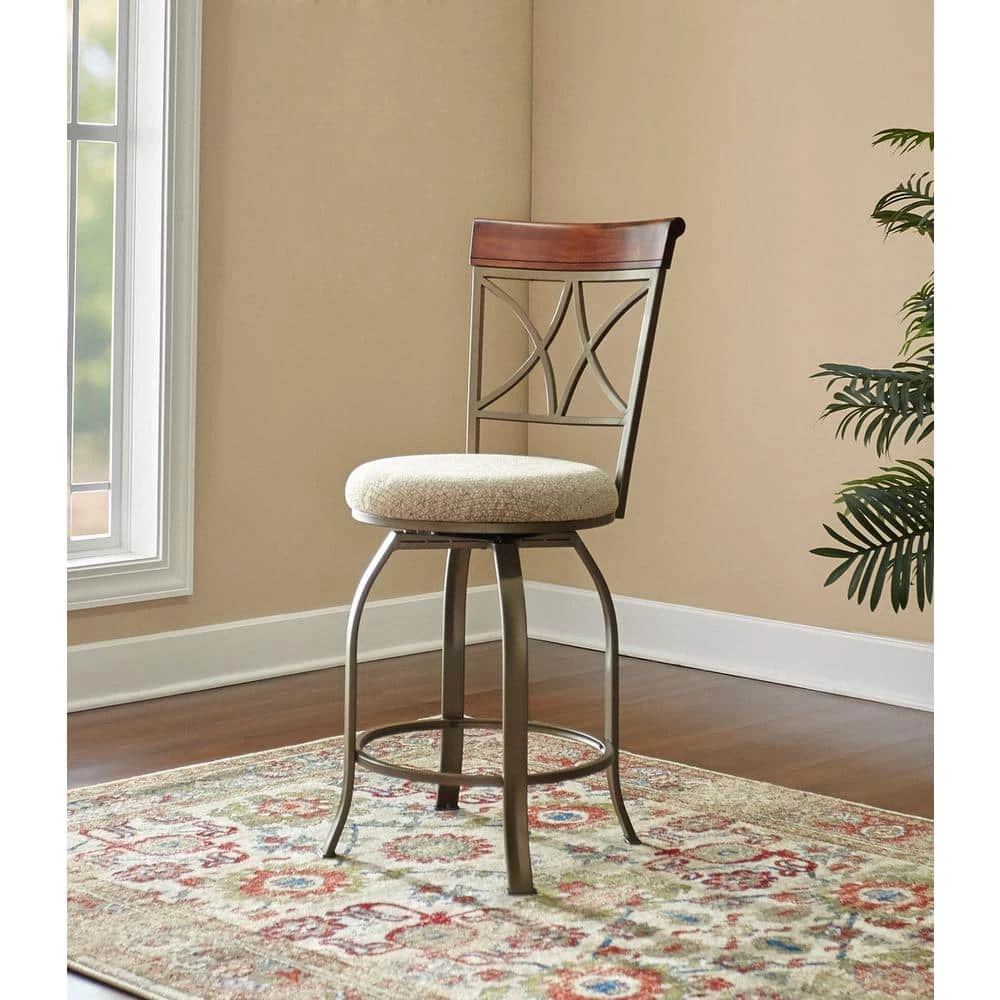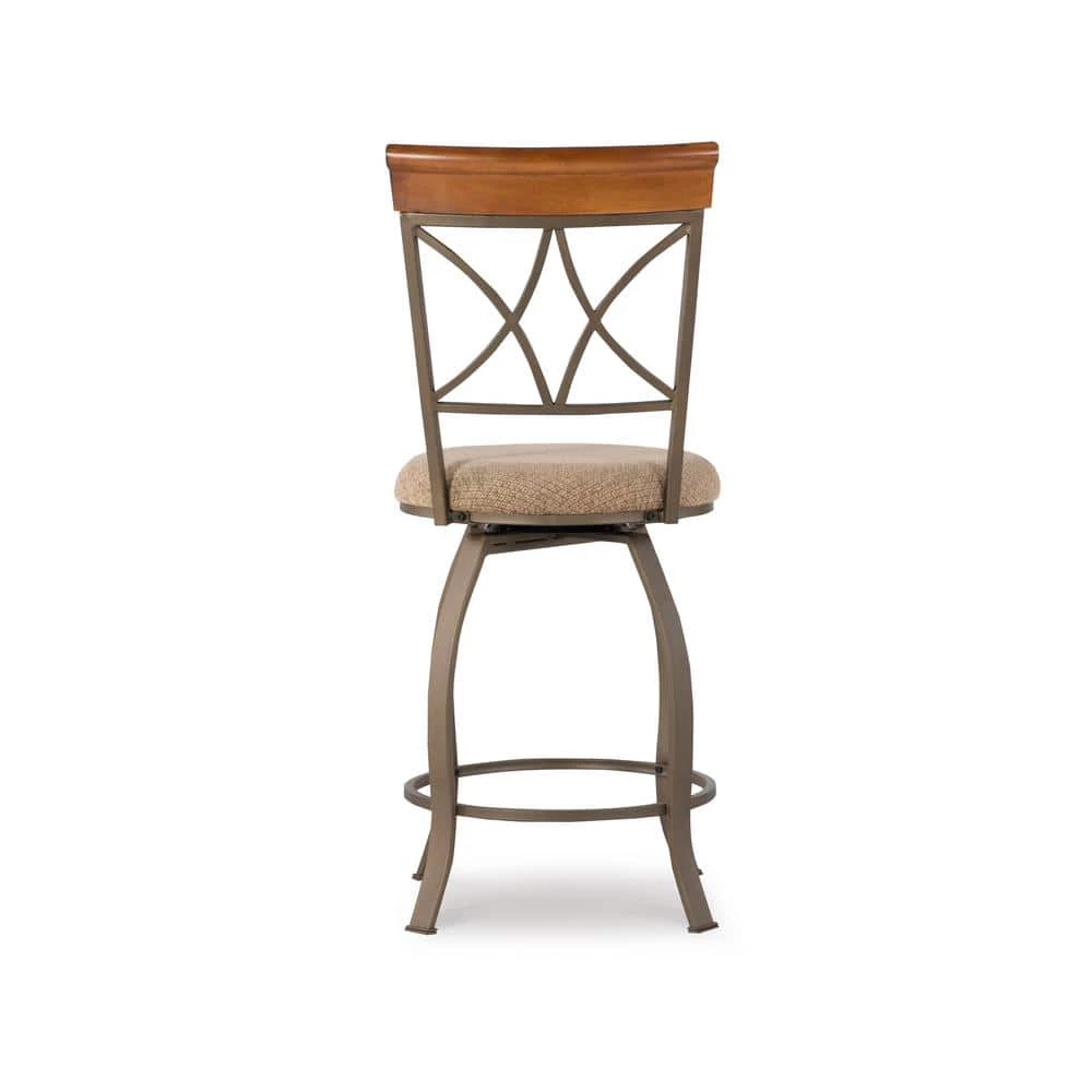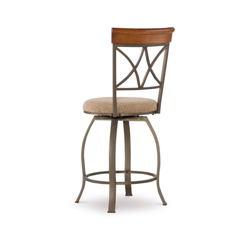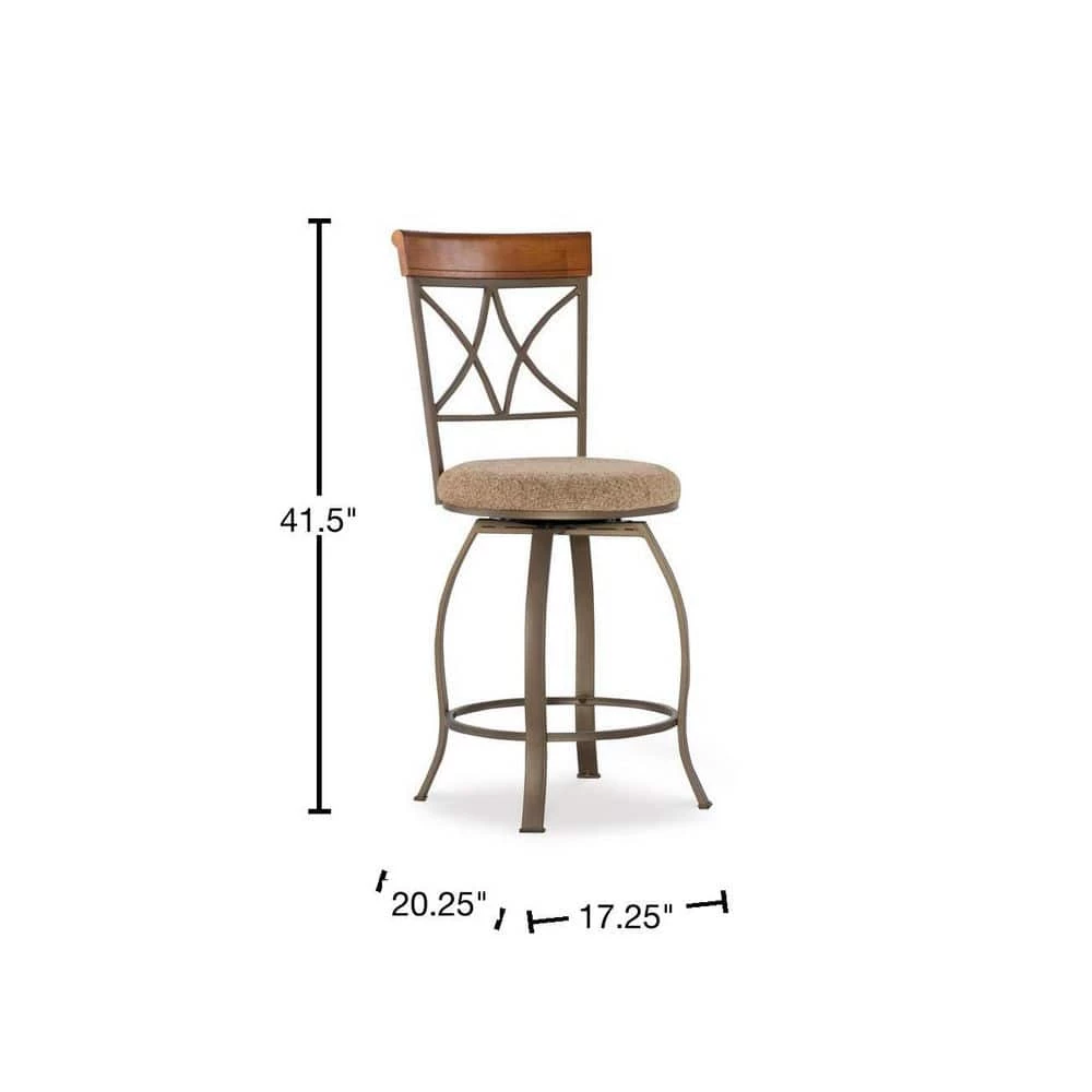 The Masson Swivel Counter Stool features a diamond shaped back and slight curved legs. The top of the back piece is a sleek “Brushed Faux Medium Cherry” wood, while the frame is a “Matte Pewter and Bronze” metal. This piece is sure to add interest and extra seating to your table. Some assembly required.