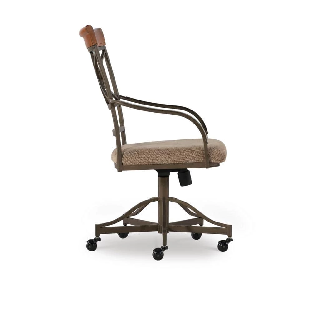 Transitional 5-Piece Masson 5PC Dining Set is perfect for gatherings. The round dining table features an interesting curve and scroll designed bottom. The swivel-tilt chairs feature a diamond shaped back, gracefully curved arm rests, upholstered seat covered in a diamond patterned taupe/beige microfiber, and legs on rolling casters providing easy mobility. Finished in “Brushed Faux Medium Cherry” wood with “Matte Pewter and Bronze” metal. Some assembly required.