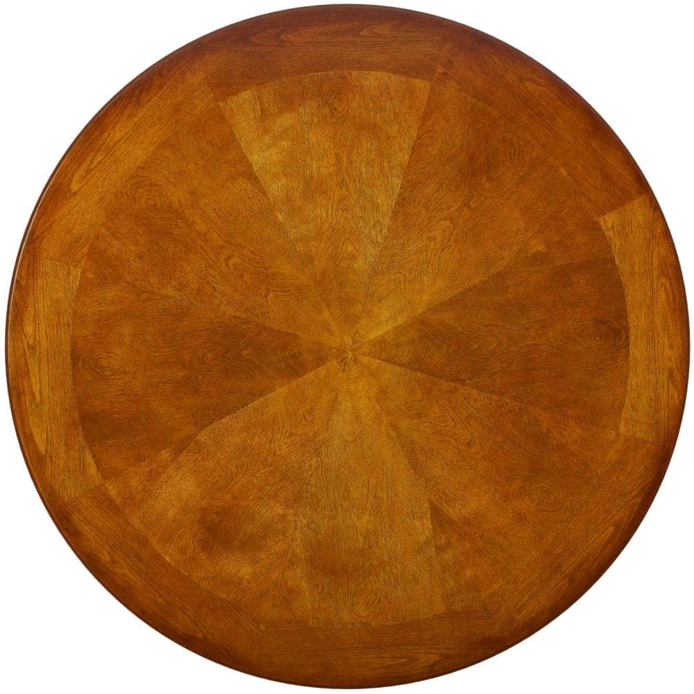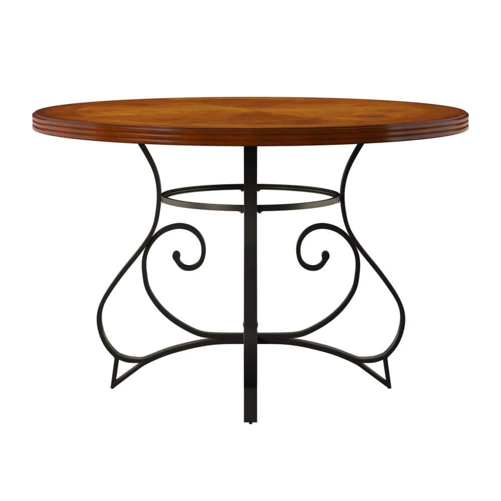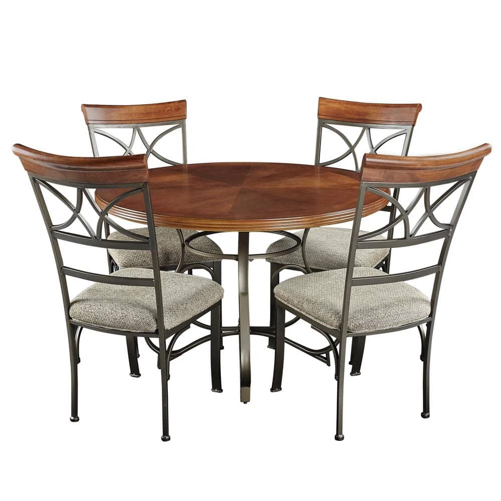 Transitional Masson 5- piece dining set is perfect for gatherings. The round dining table features an interesting curve and scroll designed bottom. The side chairs feature a diamond shaped back, slight curved legs, and upholstered seat covered in a diamond patterned taupe/beige microfiber. Finished in “Brushed Faux Medium Cherry” wood with “Matte Pewter and Bronze” metal. Some assembly required.