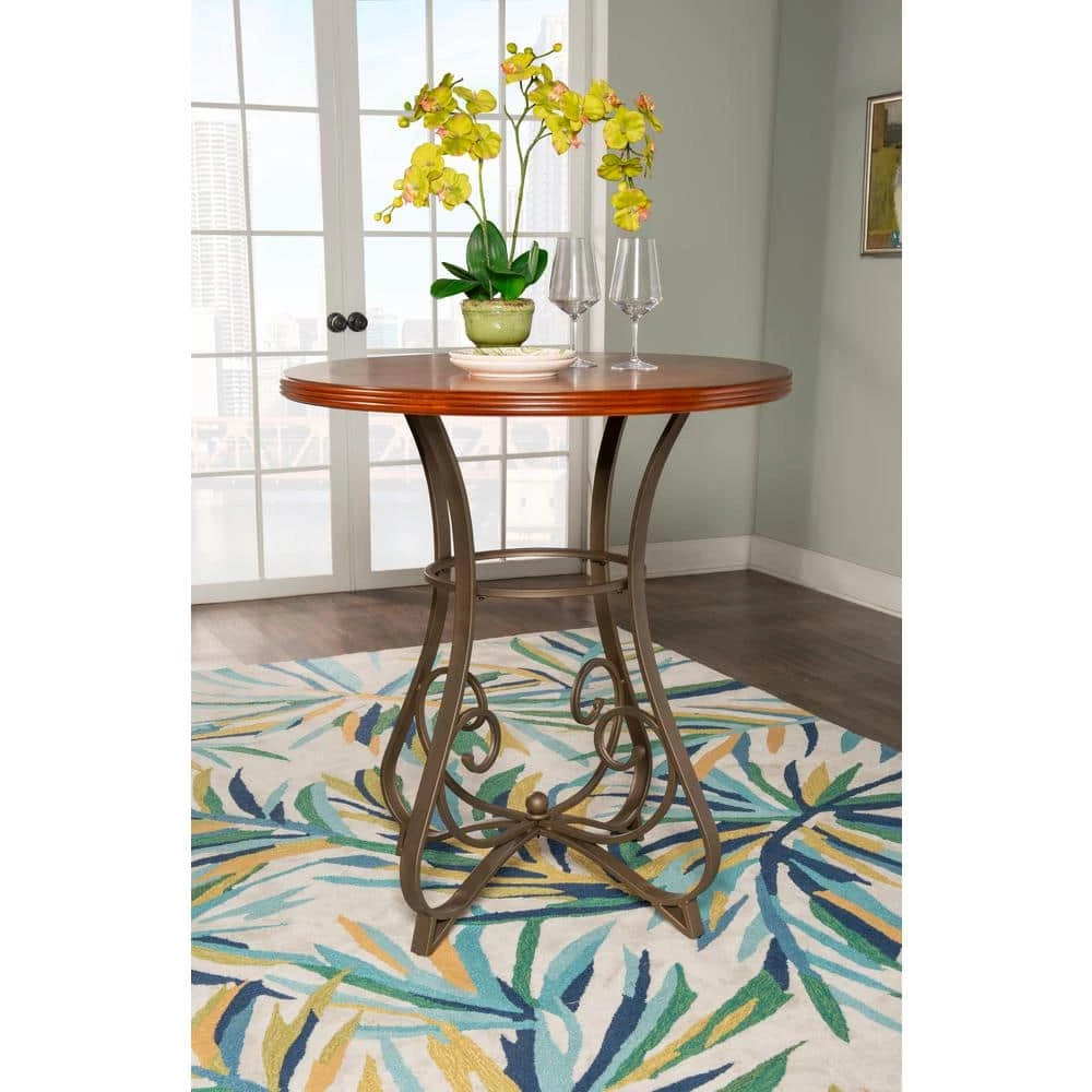 The Masson Pub Table features an interesting curve and scroll designed bottom. The top is a sleek “Brushed Faux Medium Cherry” wood, while the bottom is a “Matte Pewter and Bronze” metal. This piece is sure to add interest and ample table space to any home decor. Some assembly required.