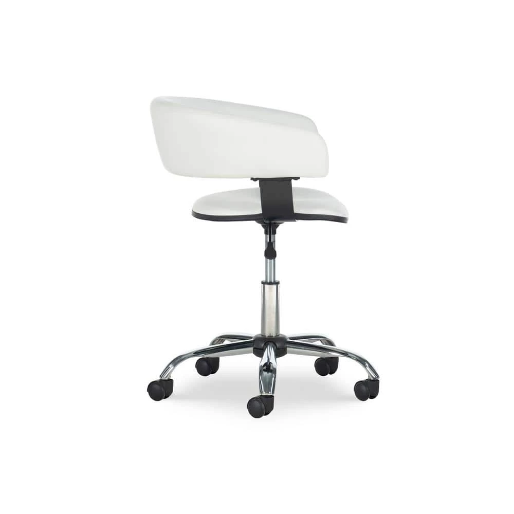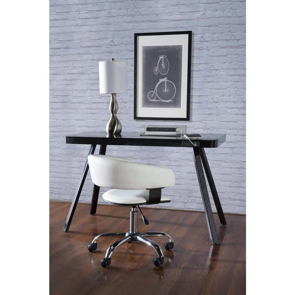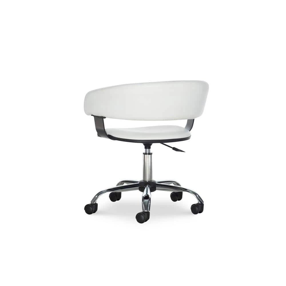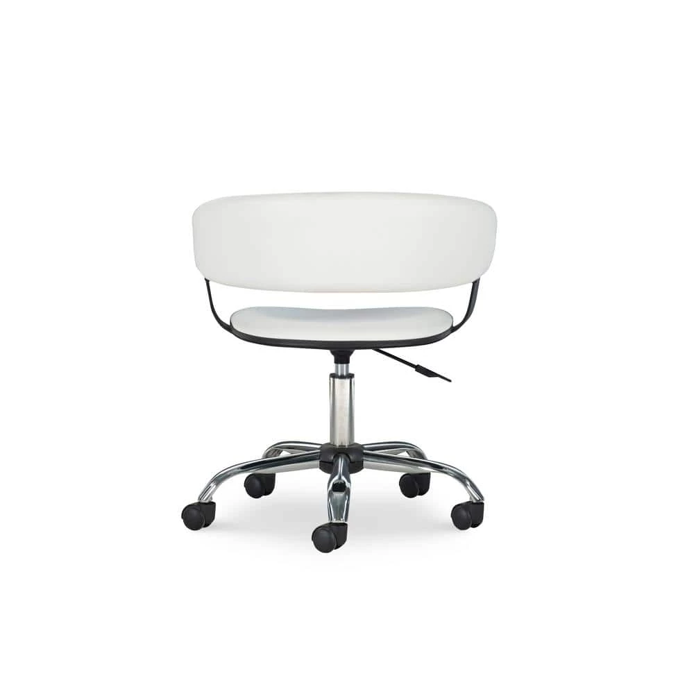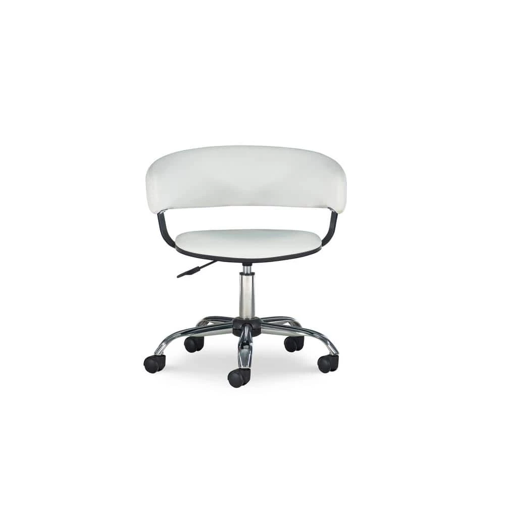 The Minden White Desk Chair is all about style and comfort. A luxurious plush swivel seat is upholstered in a rich white faux leather, while a curved seat back provides added comfort. The gas lift gives easy positioning options and the casters provide mobility. Finished with a versatile chrome, this piece is an easy addition to any office or bedroom.