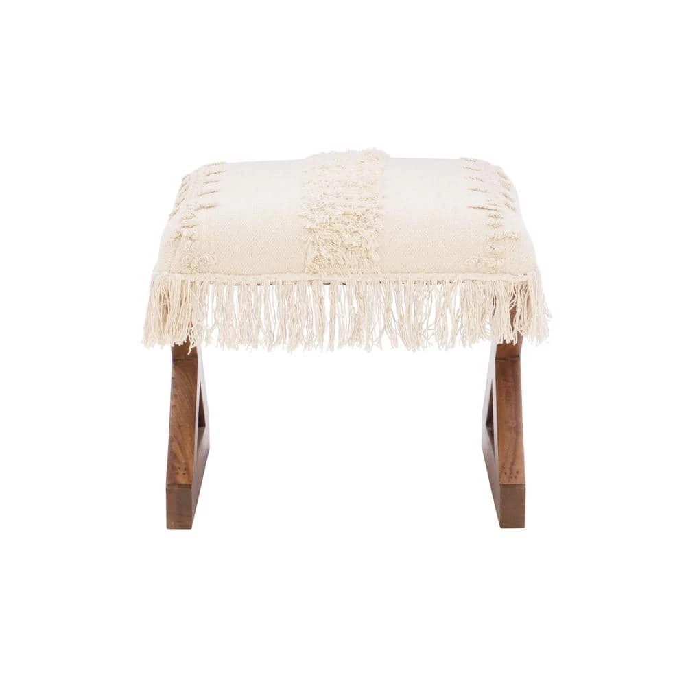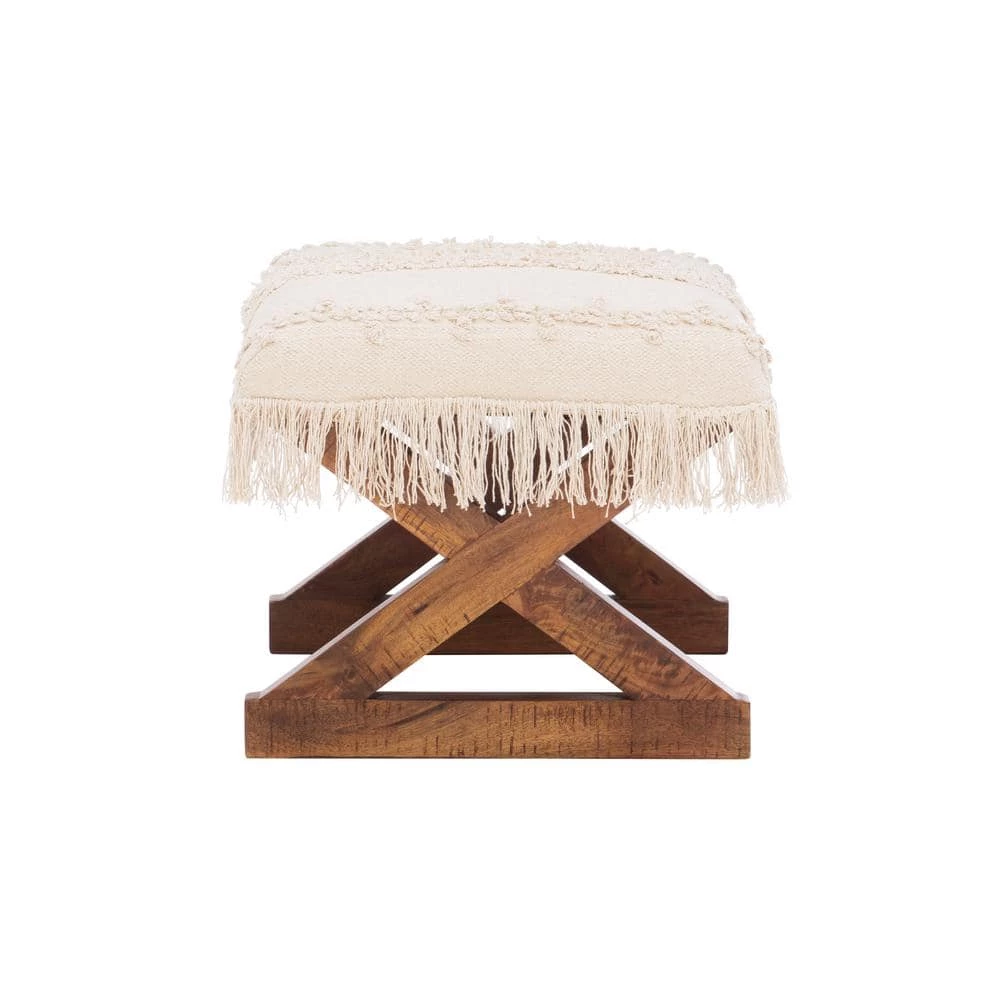 Put your feet up on this Nia Off White Tassel Ottoman with Brown Wood Base. Perfect for extra seating when entertaining or as a multipurpose place to fold laundry, sit with your TV dinner or put a book down. Sturdy construction supports up to 200 lbs.. and beautifully embroidered cushion adds touch of elegance and sophistication to living room, den or sitting area. Rich wood grain finish brings warmth to home decor. Lightweight design comes fully assembled.
