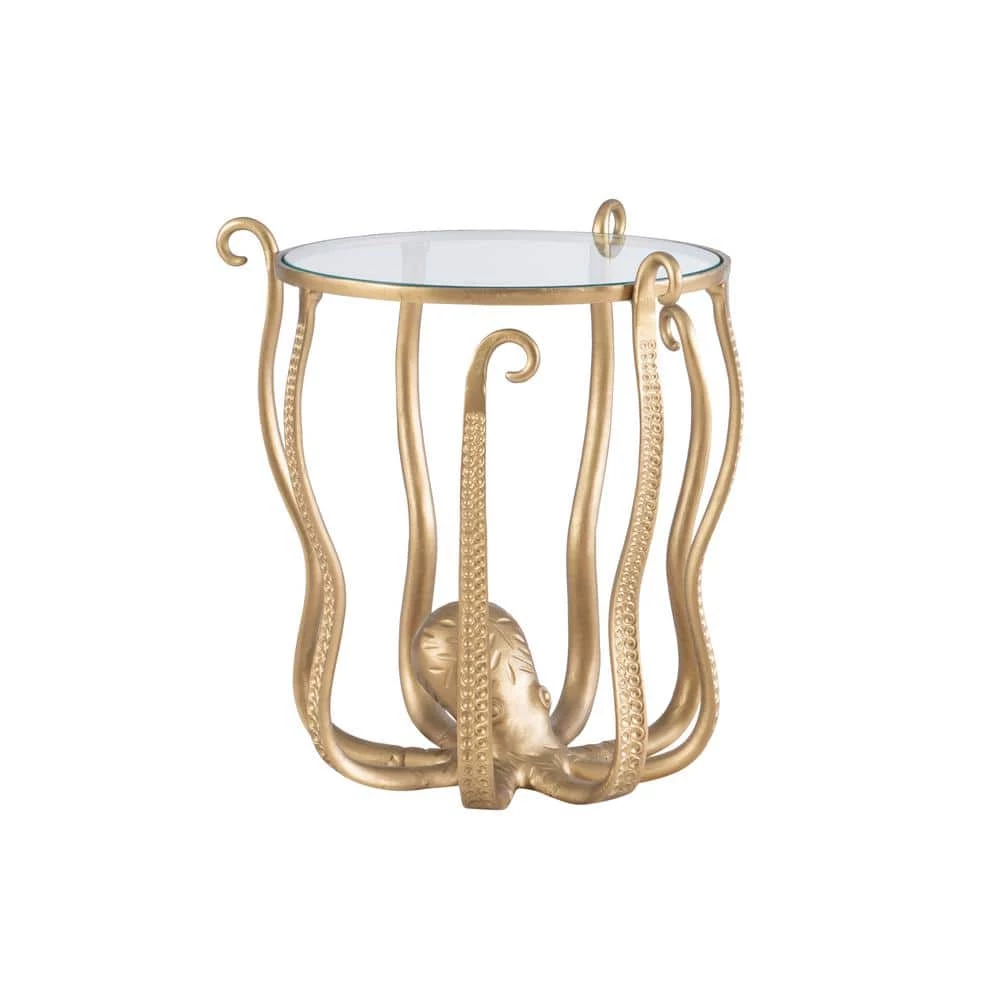 Bring the mystery of the ocean home with this stunning Olivia 20 in. Gold 22 in. H Round Glass End Table with Octopus Base. Beach house or suburban home, the modern design adds an alluring nautical accent to your decor. Use as an end table in your living room or a unique display piece in your home office. The solid glass top will enhance the visuals from every side. With high quality aluminum construction, this table can also be easily used outdoors as patio furniture. A tribute to nature’s incredible design, the octopus table will be a captivating addition wherever you place it.