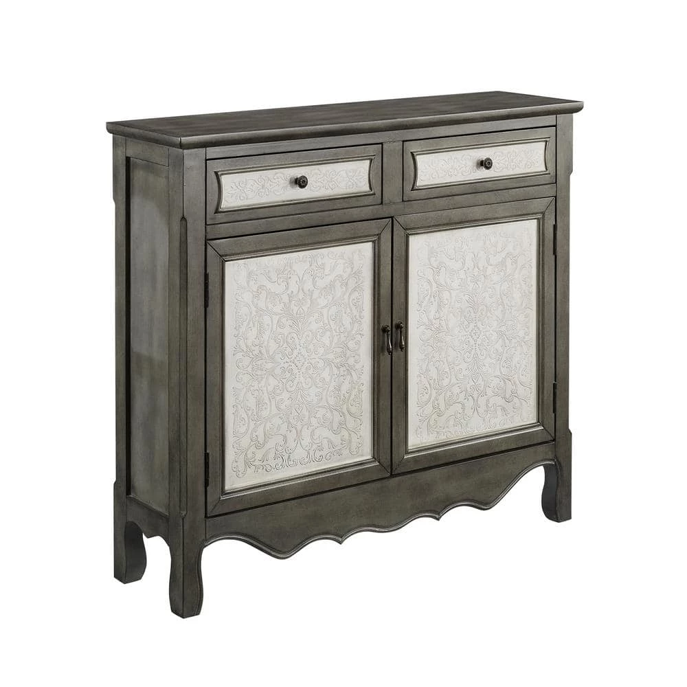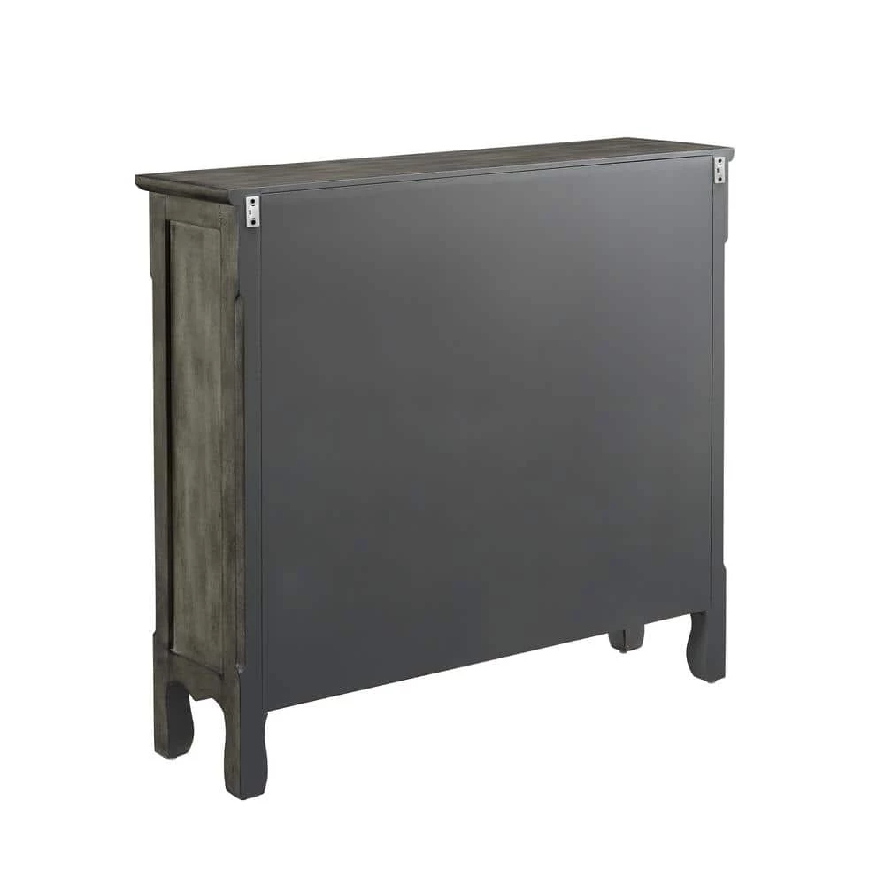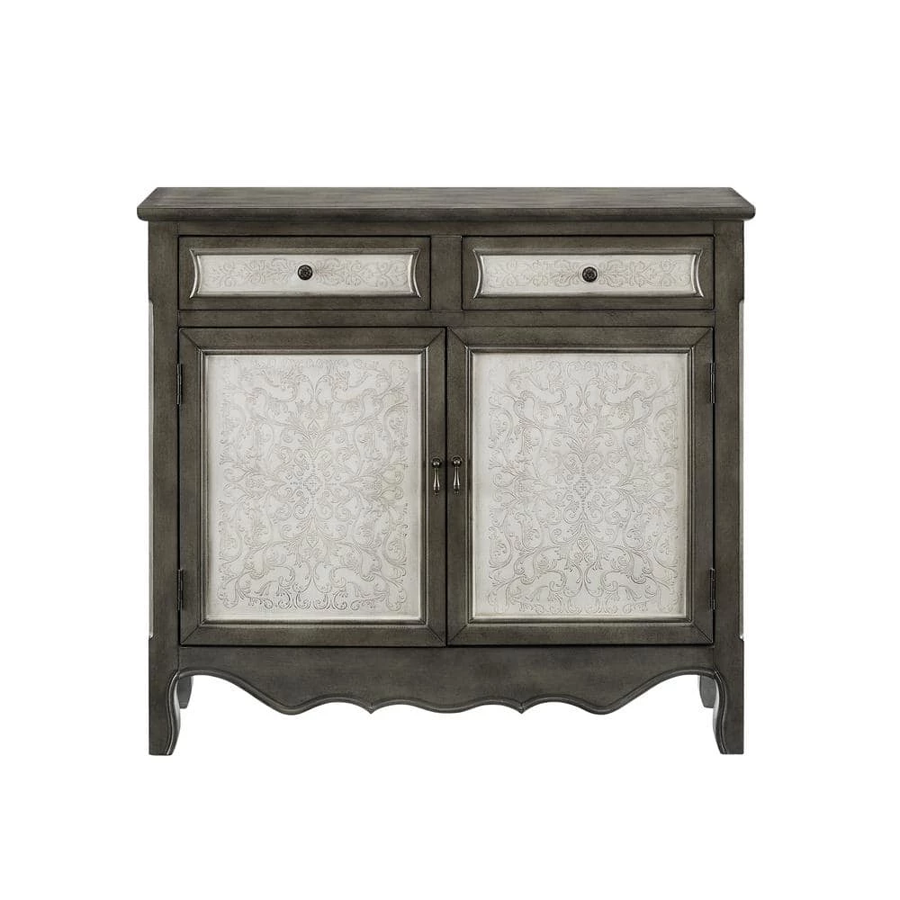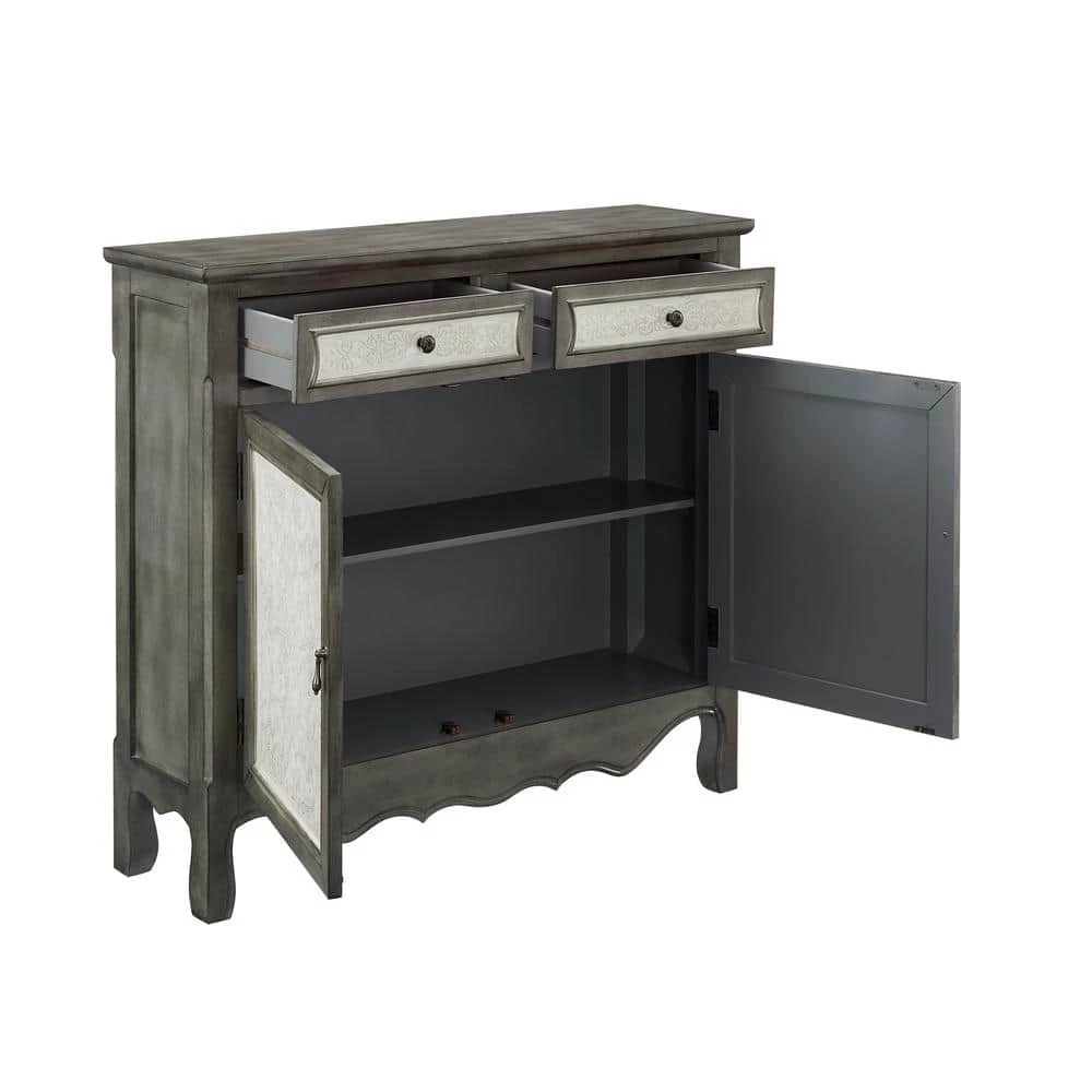 This Paradise 40 in. W Grey 36 in. H Rectangular Wood Console Cabinet with 2-Drawers and Hidden Shelf adds sophistication and class to any room. The decorative curved bottom gives an extra touch of drama to the piece, and white panels with a raised decorative pattern adorn the front. 2-drawers offer space to hide away accessories or keepsakes. The console opens with two doors to reveal storage space with a fixed shelf. This is the perfect piece to add to any entryway, hall, or living area.